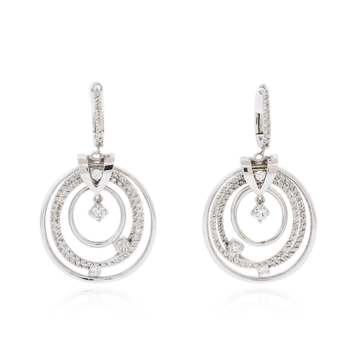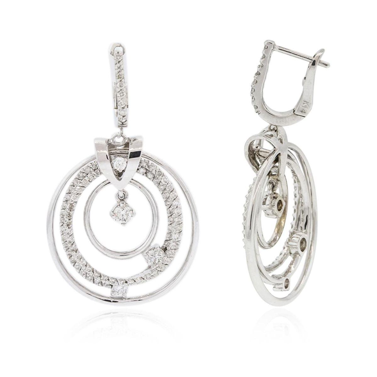 One pair electronically tested 14KT white gold ladies combination cast & assembled dangle earrings with hinged clip backs with a bright polish finish. Identified with markings of "14K". Condition is new. Containing: Six prong set round brilliant cut diamonds, measuring 3.00 - 2.50 x 1.65mm (depth est.) approximate total weight of 6 Stones = 0.46ct. Clarity: SI-1 to SI-2. Color: H - I, Cut is Good. One Hundred Sixty prong set round brilliant cut diamonds, measuring 1.30 - 1.30 x 0.78mm (depth est.) approximate total weight of 160 Stones = 1.28ct. Clarity: SI-2 to I-2. Color: H - I, Cut is Good. All diamonds are graded in the mounting, unless otherwise stated. Total Weight of Diamonds 1.74ct. Total Weight of Earrings 11.10 grams. GGL Appraised at $8,820.00.