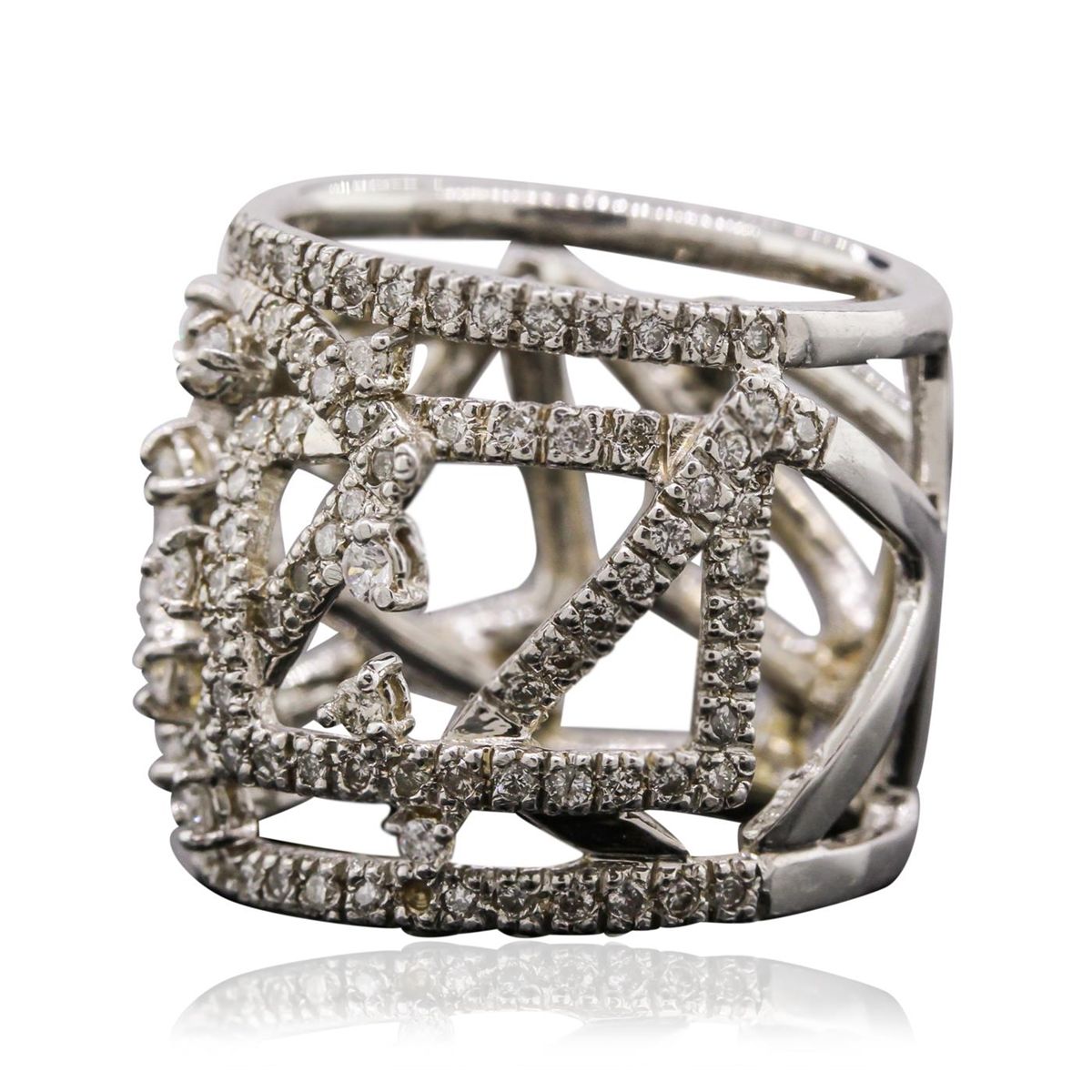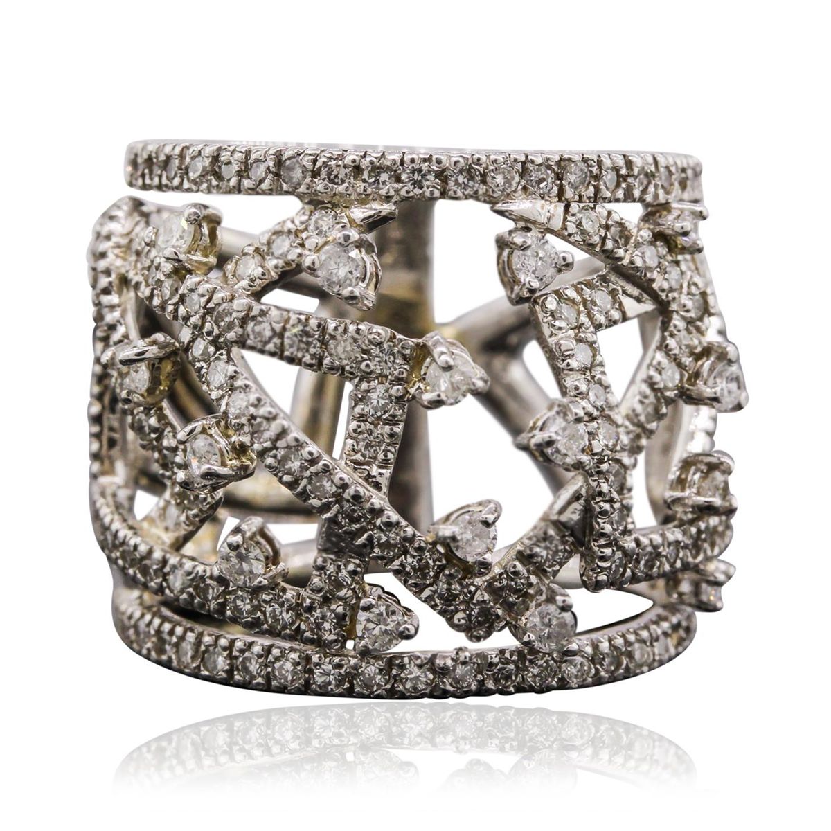 One electronically tested 14KT white gold ladies cast diamond ring with a bright polish finish. Condition is good. The ring features a nineteen millimeter wide intertwining geometric diamond set design, tapering to a seventeen millimeter wide band. Identified with markings of "585". Containing: Fifteen prong set round brilliant cut diamonds, measuring 1.90 - 1.80 x 1.11mm (depth est.) approximate. Total Weight of 15 Stones = 0.45ct. Graded in the setting. Clarity: SI-2 to I-1 . Color: G - I One Hundred Sixty-Eight prong set round brilliant cut diamonds, measuring 1.30 - 1.20 x 0.75mm (depth est.) approximate. Total Weight of 168 Stones = 1.29ct. Graded in the setting. Clarity: SI-1 to I-1 . Color: G - I. Total Weight of Diamonds 1.74ct.. Total Weight of Ring 10.44 grams. AIG Appraised at $7,915.00.