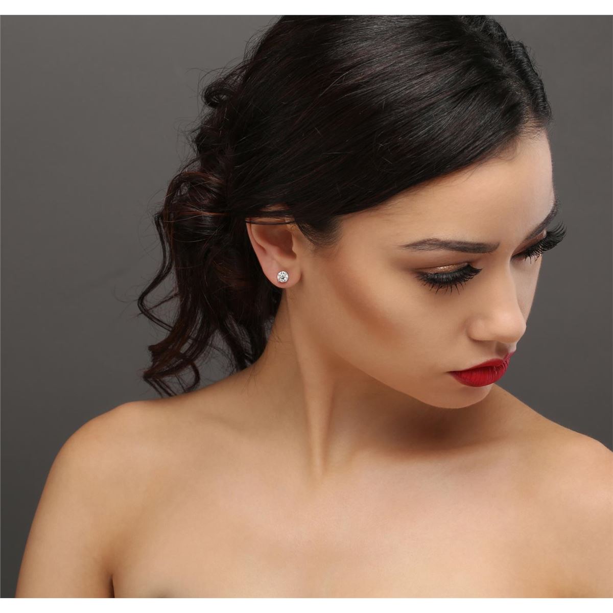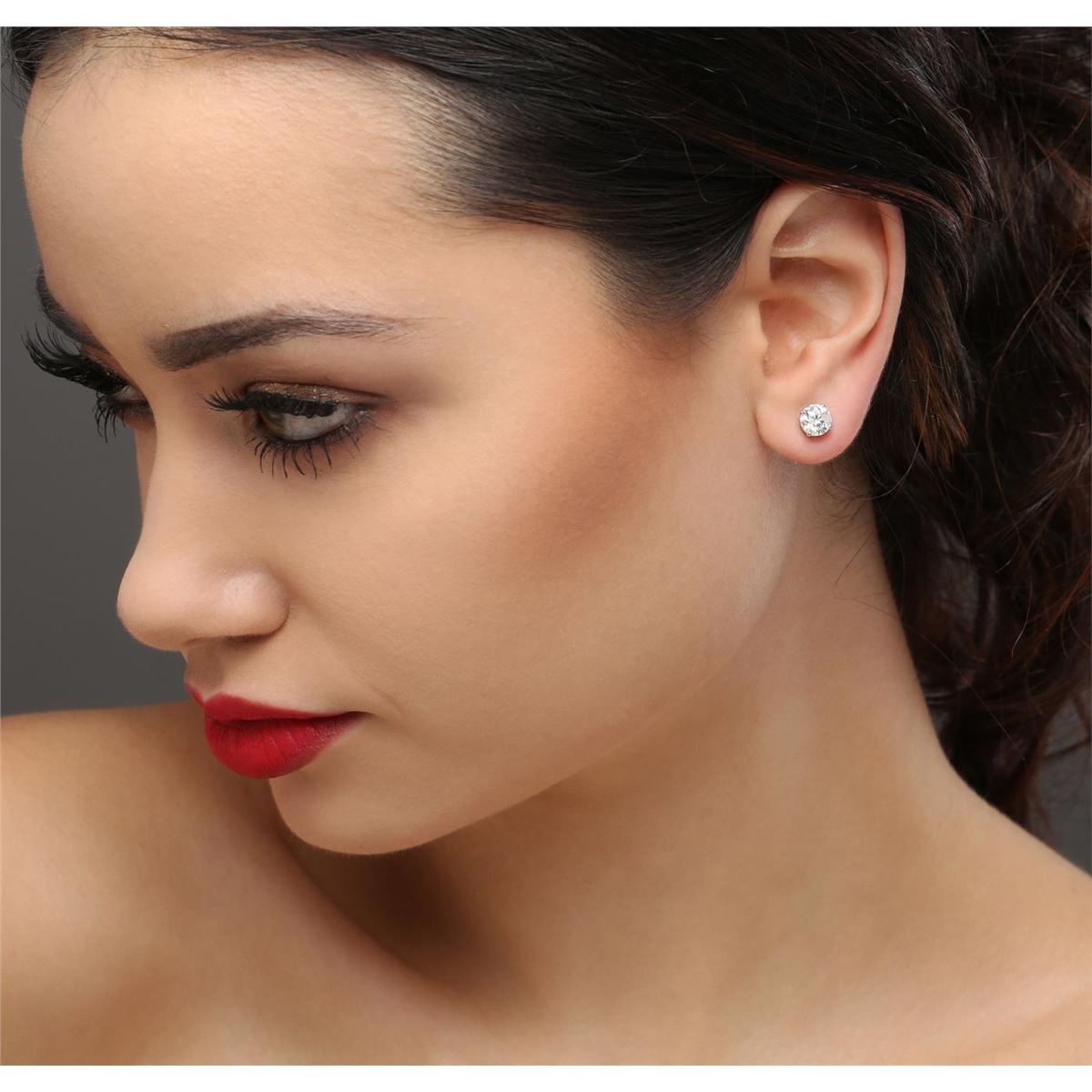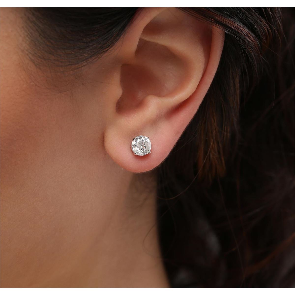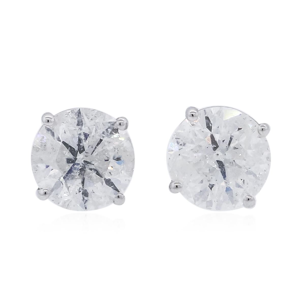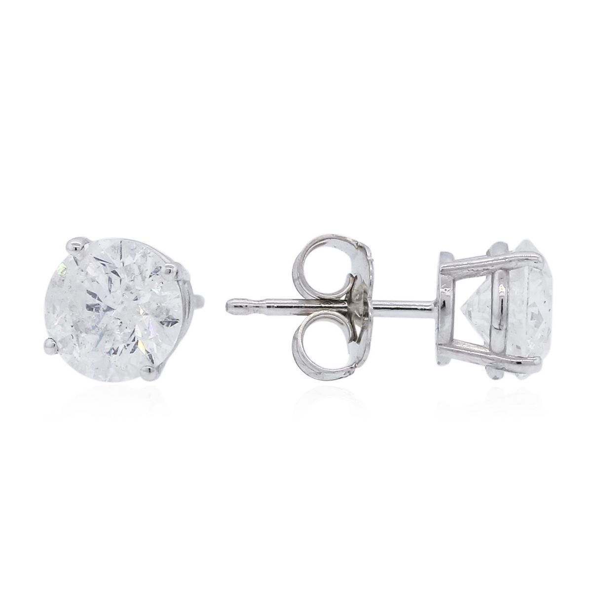 One pair electronically tested 14KT white gold ladies cast diamond stud earrings with friction posts with a bright polish finish. Identified with markings of "14K". Condition is new. Containing: One prong set round brilliant cut diamond, measuring 6.20 - 6.20 x 3.72mm (depth est.) approximate weight of 0.87ct. Clarity: I-2. Color: J, Cut is Good. One prong set round brilliant cut diamond, measuring 6.20 - 6.20 x 3.72mm (depth est.) approximate weight of 0.87ct. Clarity: I-2. Color: J, Cut is Good. All diamonds are graded in the mounting, unless otherwise stated. Total Weight of Diamonds 1.74ct. Total Weight of Earrings 1.20 grams. GGL Appraised at $6,045.00.