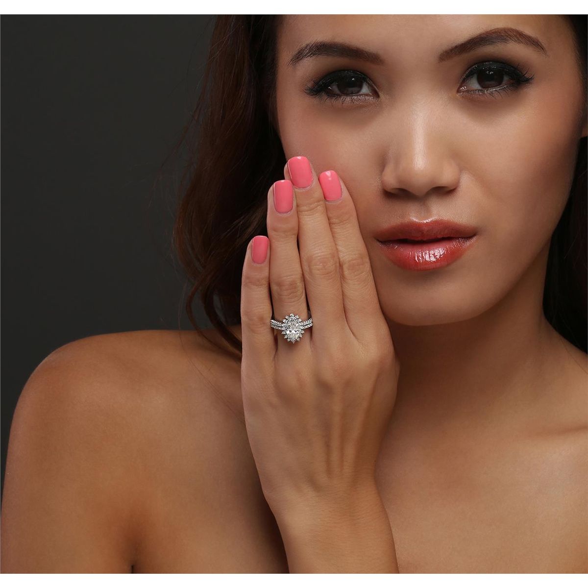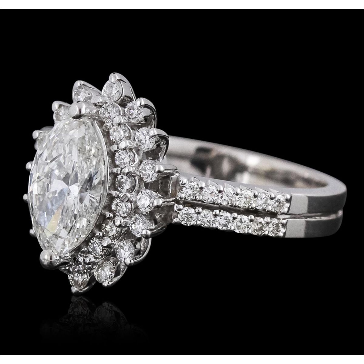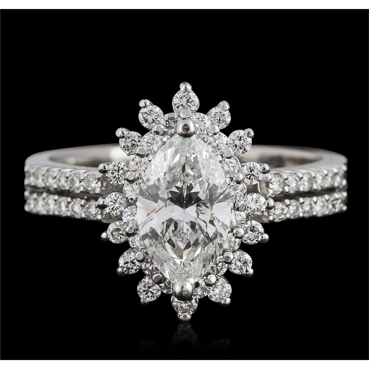 One electronically tested 14KT white gold ladies cast diamond unity ring with a bright polish finish. The featured diamond is set within a two tiered diamond bezel supported by diamond set split shoulders, completed by a three millimeter wide band. Identified with markings of "K14". Condition is new, good workmanship. Containing: One prong set marquise shaped cut diamond, measuring 9.50 x 5.70 x 3.50mm (depth est.) approximate weight of 1.20ct with a faint yellow fluorescence. Graded in the setting. Clarity: I-1. Color: I. Depth 61.4%. Table 59.7%. Fifty-Six prong set round brilliant cut diamonds, measuring 1.40 - 1.20 x 0.78mm (depth est.) approximate total weight of 56 Stones = 0.54ct. Graded in the setting. Clarity: VS-1 to SI-1. Color: G - I. Total Weight of Diamonds 1.74ct. Total Weight of Unity Ring 5.16 grams. AIG Appraised at $15,580.00.