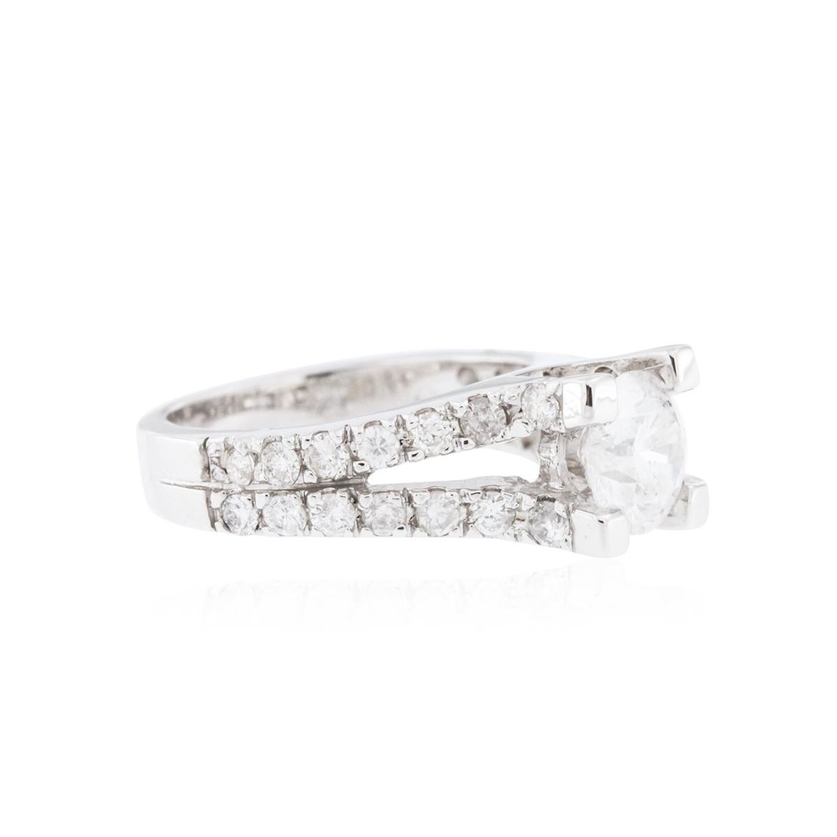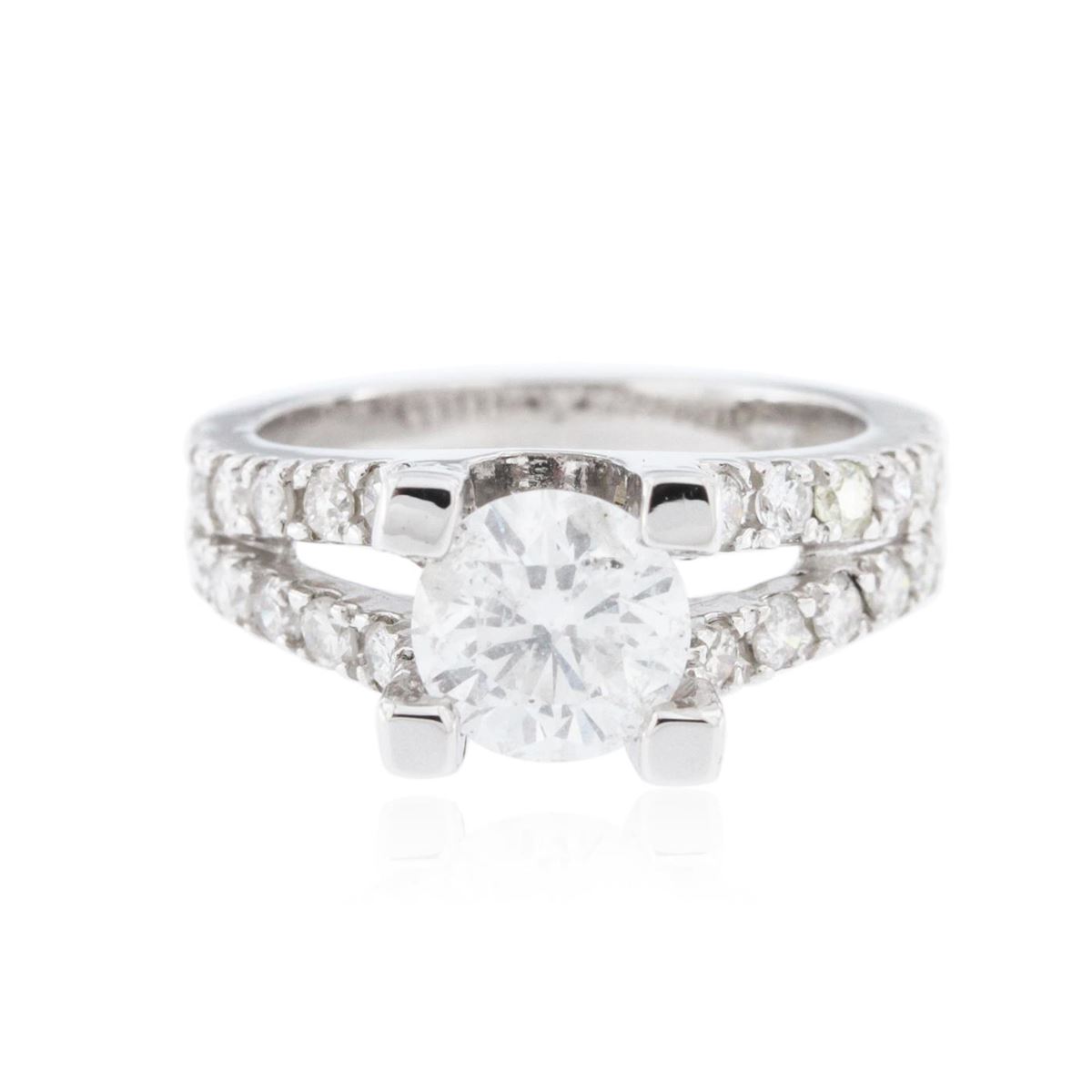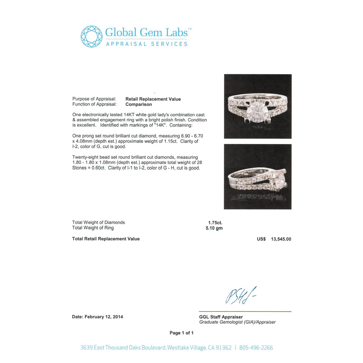 One electronically tested 14KT white gold Ladies combination cast & assembled engagement ring with a bright polish finish. Condition is excellent. Identified with markings of "14K". Containing: One prong set round brilliant cut diamond, measuring 6.90 - 6.70 x 4.08mm (depth est.) approximate weight of 1.15ct. Clarity of I-2, Color of G, Cut is Good. Twenty-Eight bead set round brilliant cut diamonds, measuring 1.80 - 1.80 x 1.08mm (depth est.) approximate total weight of 28 Stones = 0.60ct. Clarity of I-1 to I-2, Color of G - H, Cut is Good. Total Weight of Diamonds 1.75ct. Total Weight of Ring 5.10gm. GGL Appraised at $13,545.00.