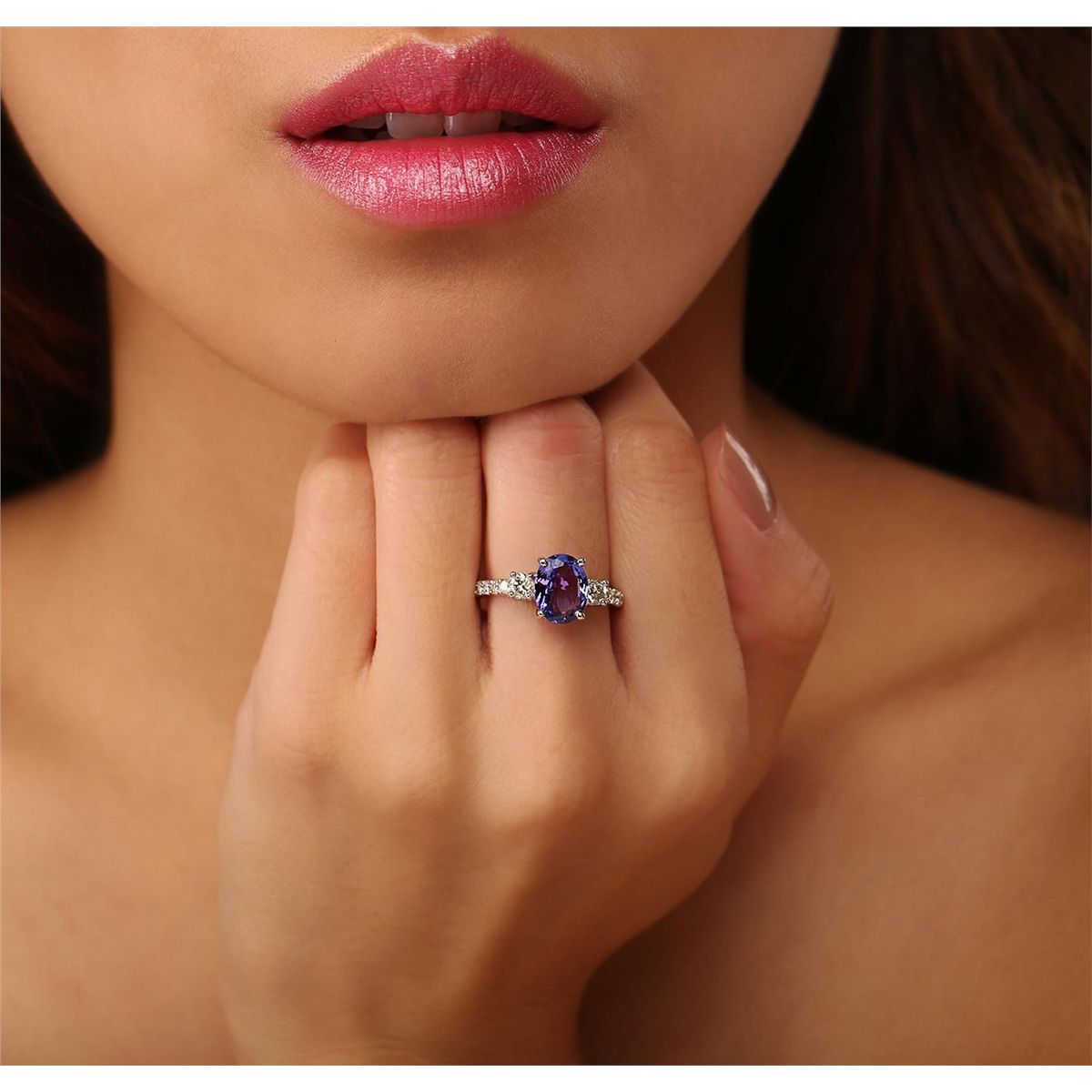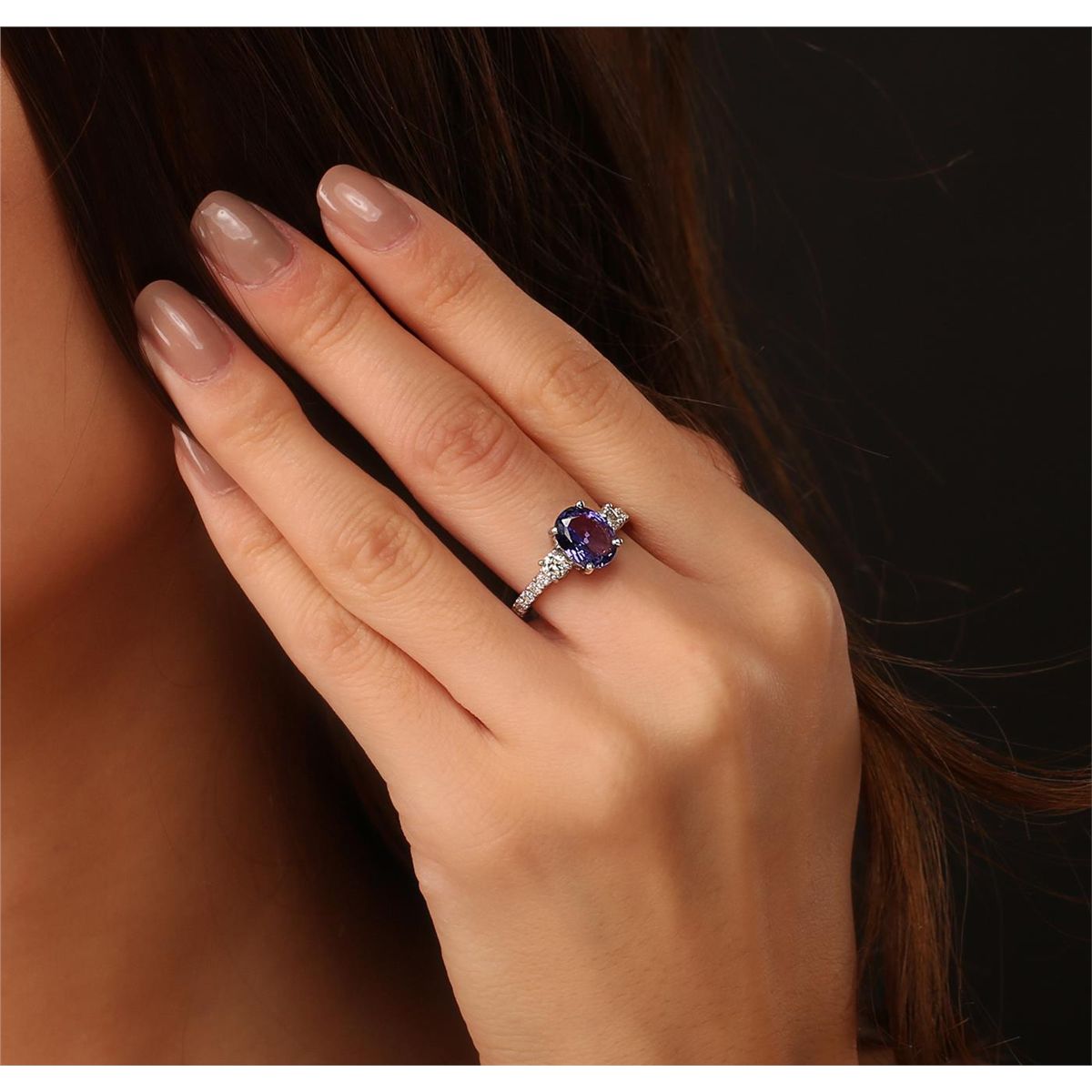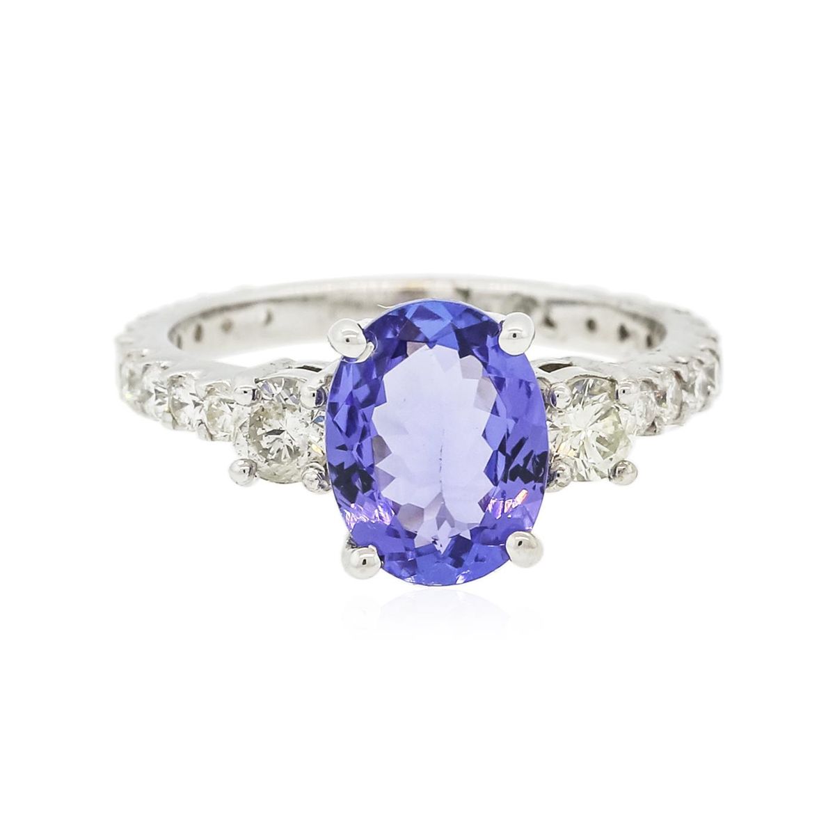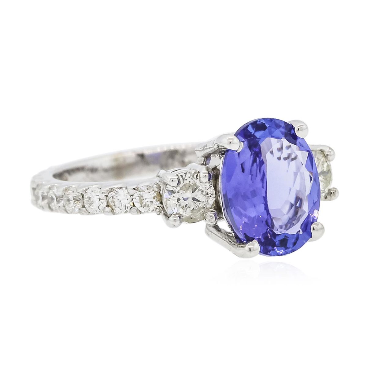 One electronically tested 14KT white gold ladies combination cast & assembled ring with a bright polish finish. Condition is new. Identified with markings of "14K". Containing: One prong set oval modified brilliant cut natural tanzanite, measuring 9.50 x 7.30 x 3.70mm, approximate weight of 1.75ct., clarity is eye clean, type I, medium, moderately strong, bluish violet color, (GIA bV 5/4), cut is good. Twenty prong set round brilliant cut diamonds, measuring 1.80 - 1.80 x 1.08mm (depth est.) approximate total weight of 20 Stones = 0.43ct. Clarity: I-1 to I-2. Color: J - K, Cut is Good. Two prong set round brilliant cut diamonds, measuring 3.80 - 3.80 x 2.28mm (depth est.) approximate total weight of 2 Stones = 0.40ct. Clarity: SI-2 to I-1. Color: J - K, Cut is Good. Colored gemstones are presumed to have been subjected to commonly used enhancement processes. All diamonds and colored gemstones are graded in the mounting, unless otherwise stated. Total Weight of Colored Stones 1.75ct. Total Weight of Diamonds 0.83ct. Total Weight of Ring 3.80 grams. GGL Appraised at $5,410.00.