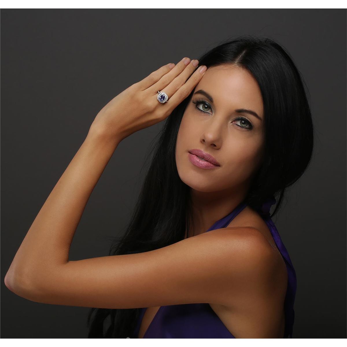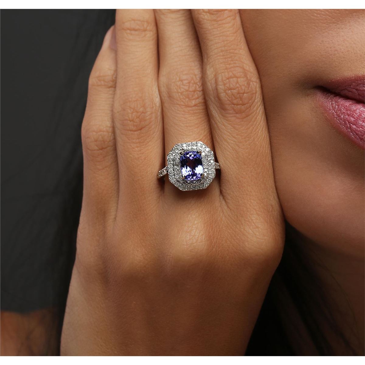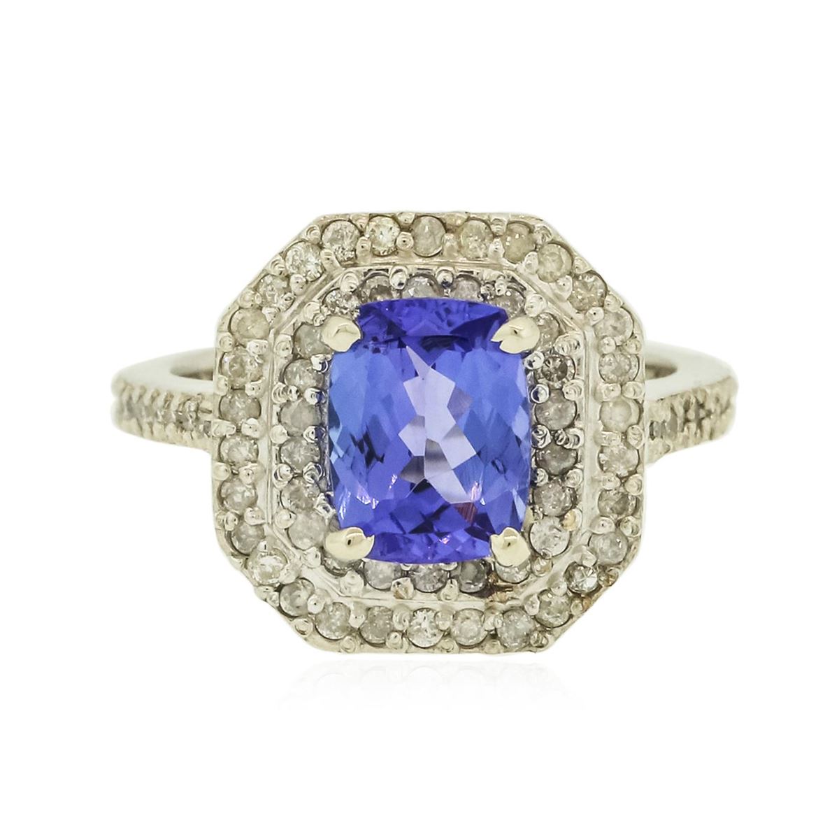 One electronically tested 14KT white gold ladies combination cast & assembled tanzanite and diamond ring with a flat shank with a bright polish finish. Identified with markings of "14K". Condition is new. Containing: One prong set rectangular cushion modified brilliant cut natural tanzanite, measuring 8.45 x 6.36 x 4.13mm, approximate weight of 1.75ct., clarity is eye clean, type I, medium light, moderately strong, violet color, (GIA V 4/4), cut is good. Ninety prong set round brilliant cut diamonds, measuring 1.20 - 1.20 x 0.72mm (depth est.) approximate total weight of 90 Stones = 0.57ct. Clarity: I-1 to I-2. Color: I - J, Cut is Good. Colored gemstones are presumed to have been subjected to commonly used enhancement processes. All diamonds and colored gemstones are graded in the mounting, unless otherwise stated. Total Weight of Colored Stones 1.75ct. Total Weight of Diamonds 0.57ct. Total Weight of Ring 5.50 grams. GGL Appraised at $5,185.00.
