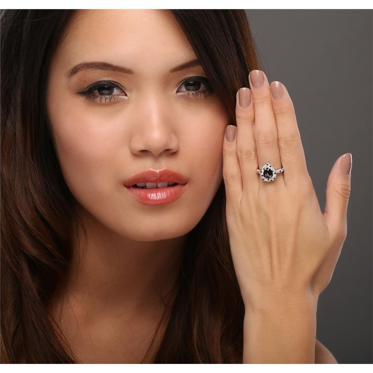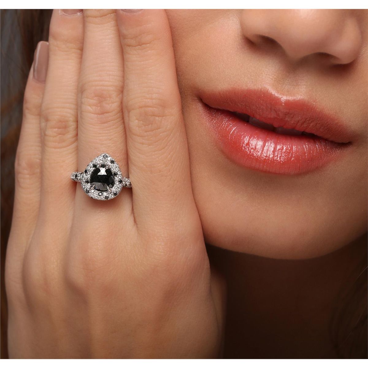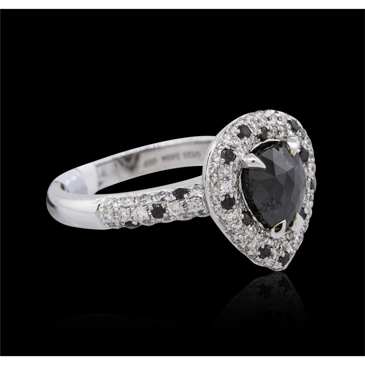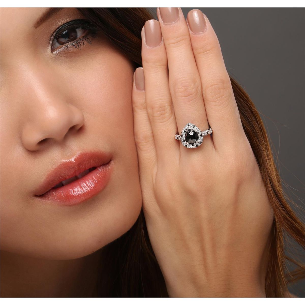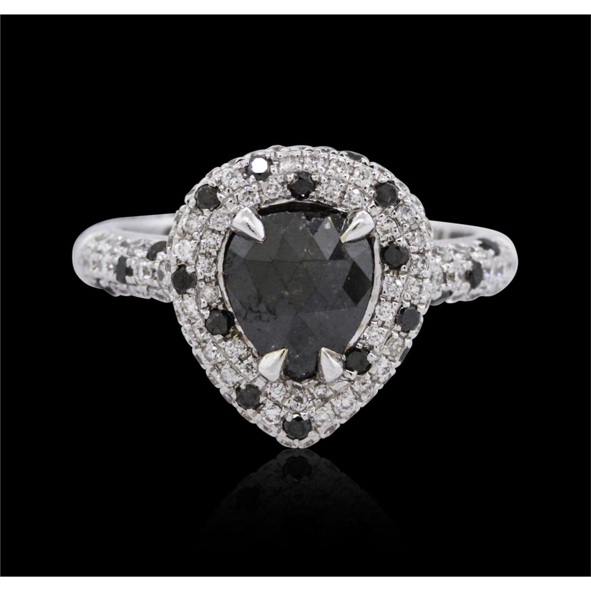 One white gold ring stamped 14k containing one natural pear rose cut fancy black diamond, enhanced for color, with a total weight of 1.23ct. The ring also contains 50 round brilliant cut side stones that are G-H color, SI3-I1 clarity with a total weight of 0.28ct and 20 fancy black color enhanced diamonds with a total weight of 0.24ct. Total weight of the ring is 3.90 grams. EGL Appraised at $3,030.00.