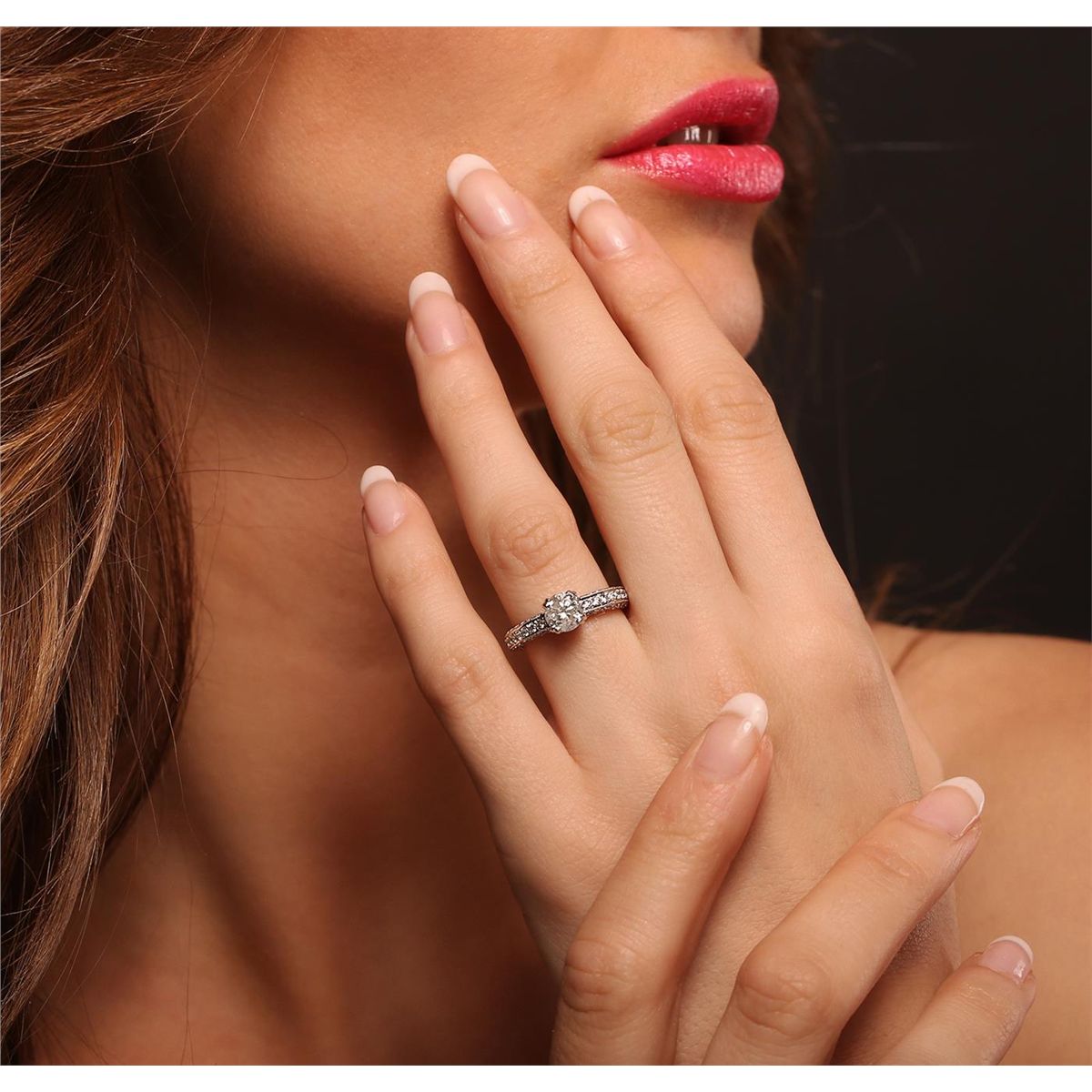 One electronically tested 14KT white gold ladies cast diamond unity ring. Condition is new, good workmanship. The featured diamond is supported by diamond set shoulders, completed by a two and one-half millimeter wide band. Bright polish finish with milgrain detailing. Identified with markings of "14K". Containing: One prong set round brilliant cut diamond, measuring 6.40 - 6.30 x 4.00mm (depth est.) approximate weight of 1.09ct with a medium blue fluorescence. Graded in the setting. Clarity: I-2. Color: I Forty-Four bead set round brilliant cut diamonds, measuring 1.60 - 1.50 x 0.93mm (depth est.) approximate. Total Weight of 44 Stones = 0.66ct. Graded in the setting. Clarity: I-1 to I-2. Color: H - J. Total Weight of Diamonds 1.75ct. Total Weight of Ring 4.10 grams. AIG Appraised at $11,655.00.