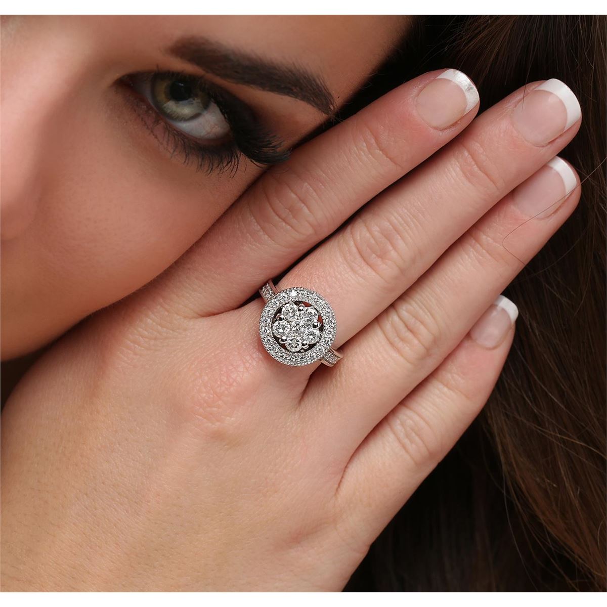 One electronically tested 14KT white gold ladies cast diamond ring. The ring features an organized diamond cluster set within a diamond bezel supported by diamond set shoulders, completed by a three and one-half millimeter wide band. Bright polish finish with milgrain detailing. Identified with markings of "K14". Condition is new, good workmanship. Containing: Six prong set round brilliant cut diamonds, measuring 3.60 - 3.50 x 2.13mm (depth est.) approximate total weight of 6 Stones = 1.08ct. Graded in the setting. Clarity I-1 to I-2. Color G - I. Thirty-Two prong set round brilliant cut diamonds, measuring 1.80 - 1.60 x 1.02mm (depth est.) approximate total weight of 32 Stones = 0.67ct. Graded in the setting. Clarity SI-1 to SI-2. Color G - I. Total Weight of Diamonds 1.75ct. Total Weight of Ring 7.44 grams. AIG Appraised at $6,050.00.