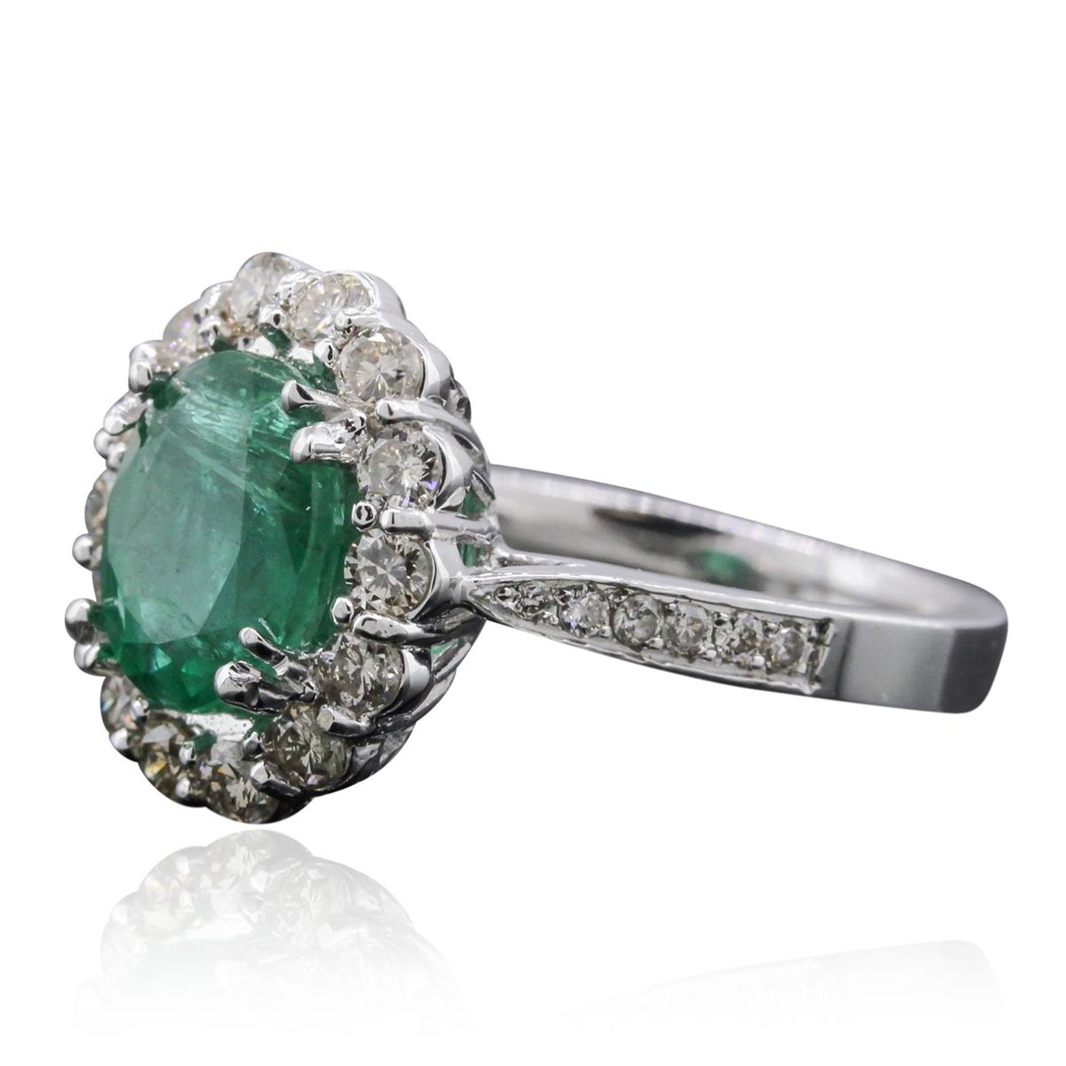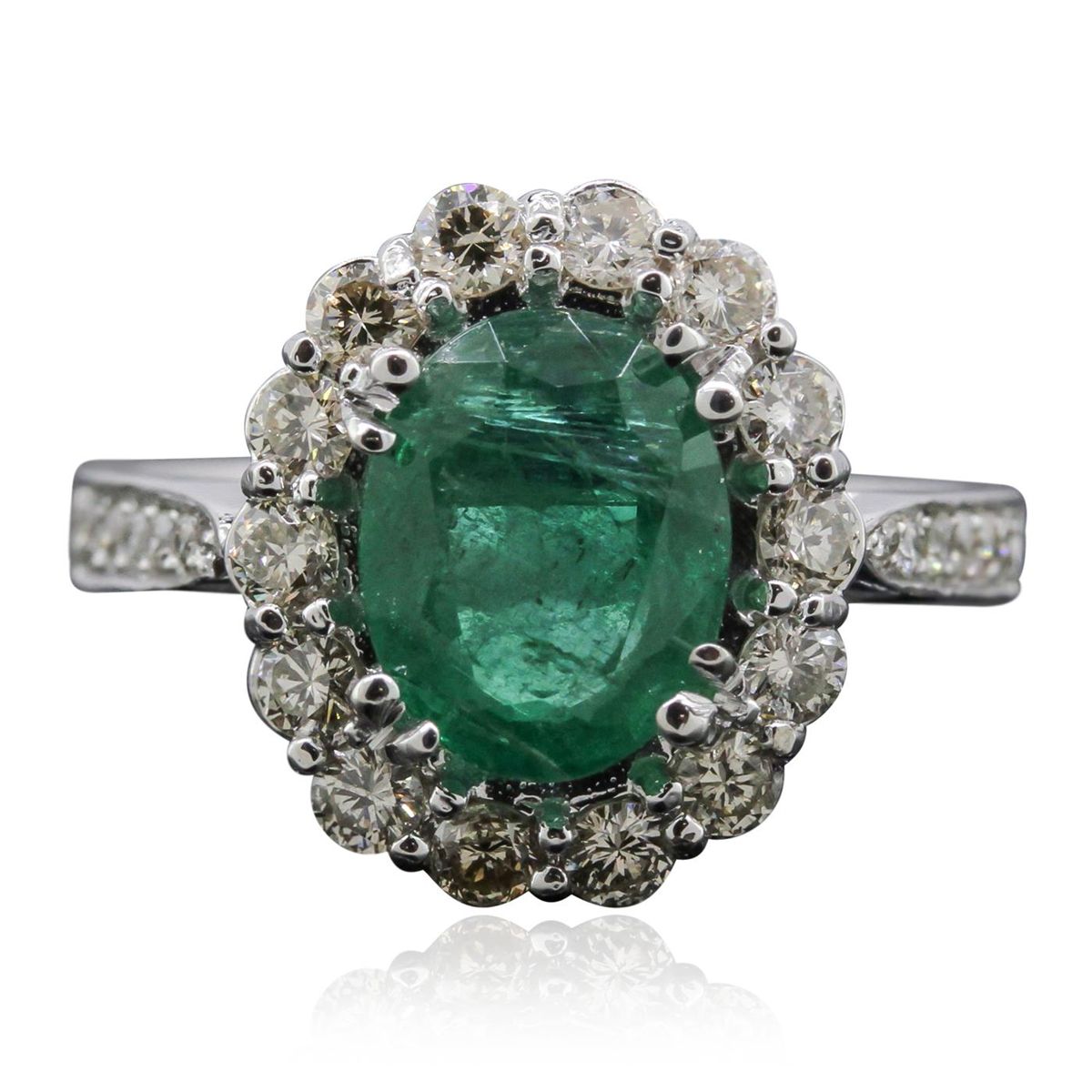 One electronically tested 14KT white gold Ladies combination cast & assembled fashion ring with a high polish finish. Condition is new. Identified with markings of "14K". Containing: One prong set oval modified mixed cut natural emerald, measuring 9.30 x 7.30 x 4.70mm, approximate weight of 1.76ct., clarity is heavily included, type III, medium, moderately strong, very slightly bluish green color, (GIA vslbG 5/4), cut is good. Colored gemstones are presumed to have been subjected to commonly used and possible undetectable color/clarity enhancement processes. Twenty-Six prong set round brilliant cut diamonds, measuring 1.90 - 1.30 x 0.96mm (depth est.) approximate total weight of 26 Stones = 0.50ct. Clarity of SI-1 to I-1, Color of I - K, Cut is Good. Total Weight of Colored Stones 1.76ct. Total Weight of Diamonds 0.50ct. Total Weight of Ring 5.20 grams. GGL Appraised at $6,210.00.