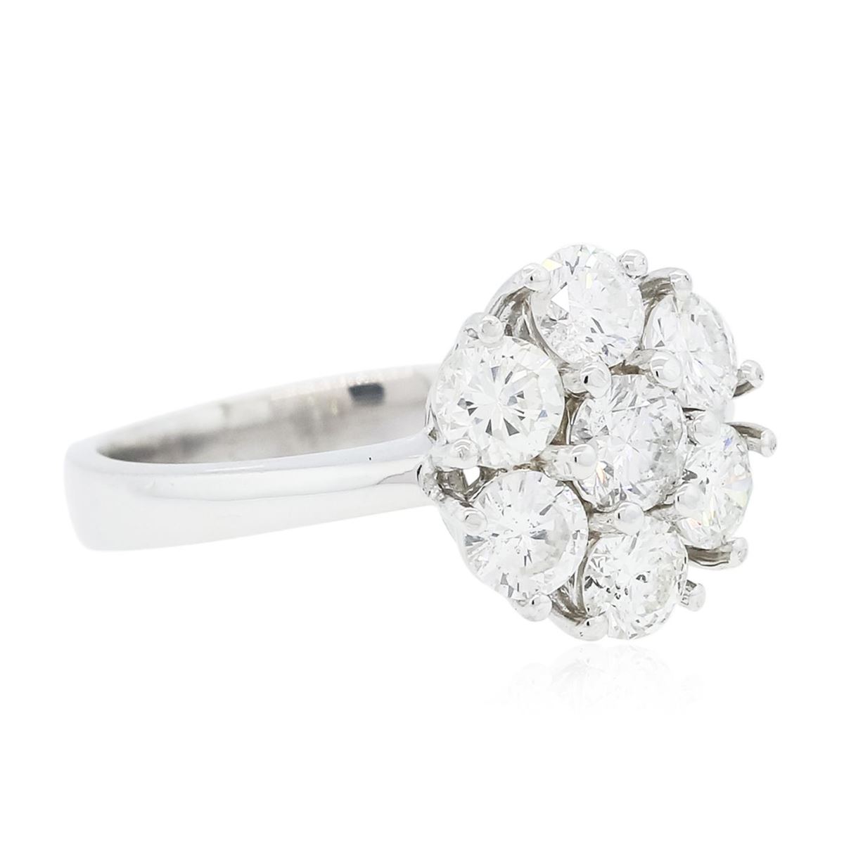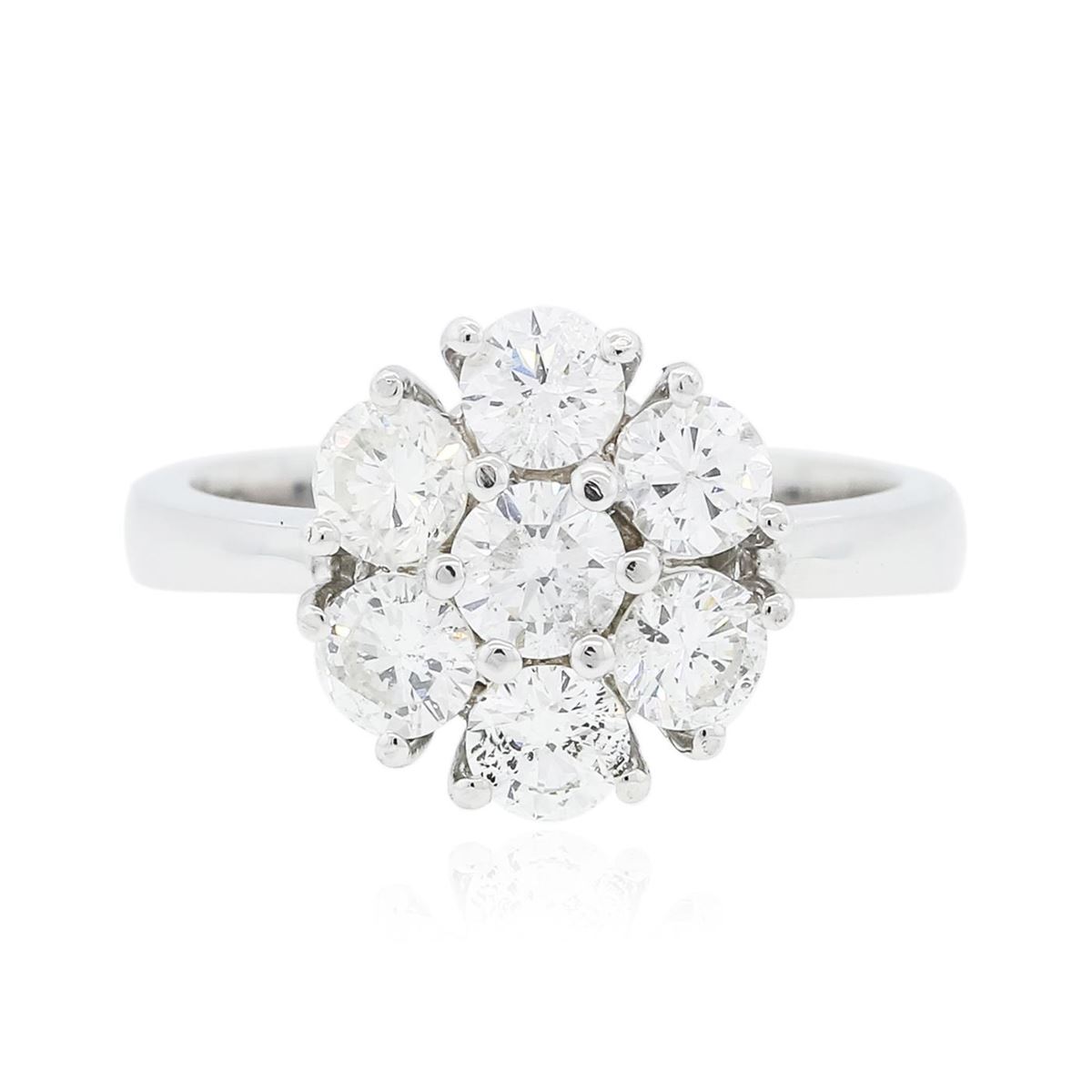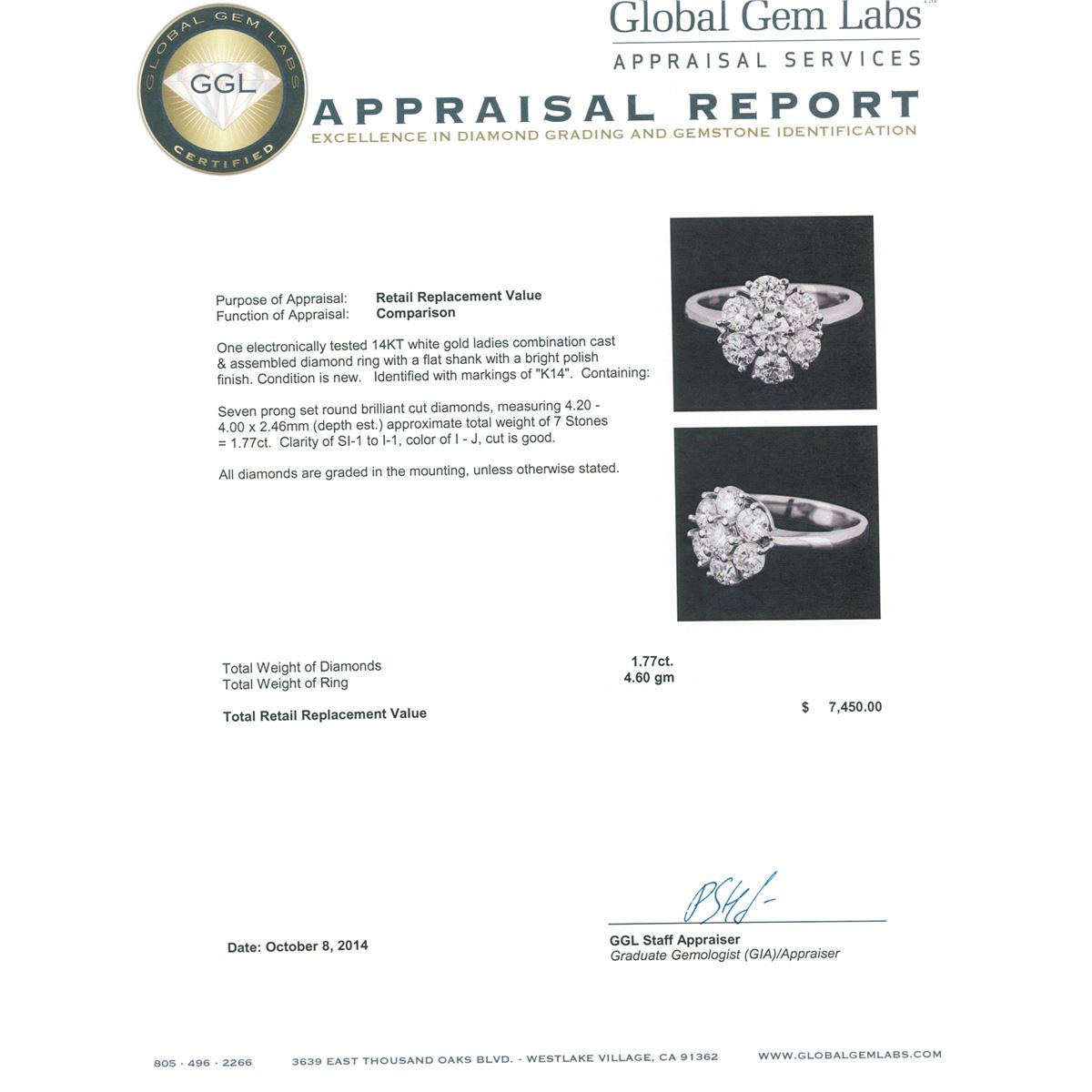 One electronically tested 14KT white gold ladies combination cast & assembled diamond ring with a flat shank with a bright polish finish. Identified with markings of "K14". Condition is new. Containing: Seven prong set round brilliant cut diamonds, measuring 4.20 - 4.00 x 2.46mm (depth est.) approximate total weight of 7 Stones = 1.77ct. Clarity: SI-1 to I-1. Color: I - J, Cut is Good. All diamonds are graded in the mounting, unless otherwise stated. Total Weight of Diamonds 1.77ct. Total Weight of Ring 4.60 grams. GGL Appraised at $7,450.00.