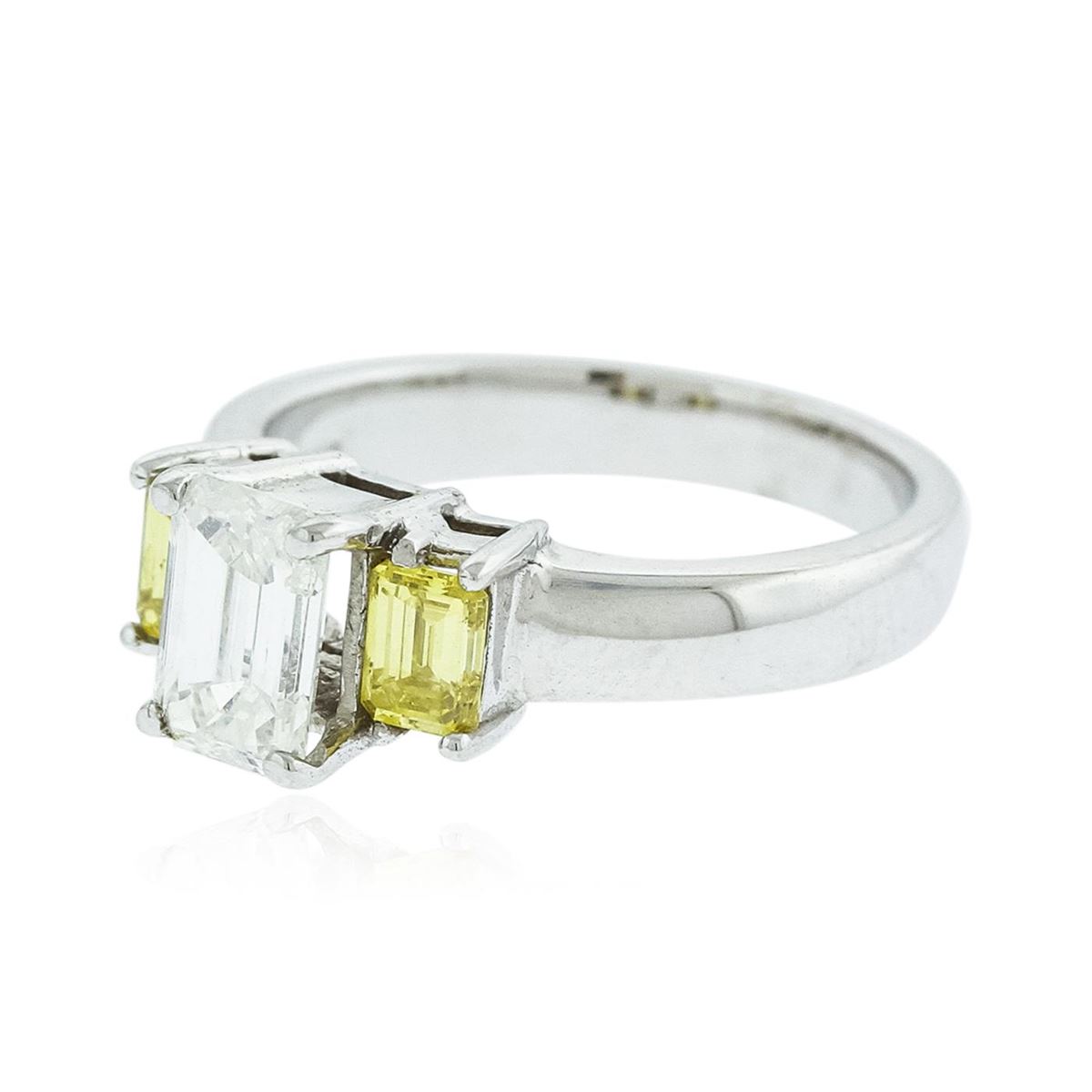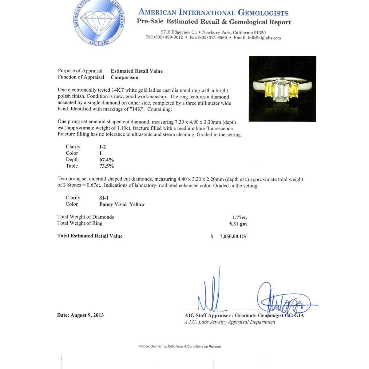 One electronically tested 14KT white gold ladies cast diamond ring with a bright polish finish. Condition is new, good workmanship. The ring features a diamond accented by a single diamond on either side, completed by a three millimeter wide band. Identified with markings of "14K". Containing: One prong set emerald shaped cut diamond, measuring 7.30 x 4.90 x 3.30mm (depth est.) approximate weight of 1.10ct, fracture filled with a medium blue fluorescence. Fracture filling has no tolerance to ultrasonic and steam cleaning. Graded in the setting. Clarity I-2. Color I. Depth 67.4%. Table 73.5%. Two prong set emerald shaped cut diamonds, measuring 4.40 x 3.20 x 2.20mm (depth est.) approximate total weight of 2 Stones = 0.67ct. Indications of laboratory irradiated enhanced color. Graded in the setting. Clarity SI-1. Color Fancy Vivid Yellow. Total Weight of Diamonds 1.77ct. Total Weight of Ring 5.31gm. AIG Appraised at $7,050.00.
