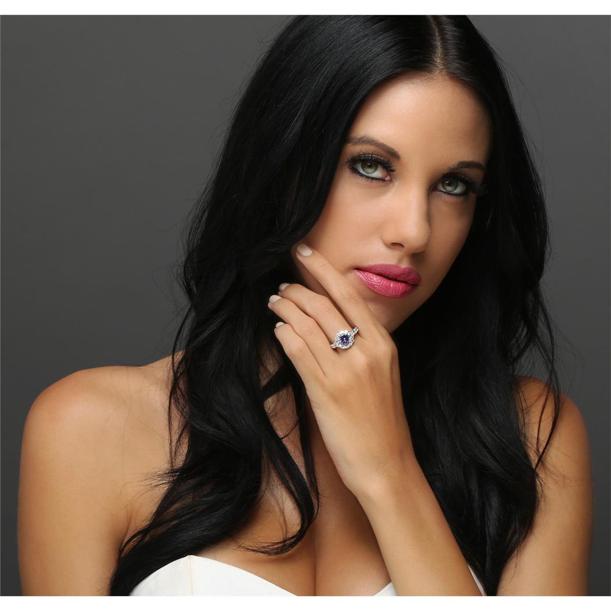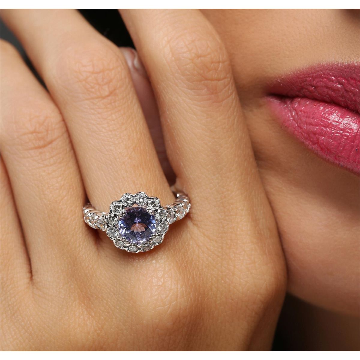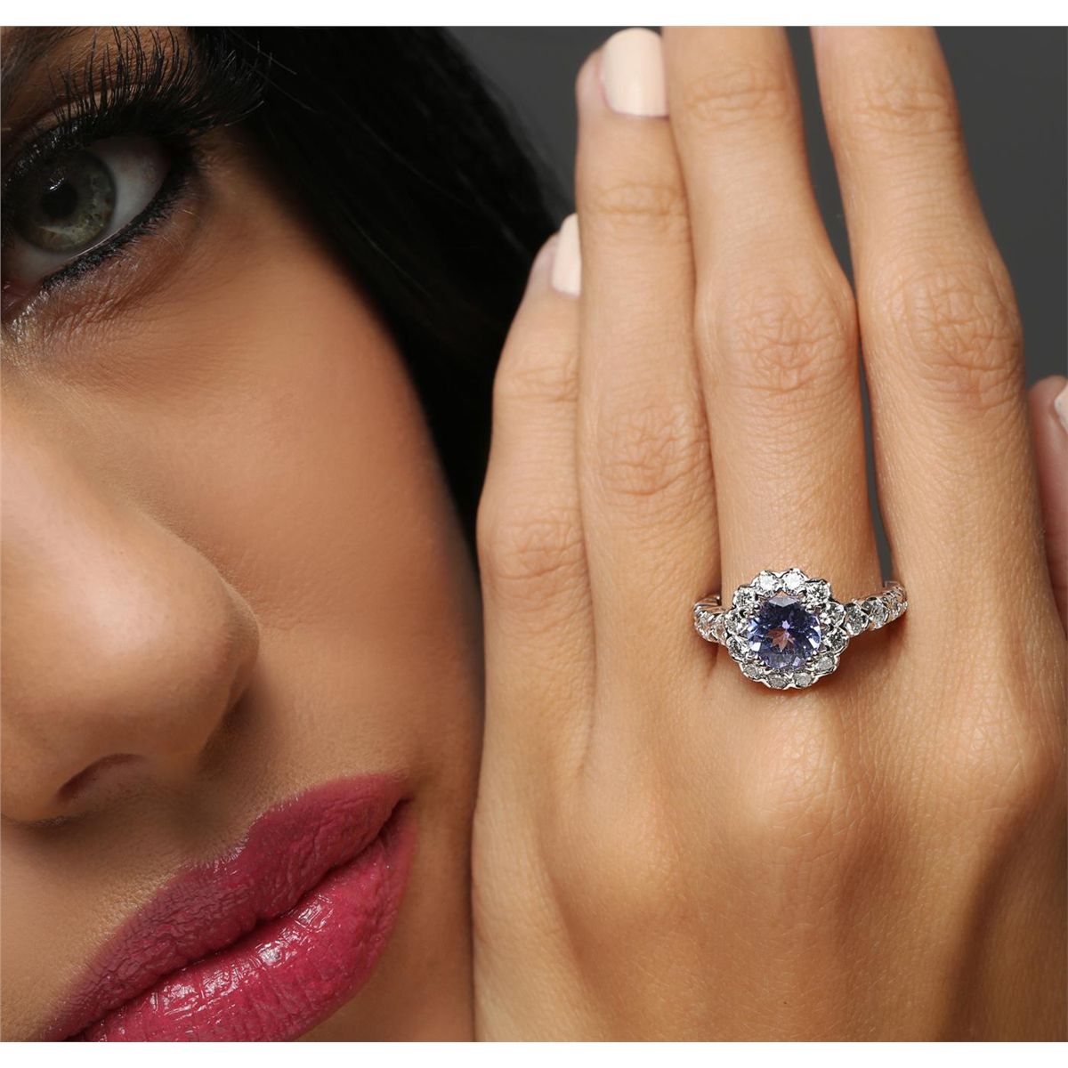 One electronically tested 14KT white gold ladies combination cast & assembled tanzanite and diamond ring with a flat shank with a bright polish finish. Identified with markings of "14K". Condition is new. Containing: One prong set round modified brilliant cut natural tanzanite, measuring 7.30 - 7.30 x 4.95 mm, approximate weight of 1.77ct., clarity is eye clean, type I, medium light, very slightly grayish, violet color, (GIA V 4/3), cut is good. Twenty-Two prong set round brilliant cut diamonds, measuring 2.90 - 2.50 x 1.62mm (depth est.) approximate total weight of 22 Stones = 1.58ct. Clarity: SI-2. Color: I - K, Cut is Good. Colored gemstones are presumed to have been subjected to commonly used enhancement processes. All diamonds and colored gemstones are graded in the mounting, unless otherwise stated. Total Weight of Colored Stones 1.77ct. Total Weight of Diamonds 1.58ct. Total Weight of Ring 4.80 grams. GGL Appraised at $5,315.00.