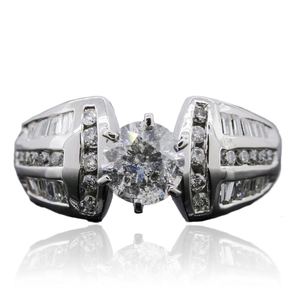 One electronically tested 14KT white gold ladies & assembled diamond unity ring with a bright polish finish. Condition is good. The featured diamond is supported by tapering diamond set shoulders, completed by a two and one-half millimeter wide band. Identified with markings of "14K". Containing: One prong set round brilliant cut diamond, measuring 6.25 - 6.20 x 4.00mm (depth est.) approximate total weight of 1.04ct. Graded in the settings. Clarity I-2. Color G. Depth 64.2%. Table 54.6%. Twenty channel set round brilliant cut diamonds, measuring 1.60 - 1.50 x 0.93mm (depth est.) approximate total weight of 20 Stones = 0.37ct. Graded in the setting. Clarity SI-2 to I-2. Color H-J. Twenty-four channel set baguette cut diamonds, measuring from 1.60 x 1.10 x 0.77mm (depth est.) to 2.00 x 1.20 x 0.84mm (depth est.) approximate total weight of 24 Stones = 0.36ct. Graded in the setting. Clarity SI-1 to I-1. Color H-J. Total Weight of Diamonds 1.77ct. Total Weight of Ring 5.68 grams. AIG Appraised at $12,590.00.