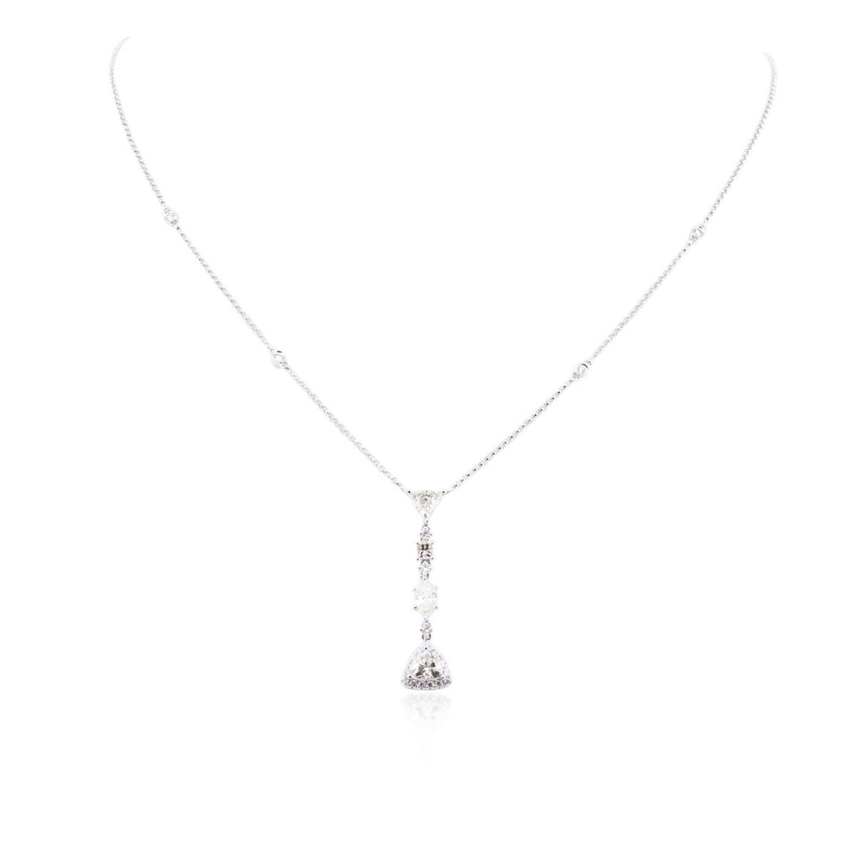 One electronically tested 14KT white gold ladies cast diamond necklace with a lobster claw clasp with a bright polish finish. Measurements 16" in length. Identified with markings of "585". Condition is new. Containing: Two prong set triangle brilliant cut diamonds, measuring 5.20 x 5.20 x 3.22mm (depth est.) approximate total weight of 2 Stones = 0.99ct. Clarity: VS-2. Color: K, Cut is Good. One prong set princess cut diamond, measuring 2.80 x 2.80 x 2.10mm (depth est.) approximate weight of 0.14ct. Clarity: VS-2. Color: K, Cut is Good. One prong set marquise shaped cut diamond, measuring 6.50 x 4.00. x 2.52mm (depth est.) approximate weight of 0.38ct. Clarity: VS-2. Color: K, Cut is Good. Eighteen prong set round brilliant cut diamonds, measuring 1.60 - 1.60 x 0.96mm (depth est.) approximate total weight of 18 Stones = 0.27ct. Clarity: SI-1 to SI-2. Color: I - J, Cut is Good. All diamonds are graded in the mounting, unless otherwise stated. Total Weight of Diamonds 1.78ct. Total Weight of Necklace 4.10 grams. GGL Appraised at $7,235.00.