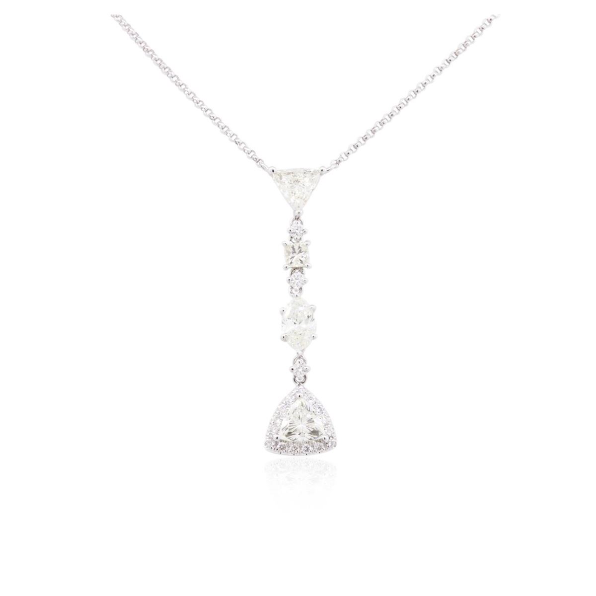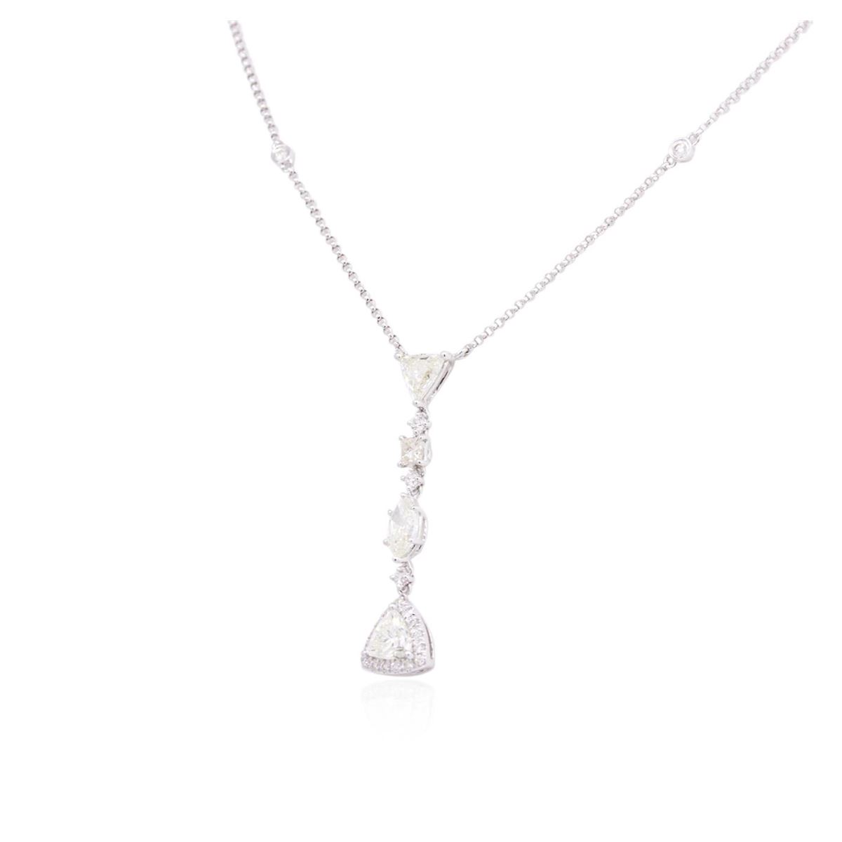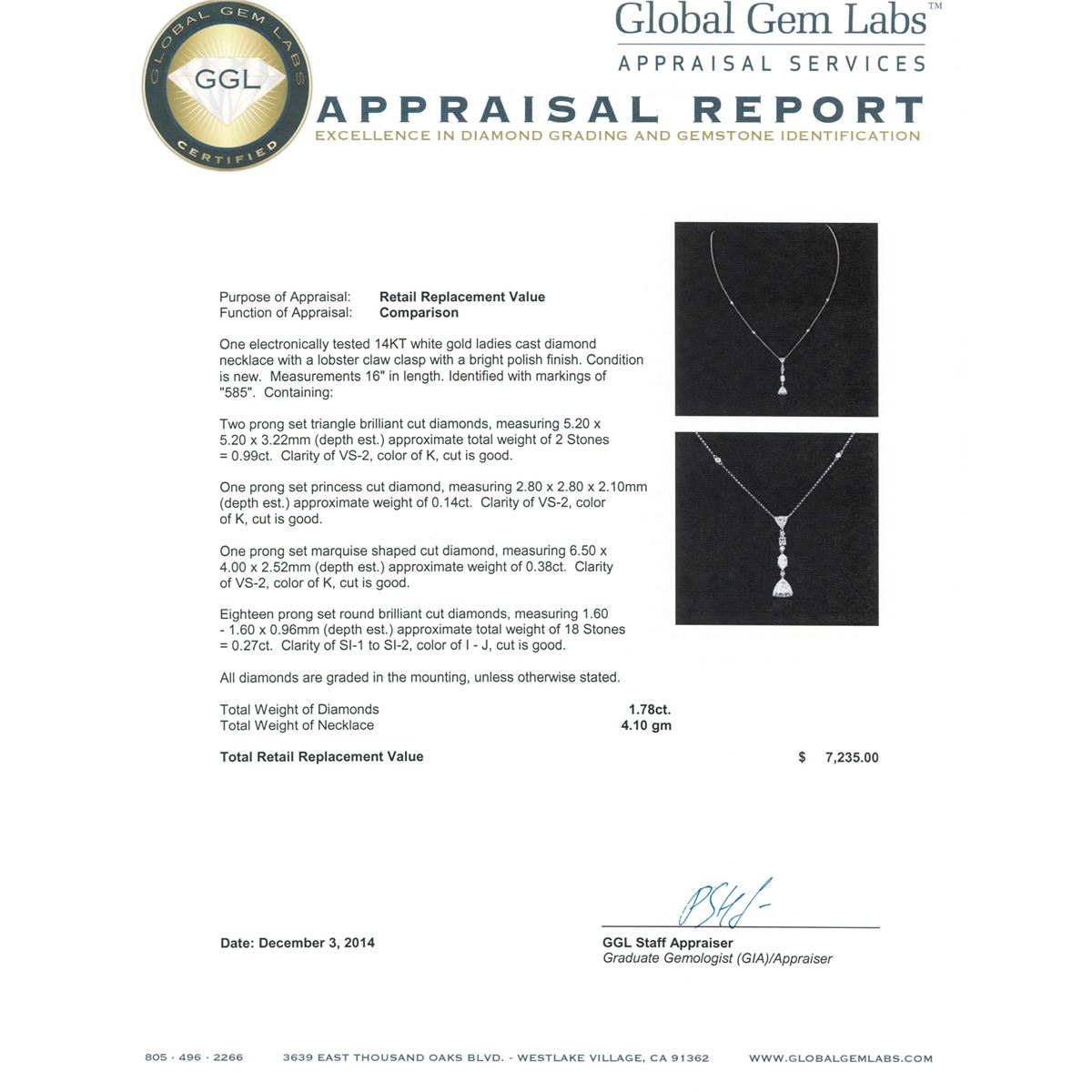 One electronically tested 14KT white gold ladies cast diamond necklace with a lobster claw clasp with a bright polish finish. Measurements 16" in length. Identified with markings of "585". Condition is new. Containing: Two prong set triangle brilliant cut diamonds, measuring 5.20 x 5.20 x 3.22mm (depth est.) approximate total weight of 2 Stones = 0.99ct. Clarity: VS-2. Color: K, Cut is Good. One prong set princess cut diamond, measuring 2.80 x 2.80 x 2.10mm (depth est.) approximate weight of 0.14ct. Clarity: VS-2. Color: K, Cut is Good. One prong set marquise shaped cut diamond, measuring 6.50 x 4.00. x 2.52mm (depth est.) approximate weight of 0.38ct. Clarity: VS-2. Color: K, Cut is Good. Eighteen prong set round brilliant cut diamonds, measuring 1.60 - 1.60 x 0.96mm (depth est.) approximate total weight of 18 Stones = 0.27ct. Clarity: SI-1 to SI-2. Color: I - J, Cut is Good. All diamonds are graded in the mounting, unless otherwise stated. Total Weight of Diamonds 1.78ct. Total Weight of Necklace 4.10 grams. GGL Appraised at $7,235.00.