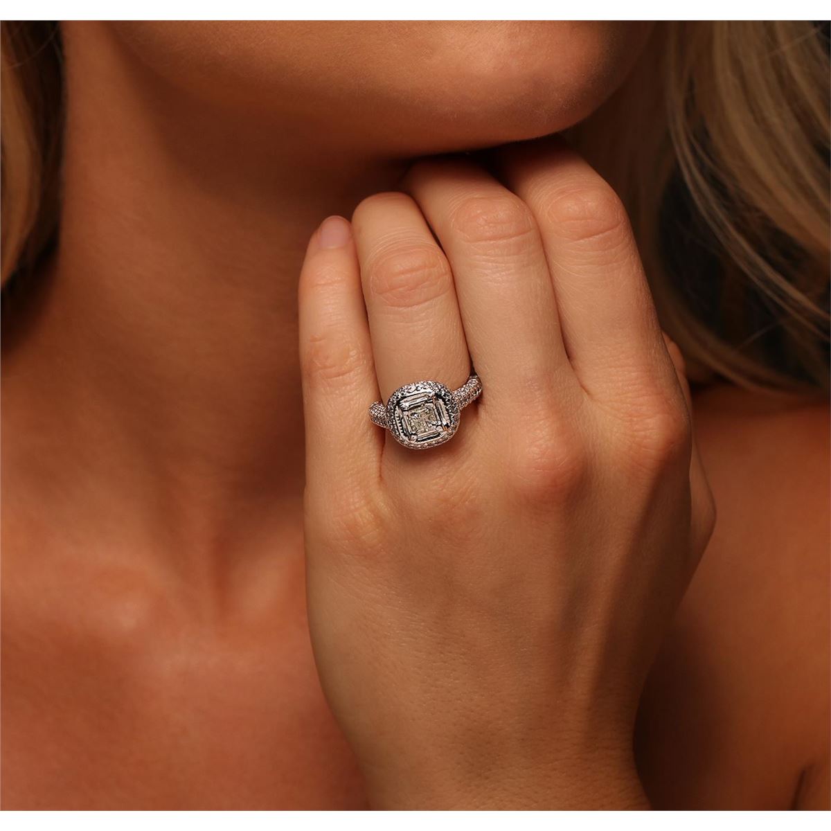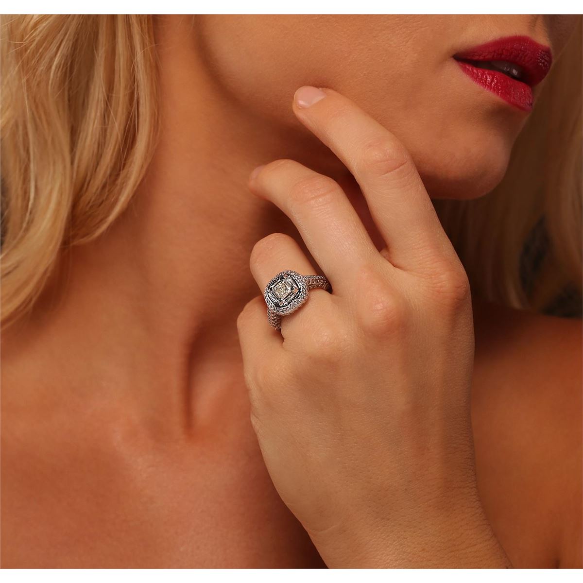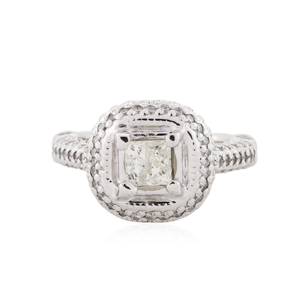 One electronically tested 14KT white gold ladies cast diamond unity ring. Condition is new, good workmanship. The featured diamond is set within a tiered diamond bezel supported by diamond set shoulders, completed by a two and one-half millimeter wide band. Bright polish finish with milgrain detailing. Identified with markings of "14K". Containing: One prong set princess cut diamond, measuring 4.75 x 4.70 x 4.00mm (depth est.), 8.00.%. GTCF approximate weight of 0.88ct with a strong blue fluorescence. Graded in the setting. Clarity: I-2. Color: 85.1%. Table 74.5%. One Hundred Fourteen bead & bezel set round brilliant cut diamonds, measuring 1.80 - 1.00 x 0.84mm (depth est.) approximate. Total Weight of 114 Stones = 0.90ct. Graded in the setting. Clarity: VS-2 to SI-2. Color: G - I. Total Weight of Diamonds 1.78ct. Total Weight of Ring 9.34 grams. AIG Appraised at $8,925.00.