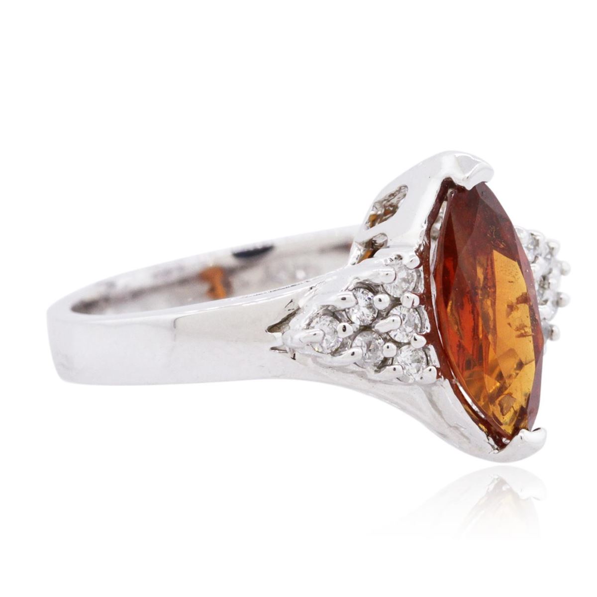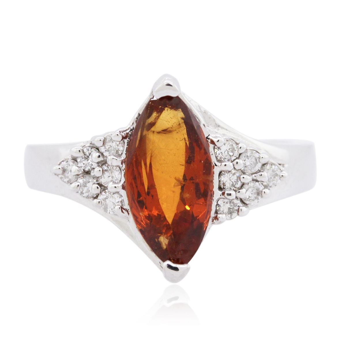 One electronically tested 14KT white gold ladies combination cast & assembled garnet and diamond ring with a flat shank with a bright polish finish. Identified with markings of "14KT". Condition is new. Containing: One prong set marquise modified step cut natural malaya garnet, measuring 12.00 x 5.60 x 3.64mm, approximate weight of 1.78ct., clarity is slightly included, type II, medium, moderately strong, orange color, (GIA O 5/4), cut is good. Twelve prong set round brilliant cut diamonds, measuring 1.30 - 1.30 x 0.78mm (depth est.) approximate total weight of 12 Stones = 0.10ct. Clarity: SI-2 to I-1. Color: I - J, Cut is Good. All diamonds and colored gemstones are graded in the mounting, unless otherwise stated. Colored gemstones are presumed to have been subjected to commonly used enhancement processes. Total Weight of Colored Stones 1.78ct. Total Weight of Diamonds 0.10ct. Total Weight of Ring 5.40 grams. GGL Appraised at $3,070.00.