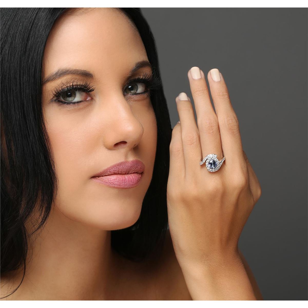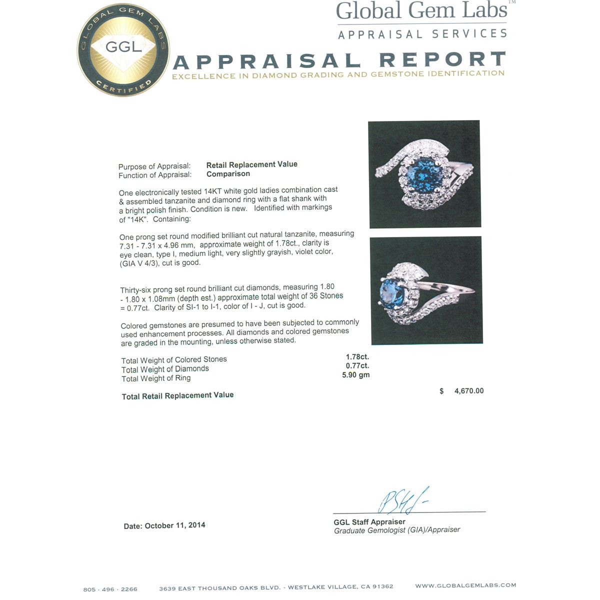 One electronically tested 14KT white gold ladies combination cast & assembled tanzanite and diamond ring with a flat shank with a bright polish finish. Identified with markings of "14K". Condition is new. Containing: One prong set round modified brilliant cut natural tanzanite, measuring 7.31 - 7.31 x 4.96 mm, approximate weight of 1.78ct., clarity is eye clean, type I, medium light, very slightly grayish, violet color, (GIA V 4/3), cut is good. Thirty-Six prong set round brilliant cut diamonds, measuring 1.80 - 1.80 x 1.08mm (depth est.) approximate total weight of 36 Stones = 0.77ct. Clarity: SI-1 to I-1. Color: I - J, Cut is Good. Colored gemstones are presumed to have been subjected to commonly used enhancement processes. All diamonds and colored gemstones are graded in the mounting, unless otherwise stated. Total Weight of Colored Stones 1.78ct. Total Weight of Diamonds 0.77ct. Total Weight of Ring 5.90 grams. GGL Appraised at $4,670.00.