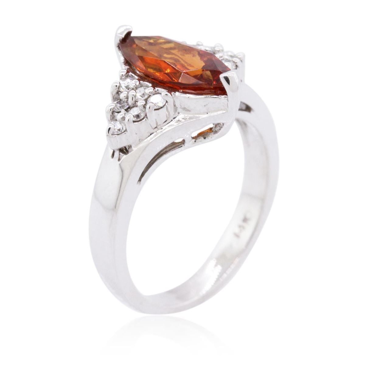 One electronically tested 14KT white gold ladies combination cast & assembled garnet and diamond ring with a flat shank with a bright polish finish. Identified with markings of "14KT". Condition is new. Containing: One prong set marquise modified step cut natural malaya garnet, measuring 12.00 x 5.60 x 3.64mm, approximate weight of 1.78ct., clarity is slightly included, type II, medium, moderately strong, orange color, (GIA O 5/4), cut is good. Twelve prong set round brilliant cut diamonds, measuring 1.30 - 1.30 x 0.78mm (depth est.) approximate total weight of 12 Stones = 0.10ct. Clarity: SI-2 to I-1. Color: I - J, Cut is Good. All diamonds and colored gemstones are graded in the mounting, unless otherwise stated. Colored gemstones are presumed to have been subjected to commonly used enhancement processes. Total Weight of Colored Stones 1.78ct. Total Weight of Diamonds 0.10ct. Total Weight of Ring 5.40 grams. GGL Appraised at $3,070.00.