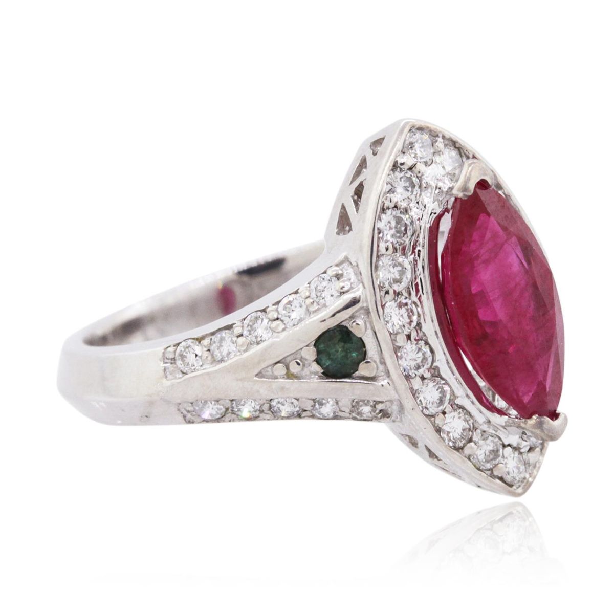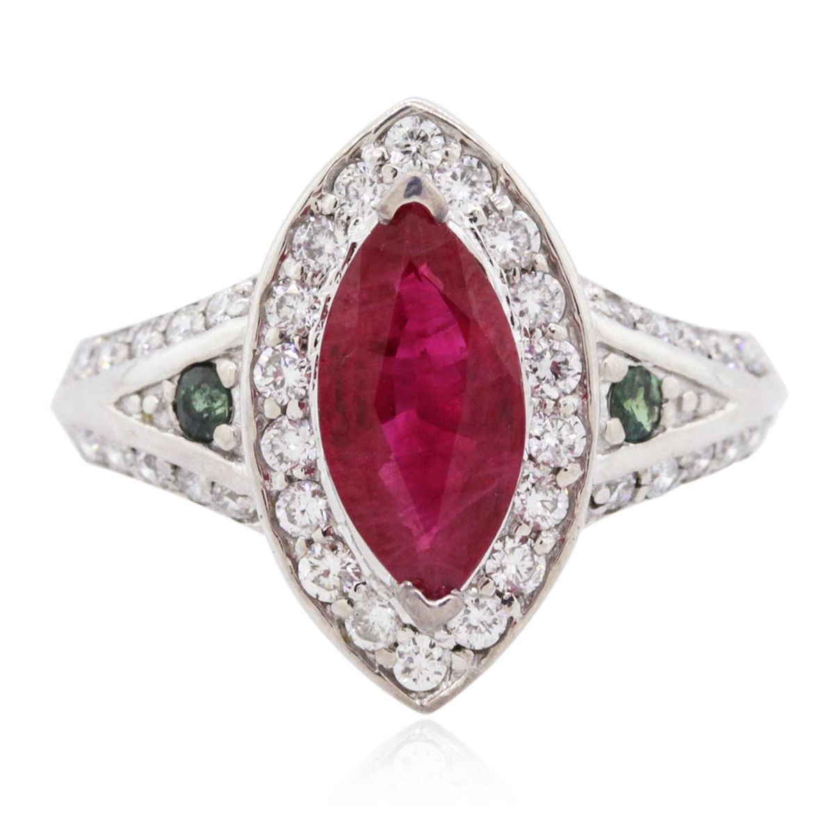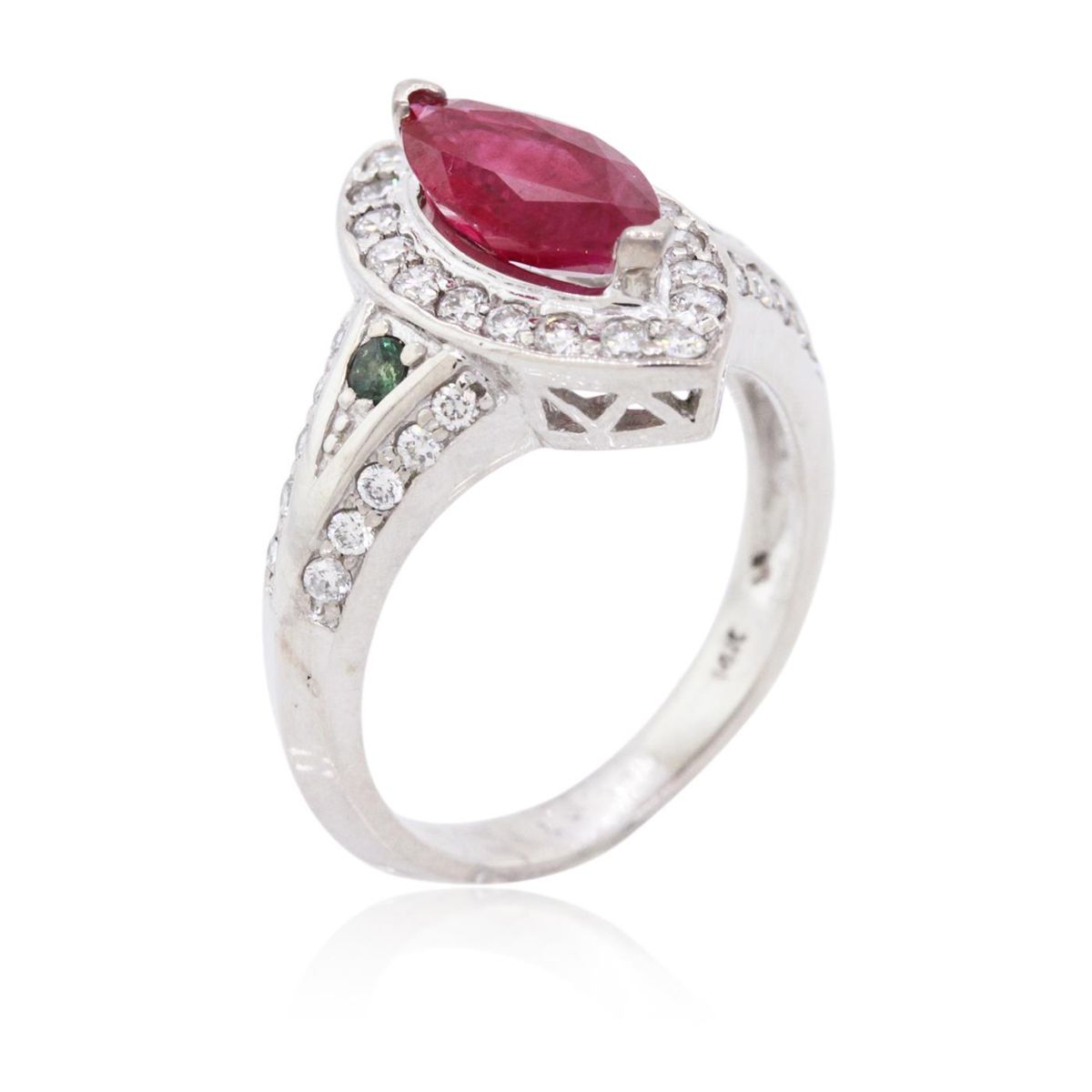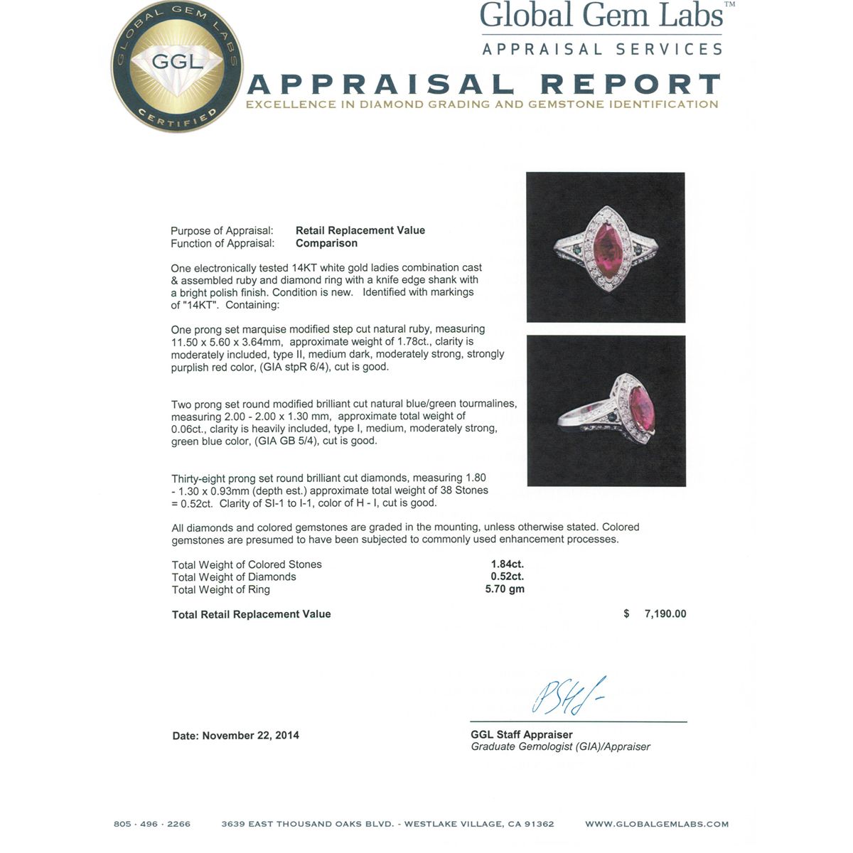 One electronically tested 14KT white gold ladies combination cast & assembled ruby and diamond ring with a knife edge shank with a bright polish finish. Identified with markings of "14KT". Condition is new. Containing: One prong set marquise modified step cut natural ruby, measuring 11.50 x 5.60 x 3.64mm, approximate weight of 1.78ct., clarity is moderately included, type II, medium dark, moderately strong, strongly purplish red color, (GIA stpR 6/4), cut is good. Two prong set round modified brilliant cut natural blue/green tourmalines, measuring 2.00 - 2.00 x 1.30 mm, approximate total weight of 0.06ct., clarity is heavily included, type I, medium, moderately strong, green blue color, (GIA GB 5/4), cut is good. Thirty-Eight prong set round brilliant cut diamonds, measuring 1.80 - 1.30 x 0.93mm (depth est.) approximate total weight of 38 Stones = 0.52ct. Clarity: SI-1 to I-1. Color: H - I, Cut is Good. All diamonds and colored gemstones are graded in the mounting, unless otherwise stated. Colored gemstones are presumed to have been subjected to commonly used enhancement processes. Total Weight of Colored Stones 1.84ct. Total Weight of Diamonds 0.52ct. Total Weight of Ring 5.70 grams. GGL Appraised at $7,190.00.