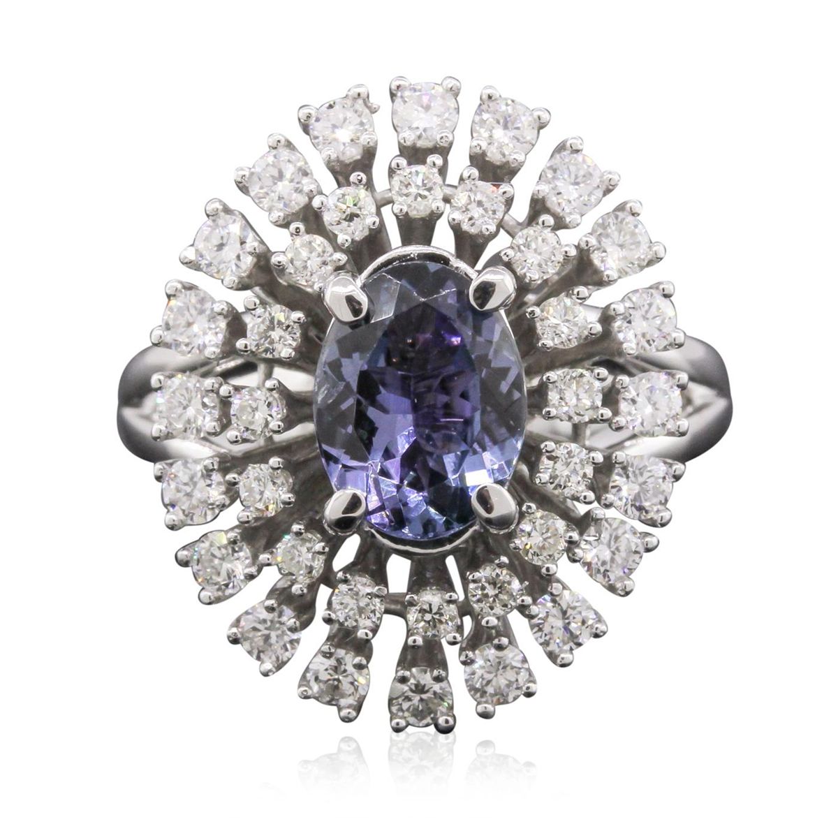 One electronically tested 14KT white gold Ladies combination cast & assembled ring with a bright polish finish. Condition is new. Identified with markings of "14K". Containing: One prong set oval modified mixed cut natural tanzanite, measuring 8.90 x 6.70 x 4.36mm, approximate weight of 1.78ct., clarity is eye clean, type I, medium light, very slightly grayish, violet color, (GIA V 4/3), cut is very good. Colored gemstones are presumed to have been subjected to commonly used color/clarity enhancement processes. Sixteen prong set round brilliant cut diamonds, measuring 1.70 - 1.70 x 1.02mm (depth est.) approximate. Total Weight of 16 Stones = 0.29ct. Clarity: VS-2 to SI-1. Color: H - I, Cut is Very Good. Twenty prong set round brilliant cut diamonds, measuring 2.00. - 2.00. x 1.20mm (depth est.) approximate. Total Weight of 20 Stones = 0.58ct. Clarity: SI-1 to SI-2. Color: I - J, Cut is Very Good. Total Weight of Colored Stones 1.78ct. Total Weight of Diamonds 0.87ct. Total Weight of Ring 9.40 grams. GGL Appraised at $8,150.00.