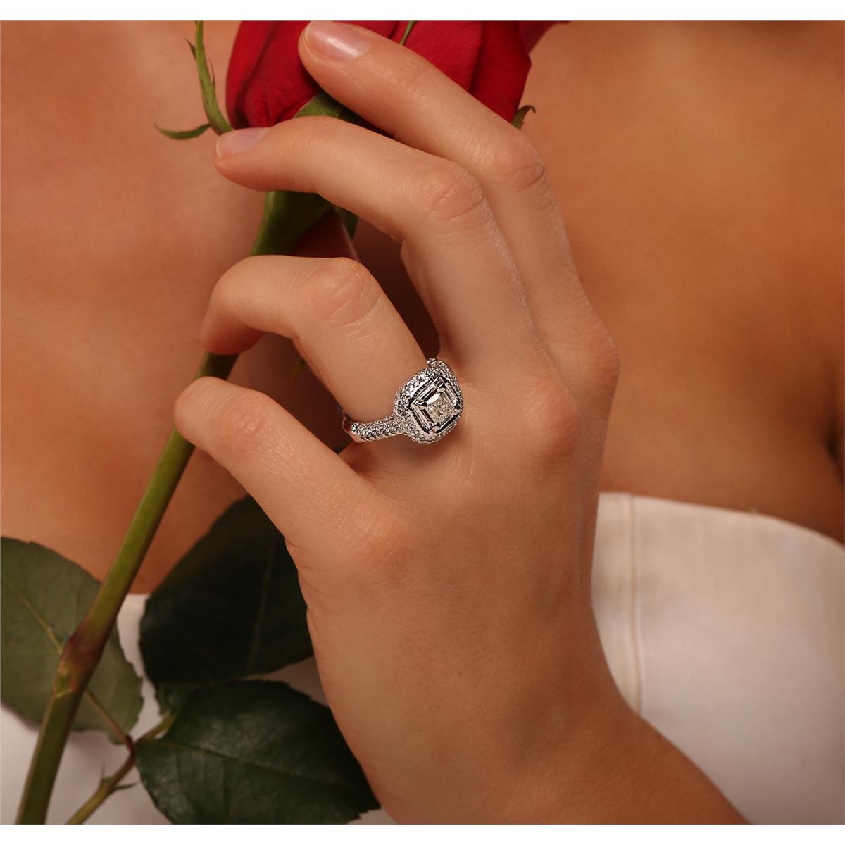 One electronically tested 14KT white gold ladies cast diamond unity ring. Condition is new, good workmanship. The featured diamond is set within a tiered diamond bezel supported by diamond set shoulders, completed by a two and one-half millimeter wide band. Bright polish finish with milgrain detailing. Identified with markings of "14K". Containing: One prong set princess cut diamond, measuring 4.75 x 4.70 x 4.00mm (depth est.), 8.00.%. GTCF approximate weight of 0.88ct with a strong blue fluorescence. Graded in the setting. Clarity: I-2. Color: 85.1%. Table 74.5%. One Hundred Fourteen bead & bezel set round brilliant cut diamonds, measuring 1.80 - 1.00 x 0.84mm (depth est.) approximate. Total Weight of 114 Stones = 0.90ct. Graded in the setting. Clarity: VS-2 to SI-2. Color: G - I. Total Weight of Diamonds 1.78ct. Total Weight of Ring 9.34 grams. AIG Appraised at $8,925.00.