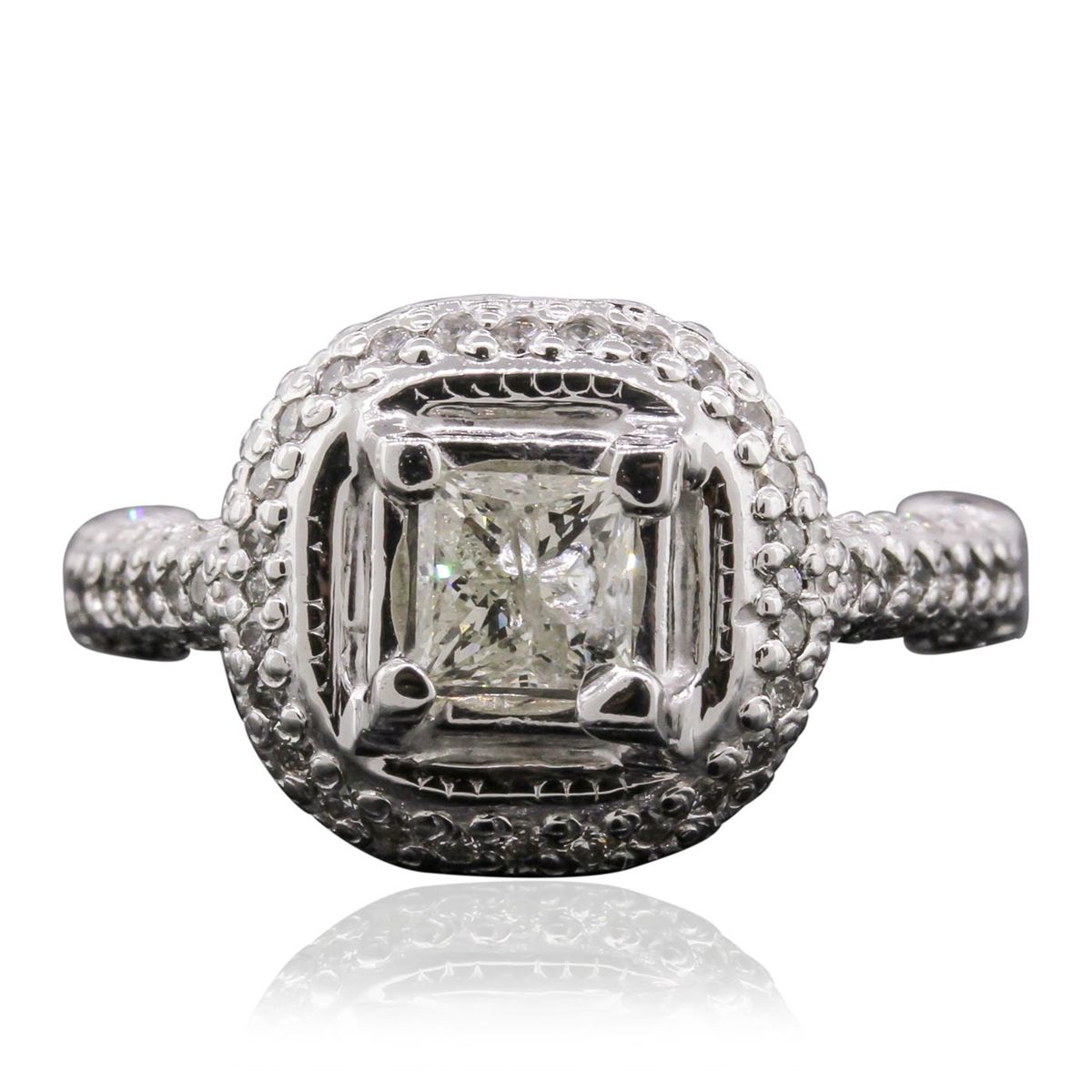 One electronically tested 14KT white gold ladies cast diamond unity ring. Condition is new, good workmanship. The featured diamond is set within a tiered diamond bezel supported by diamond set shoulders, completed by a two and one-half millimeter wide band. Bright polish finish with milgrain detailing. Identified with markings of "14K". Containing: One prong set princess cut diamond, measuring 4.75 x 4.70 x 4.00mm (depth est.), 8.00.%. GTCF approximate weight of 0.88ct with a strong blue fluorescence. Graded in the setting. Clarity: I-2. Color: 85.1%. Table 74.5%. One Hundred Fourteen bead & bezel set round brilliant cut diamonds, measuring 1.80 - 1.00 x 0.84mm (depth est.) approximate. Total Weight of 114 Stones = 0.90ct. Graded in the setting. Clarity: VS-2 to SI-2. Color: G - I. Total Weight of Diamonds 1.78ct. Total Weight of Ring 9.34 grams. AIG Appraised at $8,925.00.