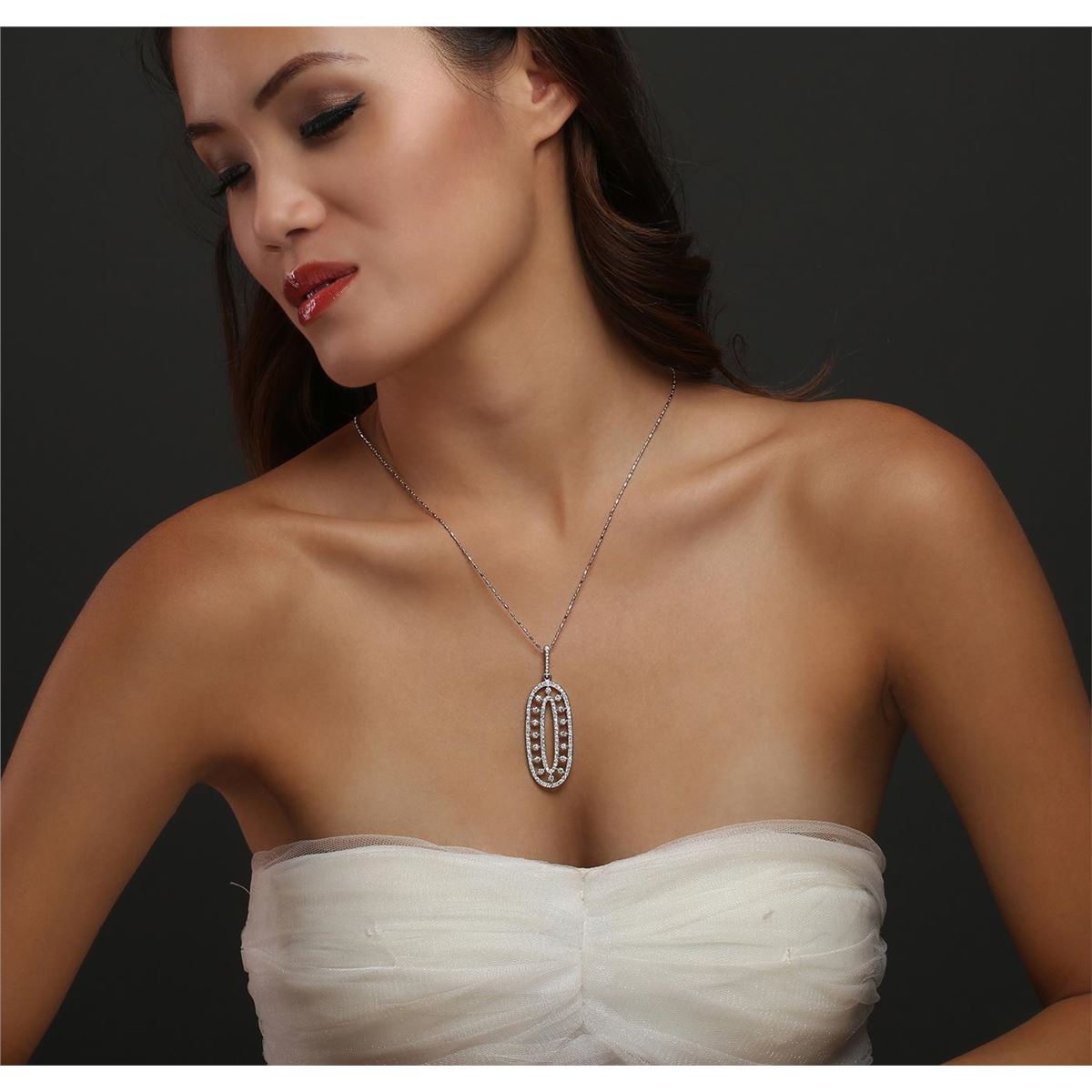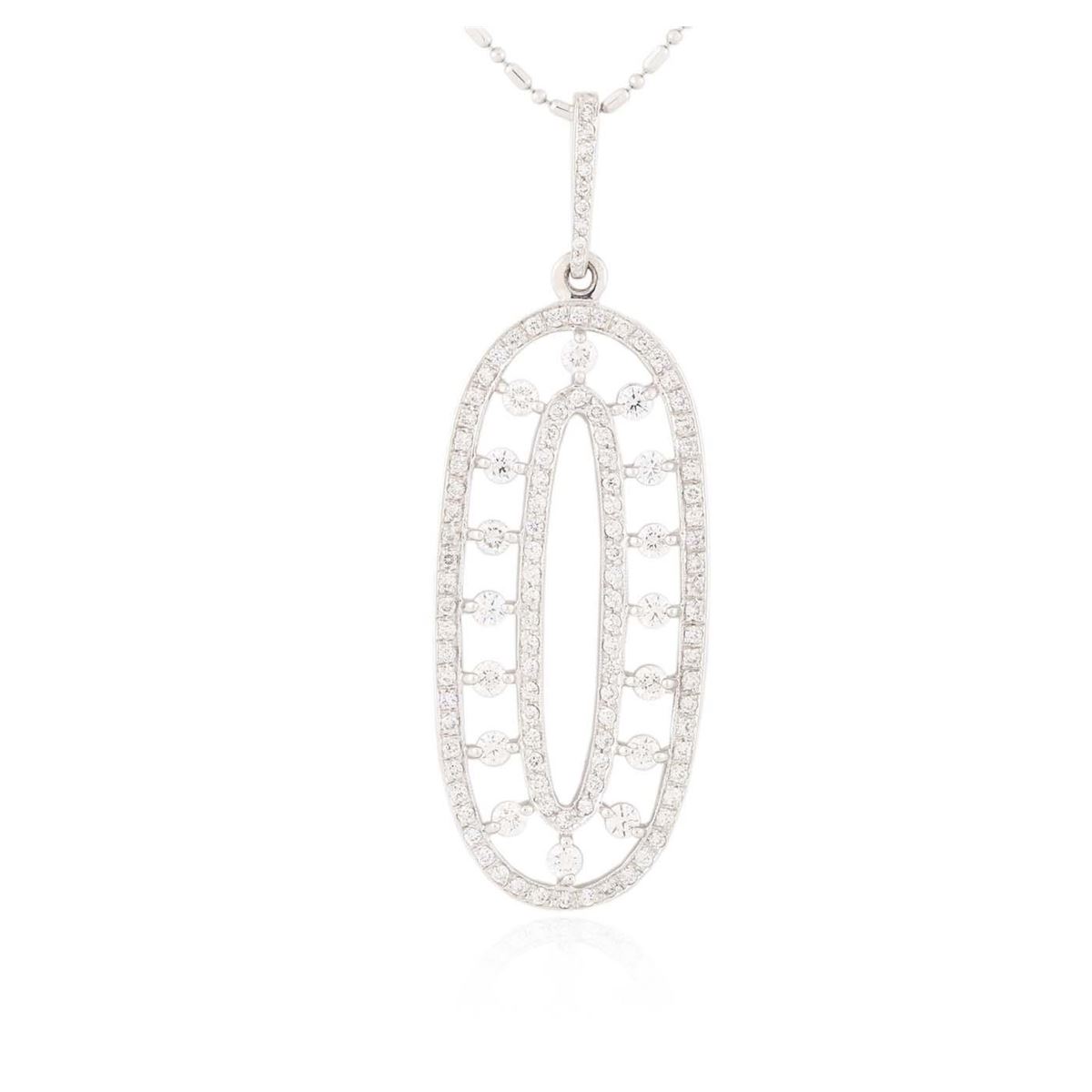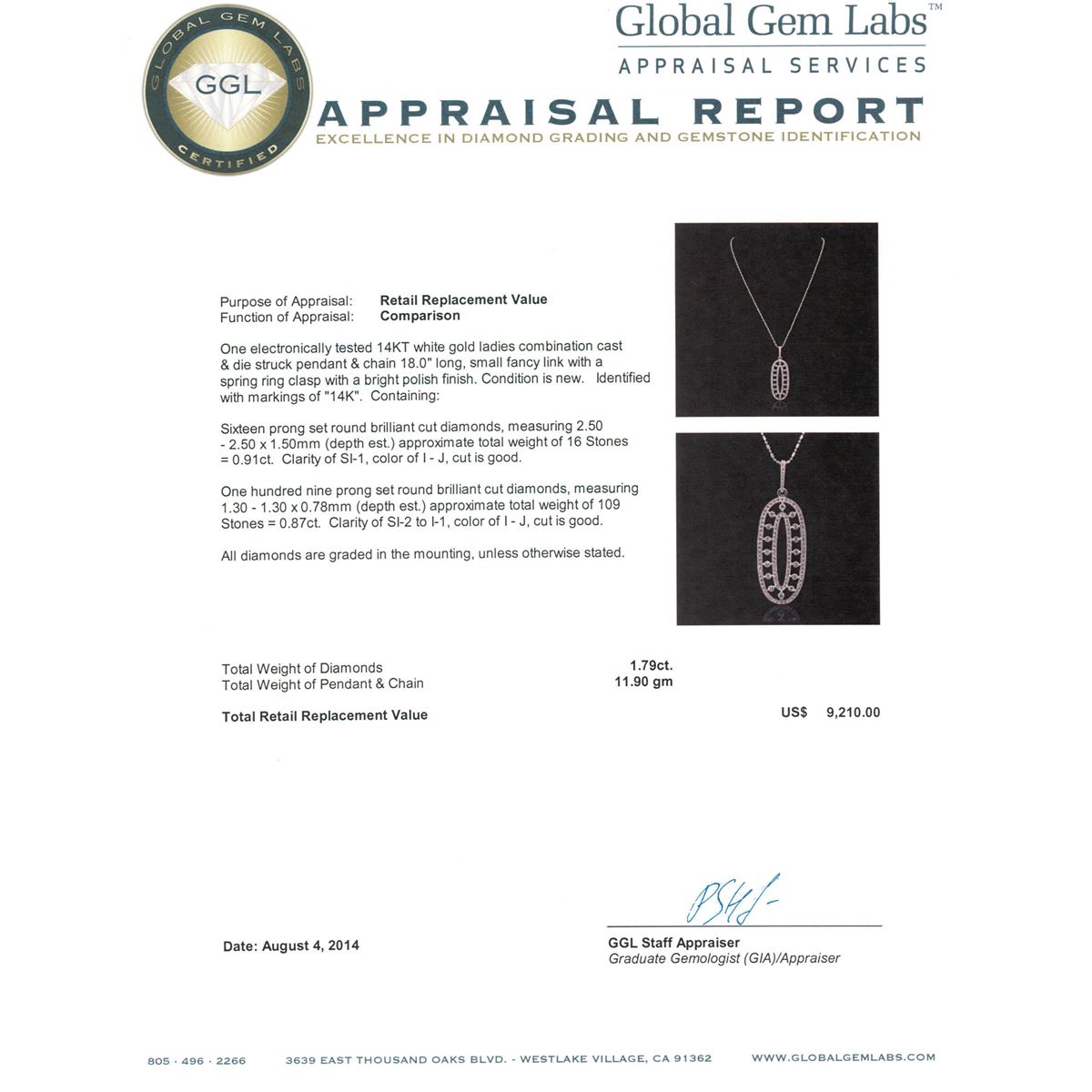 One electronically tested 14KT white gold ladies combination cast & die struck pendant & chain 18.0" long, small fancy link with a spring ring clasp with a bright polish finish. Condition is new. Identified with markings of "14K". Containing: Sixteen prong set round brilliant cut diamonds, measuring 2.50 - 2.50 x 1.50mm (depth est.) approximate. Total Weight of 16 Stones = 0.91ct. Clarity: SI-1. Color: I - J, Cut is Good. One Hundred Nine prong set round brilliant cut diamonds, measuring 1.30 - 1.30 x 0.78mm (depth est.) approximate. Total Weight of 109 Stones = 0.87ct. Clarity: SI-2 to I-1. Color: I - J, Cut is Good. All diamonds are graded in the mounting, unless otherwise stated. Total Weight of Diamonds 1.79ct. Total Weight of Pendant & Chain 11.90 grams. GGL Appraised at $9,210.00.
