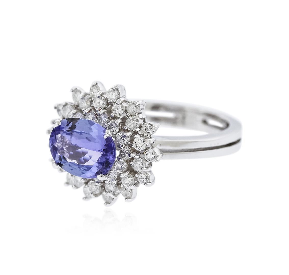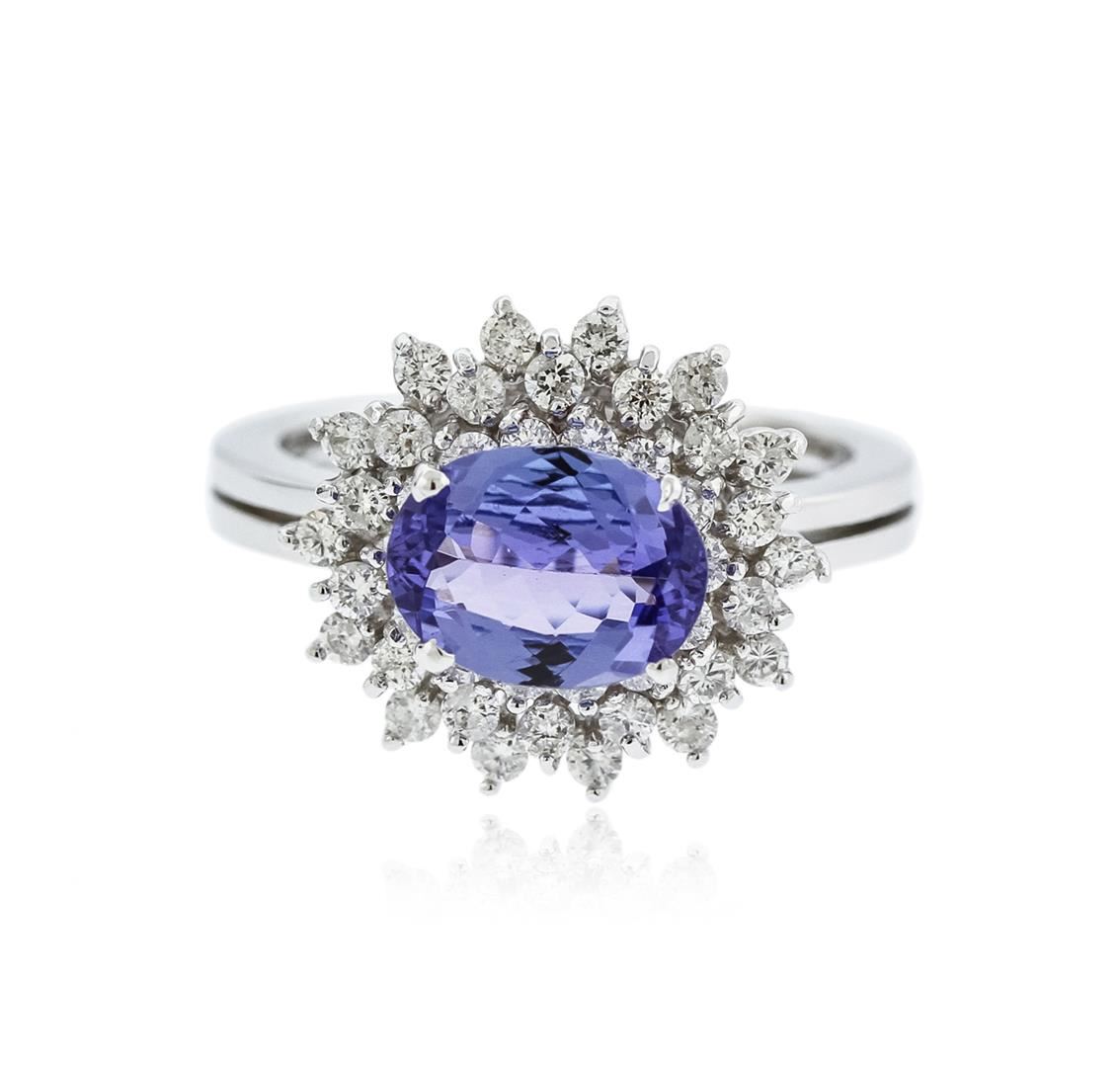 One electronically tested 14KT white gold ladies cast tanzanite and diamond ring with a bright polish finish. Identified with markings of "K14". Condition is new. Containing: One prong set oval modified brilliant cut natural tanzanite, measuring 8.90 x 6.80 x 4.20mm, approximate weight of 1.79ct., clarity is eye clean, type I, medium light, very slightly grayish, violet color, (GIA V 4/3), cut is good. Forty-Two prong set round brilliant cut diamonds, measuring 1.50 - 1.30 x 0.84mm (depth est.) approximate total weight of 42 Stones = 0.42ct. Clarity: SI-1 to SI-2. Color: H - I, Cut is Good. Colored gemstones are presumed to have been subjected to commonly used enhancement processes. All diamonds and colored gemstones are graded in the mounting, unless otherwise stated. Total Weight of Colored Stones 1.79ct. Total Weight of Diamonds 0.42ct. Total Weight of Ring 5.10 grams. GGL Appraised at $3,705.00.