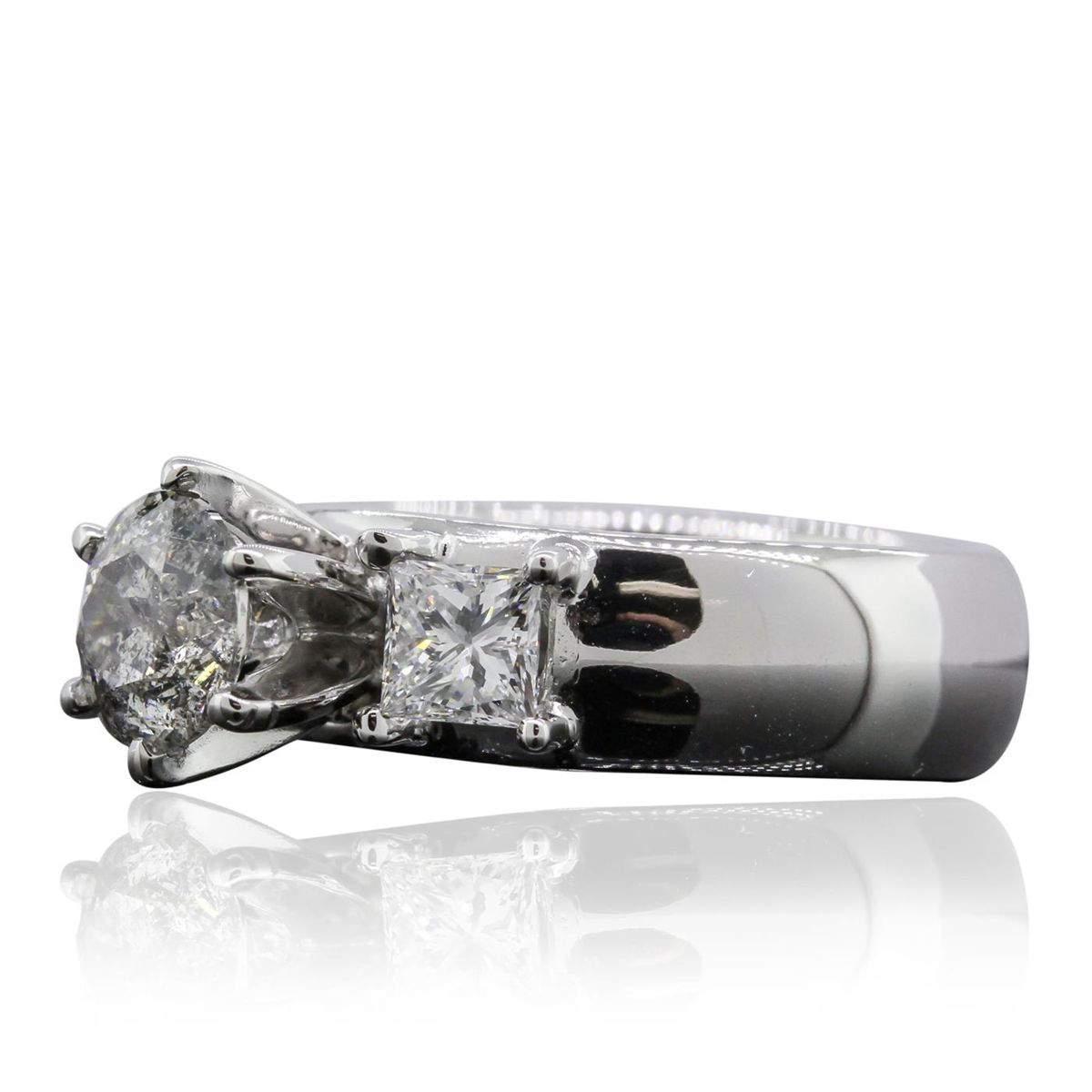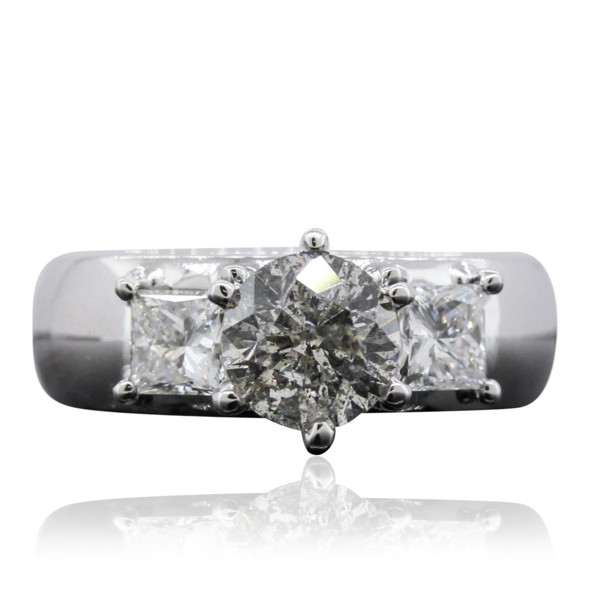 One electronically tested 14KT white gold ladies cast diamond unity ring with a bright polish finish. Condition is new, good workmanship. The featured diamond is supported by a single diamond on either side, completed by a five and one-half millimeter wide band. Identified with markings of "14K". Containing: One prong set round brilliant cut diamond, measuring 6.25 - 6.20 x 4.20mm (depth est.) approximate weight of 1.09ct. Graded in the setting. Clarity: I-2. Color: J Depth 67.4%. Table 57.8%. Two prong set princess cut diamonds, measuring 3.80 x 3.70 x 2.60mm (depth est.) approximate. Total Weight of 2 Stones = 0.70ct. Graded in the setting. Clarity: VS-2 to SI-2. Color: G - H. Total Weight of Diamonds 1.79ct. Total Weight of Ring 8.26 grams. AIG Appraised at $13,735.00.