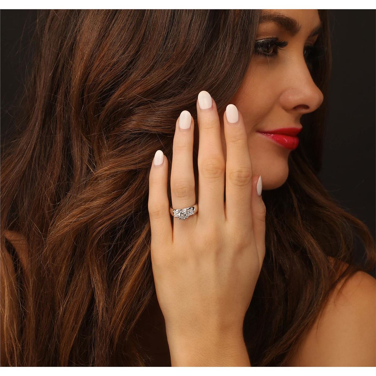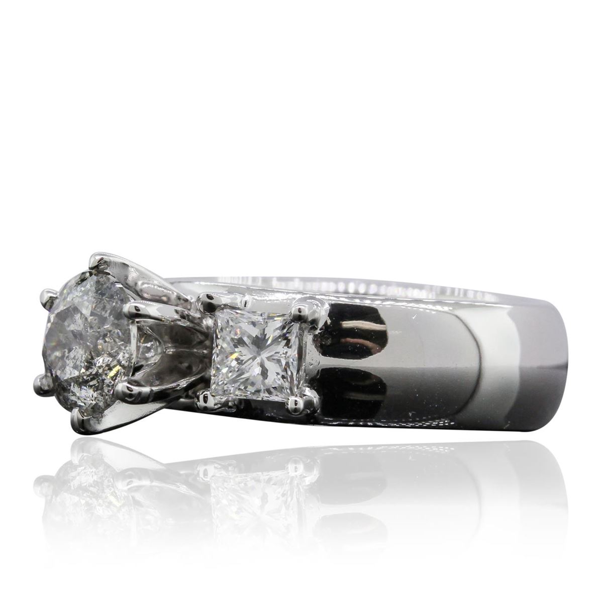 One electronically tested 14KT white gold ladies cast diamond unity ring with a bright polish finish. Condition is new, good workmanship. The featured diamond is supported by a single diamond on either side, completed by a five and one-half millimeter wide band. Identified with markings of "14K". Containing: One prong set round brilliant cut diamond, measuring 6.25 - 6.20 x 4.20mm (depth est.) approximate weight of 1.09ct. Graded in the setting. Clarity: I-2. Color: J Depth 67.4%. Table 57.8%. Two prong set princess cut diamonds, measuring 3.80 x 3.70 x 2.60mm (depth est.) approximate. Total Weight of 2 Stones = 0.70ct. Graded in the setting. Clarity: VS-2 to SI-2. Color: G - H. Total Weight of Diamonds 1.79ct. Total Weight of Ring 8.26 grams. AIG Appraised at $13,735.00.