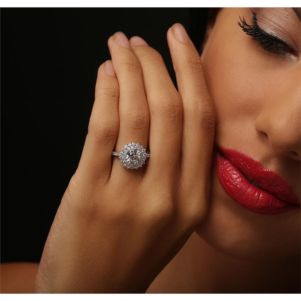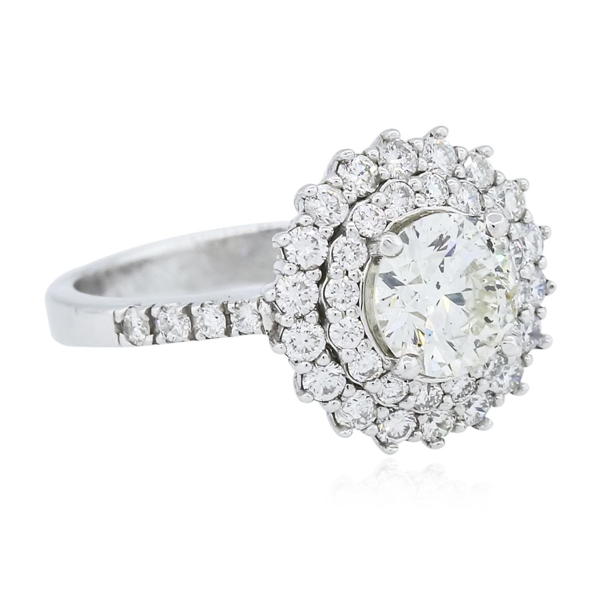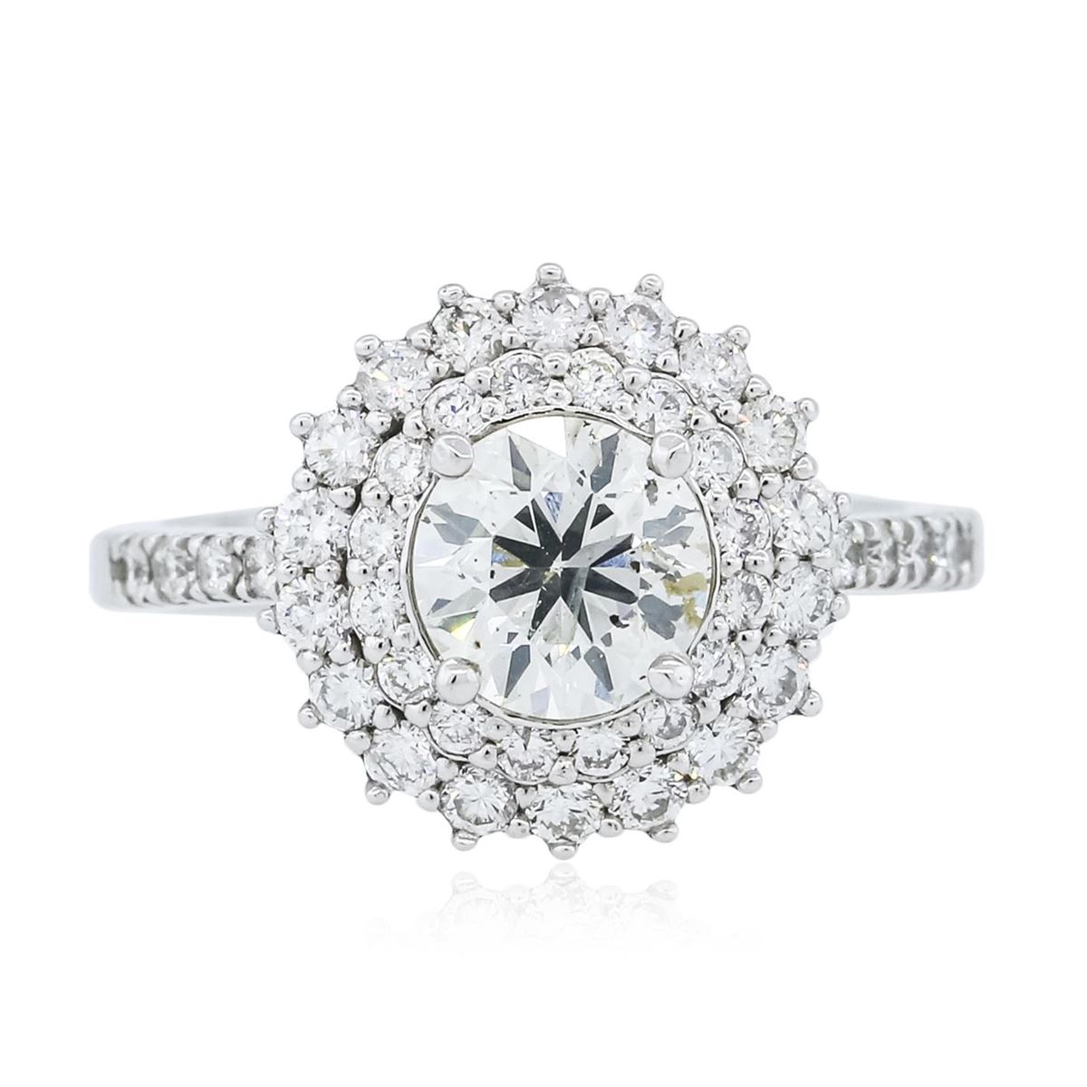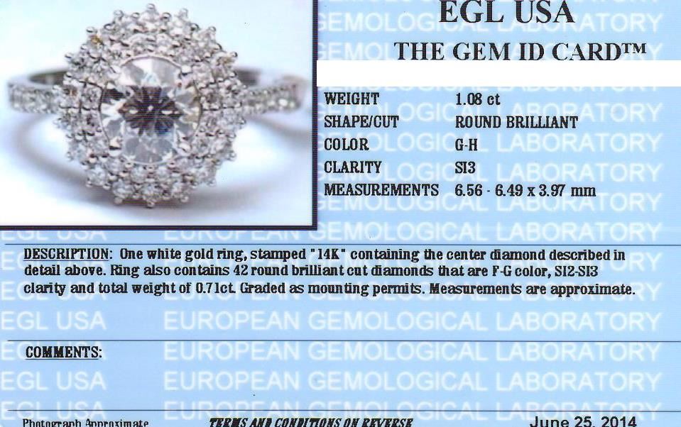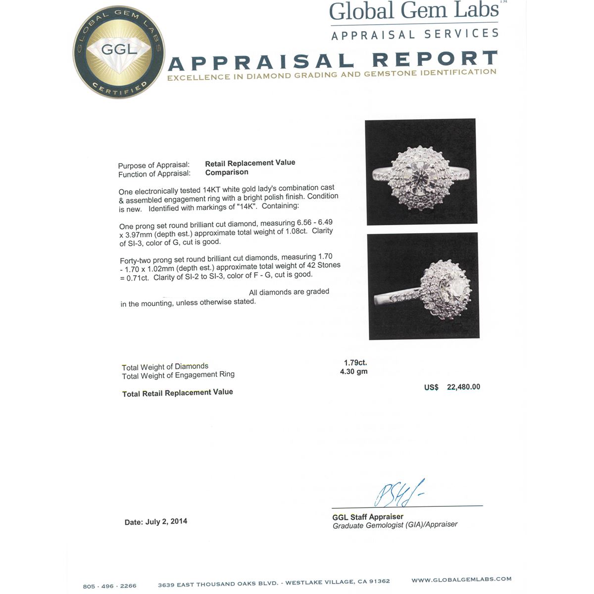 One electronically tested 14KT white gold Ladies combination cast & assembled engagement ring with a bright polish finish. Condition is new. Identified with markings of "14K". Containing: One prong set round brilliant cut diamond, measuring 6.56 - 6.49 x 3.97mm (depth est.) approximate. Total Weight of 1.08ct. Clarity: SI-3. Color: G, Cut is Good. Forty-Two prong set round brilliant cut diamonds, measuring 1.70 - 1.70 x 1.02mm (depth est.) approximate. Total Weight of 42 Stones = 0.71ct. Clarity: SI-2 to SI-3. Color: F - G, Cut is Good. EGL USA GEM ID# US 911348437D. All diamonds are graded in the mounting, unless otherwise stated. Total Weight of Diamonds 1.79ct. Total Weight of Engagement Ring 4.30 grams. GGL Appraised at $22,480.00.