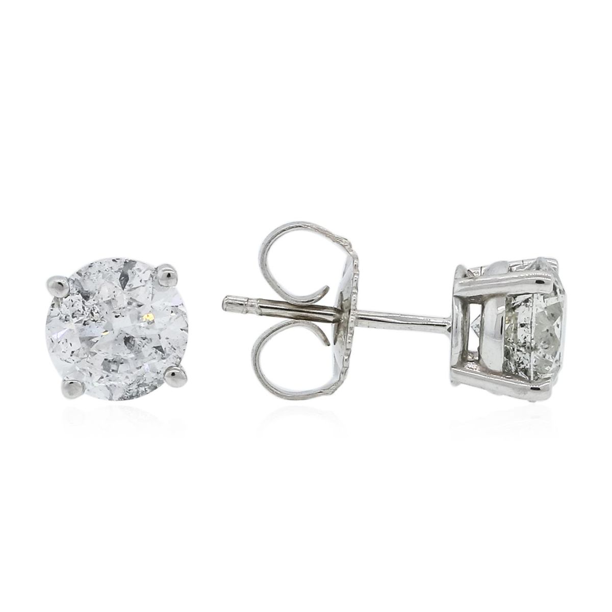 One pair electronically tested 14KT white gold ladies cast diamond stud earrings with friction posts with a bright polish finish. Identified with markings of "14K". Condition is new. Containing: One prong set round brilliant cut diamond, measuring 6.30 - 6.20 x 3.75mm (depth est.) approximate weight of 0.89ct. Clarity: I-3. Color: J, Cut is Good. One prong set round brilliant cut diamond, measuring 6.30 - 6.20 x 3.75mm (depth est.) approximate weight of 0.89ct. Clarity: I-3. Color: J, Cut is Good. All diamonds are graded in the mounting, unless otherwise stated. Total Weight of Diamonds 1.79ct. Total Weight of Earrings 1.70 grams. GGL Appraised at $4,230.00.