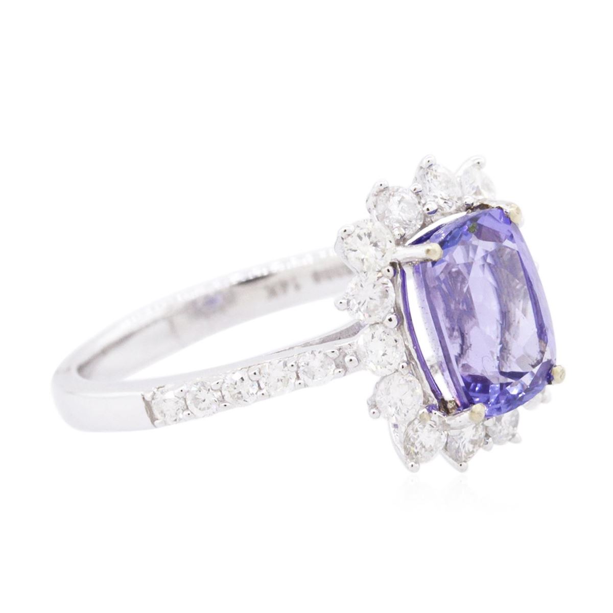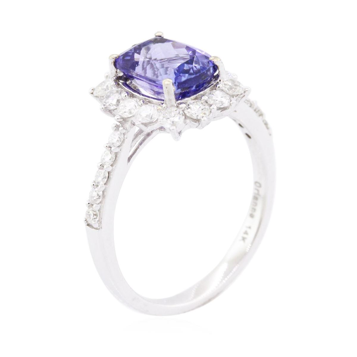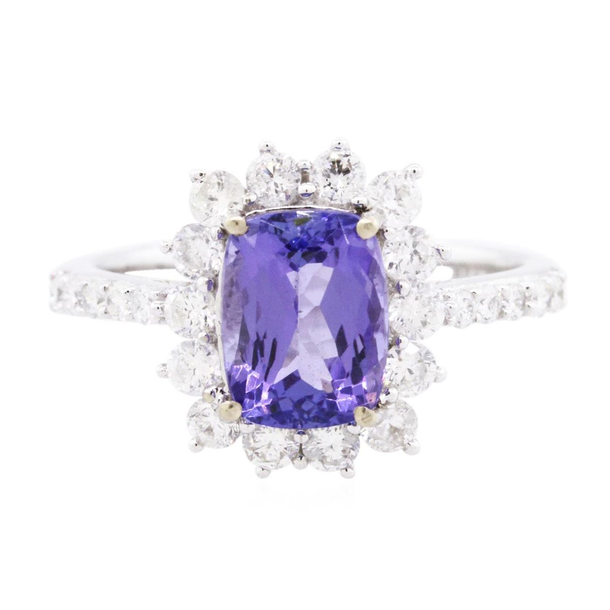 One electronically tested 14KT white gold ladies combination cast & assembled tanzanite and diamond ring with a flat shank with a bright polish finish. Identified with markings of "14K". Condition is new. Containing: One prong set rectangular cushion modified brilliant cut natural tanzanite, measuring 8.56 x 6.53 x 4.08mm, approximate weight of 1.80ct., clarity is eye clean, type I, medium light, moderately strong, violet color, (GIA V 4/4), cut is good. Twenty-Three prong set round brilliant cut diamonds, measuring 2.30 - 1.50 x 1.14mm (depth est.) approximate total weight of 23 Stones = 0.58ct. Clarity: SI-2 to I-2. Color: I - J, Cut is Good. Colored gemstones are presumed to have been subjected to commonly used enhancement processes. All diamonds and colored gemstones are graded in the mounting, unless otherwise stated. Total Weight of Colored Stones 1.80ct. Total Weight of Diamonds 0.58ct. Total Weight of Ring 3.30 grams. GGL Appraised at $4,920.00.