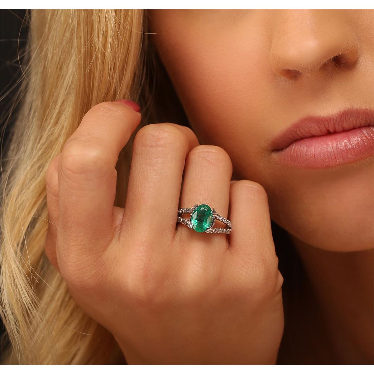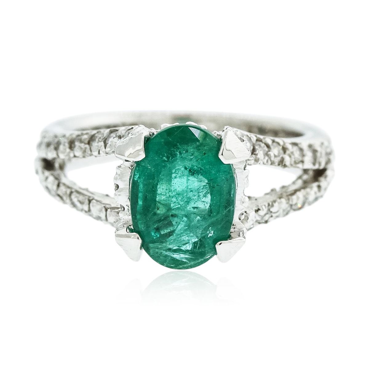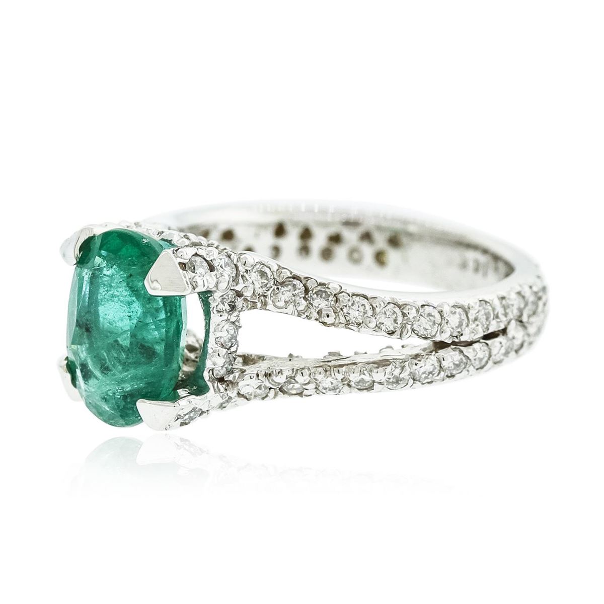One electronically tested 14KT white gold ladies cast emerald and diamond ring with a bright polish finish. Condition is new, good workmanship. The featured emerald is supported by diamond set split shoulders and completed by a three millimeter wide band. Identified with markings of "14K". Containing: One prong set oval mixed cut natural emerald, measuring 9.50 x 6.80 x 4.60mm, 8%. bulge factor, approximate weight of 1.80ct., clarity is heavily included, type III, medium dark, very slightly grayish, very slightly bluish green color, (GIA vslbG 6/3), cut is good. Transmitting light with a minimum of distortion, transparent to translucent. Naturally occurring internal & external characteristics are present. Indications of oil residue. Graded in the setting. Eighty-Four prong set round brilliant cut diamonds, measuring 1.50 - 1.50 x 0.90mm (depth est.) approximate. Total Weight of 84 Stones = 1.13ct. Graded in the setting. Clarity: SI-2 to I-1. Color: H - J. Total Weight of Colored Stones 1.80ct. Total Weight of Diamonds 1.13ct. Total Weight of Ring 4.80 grams. AIG Appraised at $7,115.00.