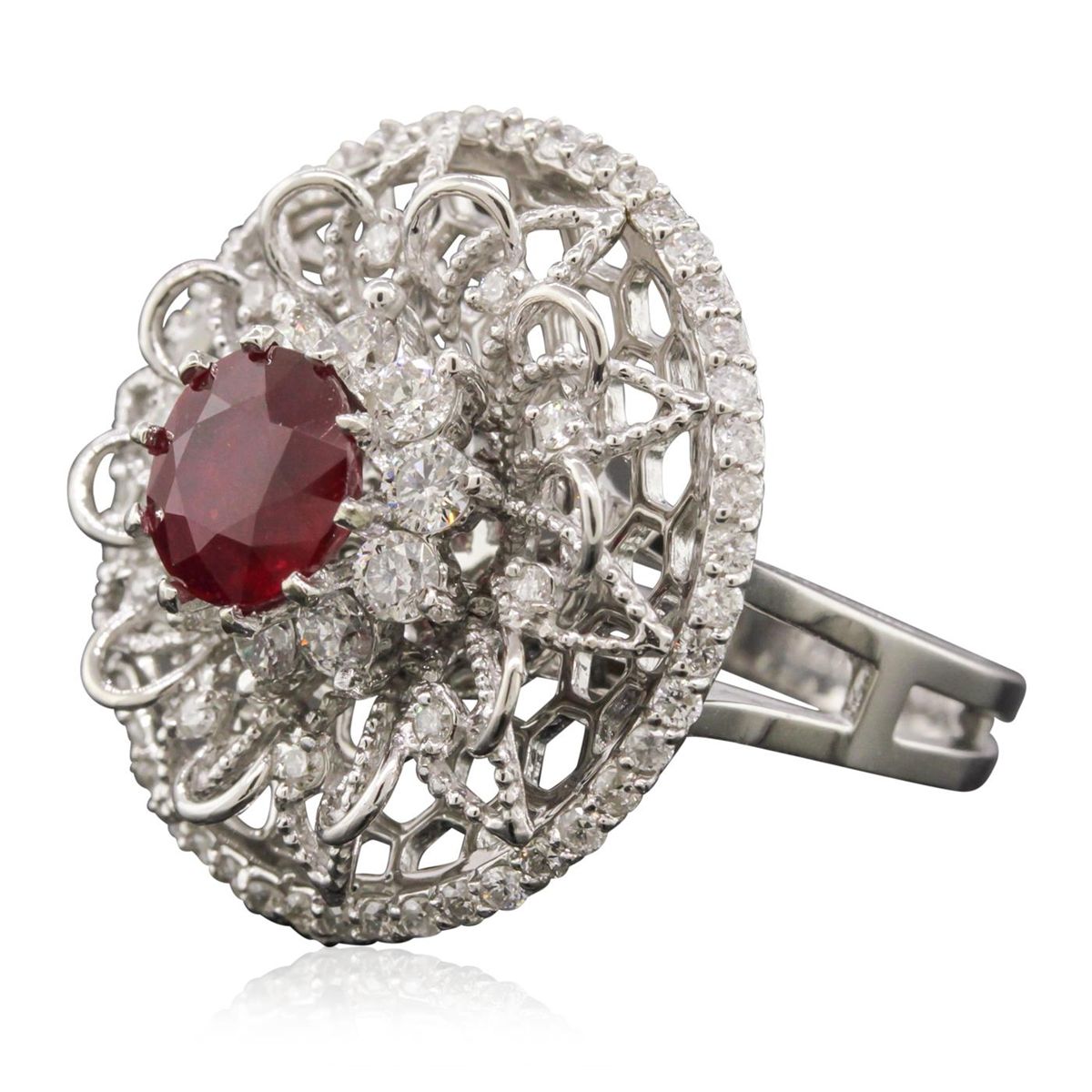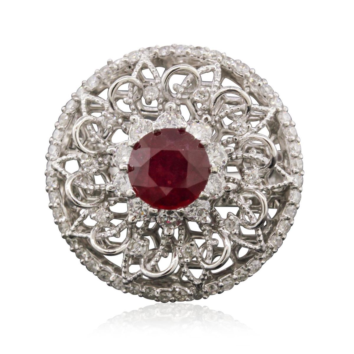 One electronically tested 14KT white gold ladies cast & assembled ruby & diamond ring with a bright & patterned finish. The featured ruby is set within an elaborate white gold lattice set throughout with diamonds, framed by a diamond bezel, supported by a honeycomb lattice under gallery, completed by a three millimeter wide band. Identified with markings of "585". Condition is new, good workmanship. Containing: One prong set round mixed cut natural ruby, measuring 7.15 - 7.14 x 4.00. mm, 10%. bulge factor, approximate weight of 1.80ct., clarity is heavily included, type II, dark, slightly brownish, red color, (GIA R 7/2), cut is good. Transmitting light somewhat diffusely, transparent to translucent. Naturally occurring internal & external characteristics are present. Indications of laboratory high temperature heat treatment, with glass & flux additives. Graded in the setting. Ruby has a low tolerance to rhodium plating, repolishing the surface, & ultrasonic cleaning. Ten prong set round brilliant cut diamonds, measuring 2.55 - 2.50 x 1.54mm (depth est.) approximate total weight of 10 Stones = 0.60ct. Graded in the setting. Clarity: SI-1 to I-1 . Color: G - I Fifty-Eight prong set round brilliant cut diamonds, measuring 1.40 - 1.35 x 0.84mm (depth est.) approximate total weight of 58 Stones = 0.56ct. Graded in the setting. Clarity: SI-2 to I-1 . Color: G - I. Total Weight of Colored Stones 1.80ct. Total Weight of Diamonds 1.16ct. Total Weight of Ring 9.18 grams. AIG Appraised at $3,700.00.