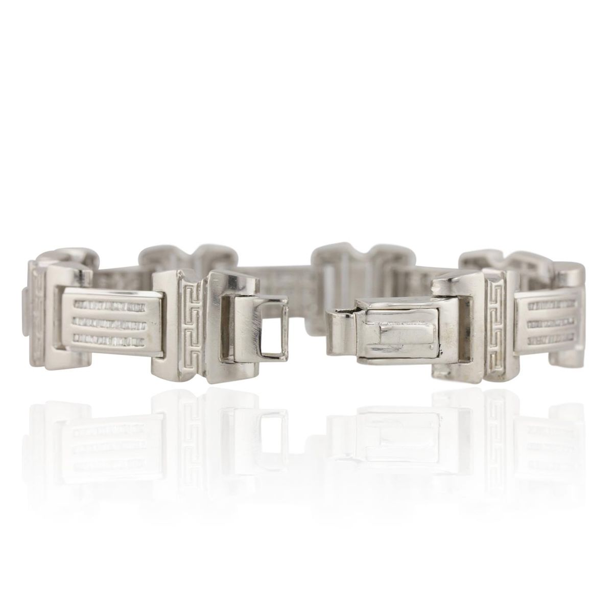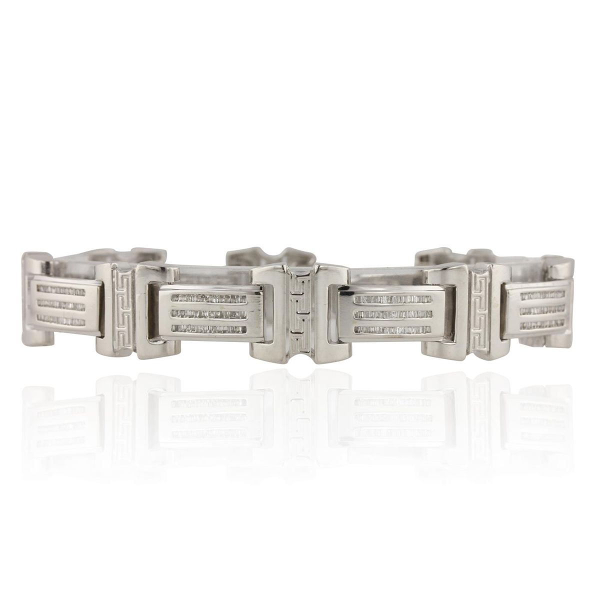 One electronically tested 14KT white gold cast & assembled diamond bracelet with a bright polish finish. Condition is good. Nine inch length bracelet features a fifteen millimeter wide series of diamond ribbon links interspersed by greek key accented links, terminating in a concealed clasp. Identified with markings of "14K". Containing: Three hundred fifteen channel set baguette cut (tapered) diamonds, measuring from 1.20 x 0.80 x 0.56mm (depth est.) to 1.30 x 0.90 x 0.63mm (depth est.) approximate total weight of 315 Stones = 1.80ct. Faint brown secondary. Color throughout. Graded in the setting. Clarity SI-1 to I-1. Color I - K. Total Weight of Diamonds 1.80ct. Total Weight of Bracelet 54.23gm. AIG Appraised at $16,485.00.