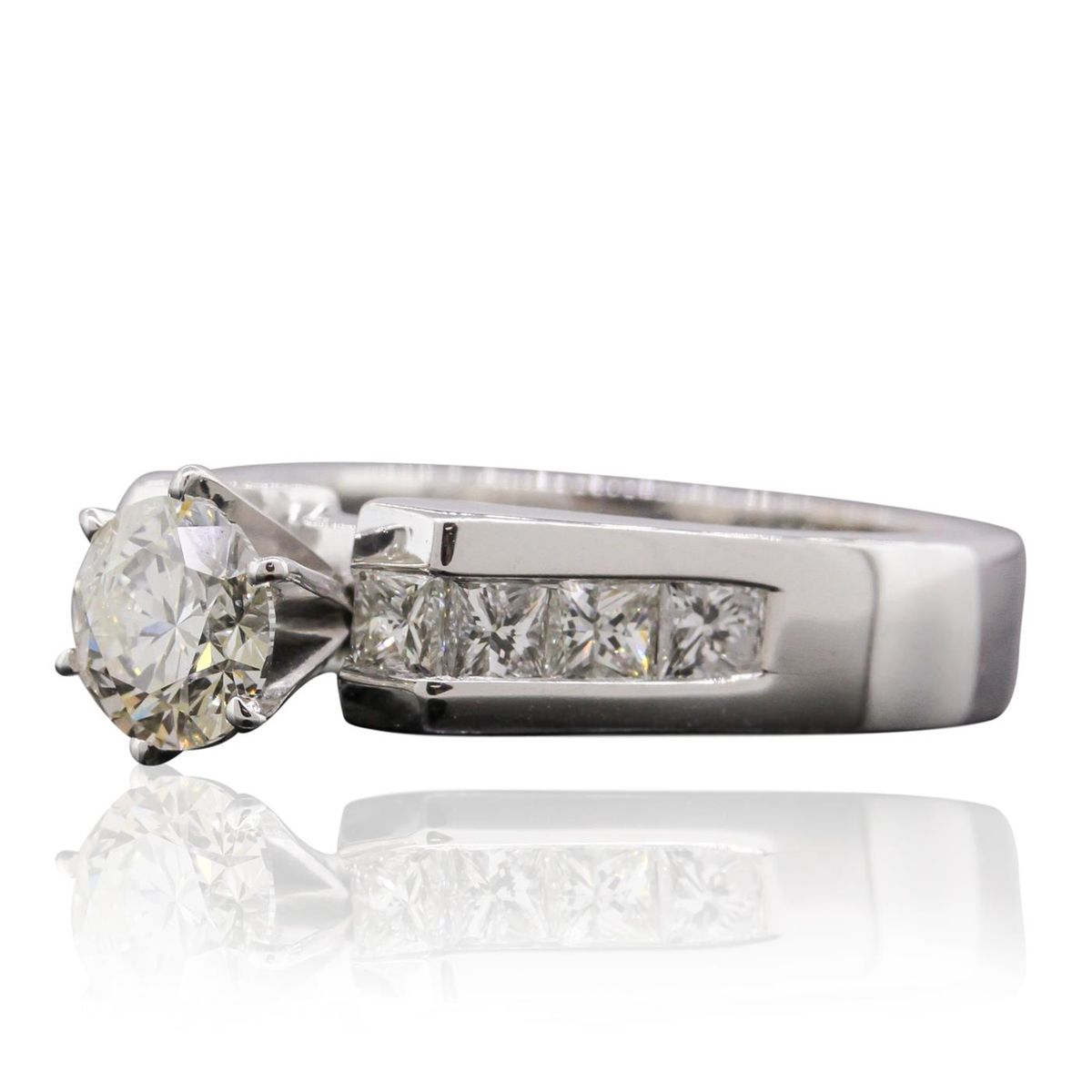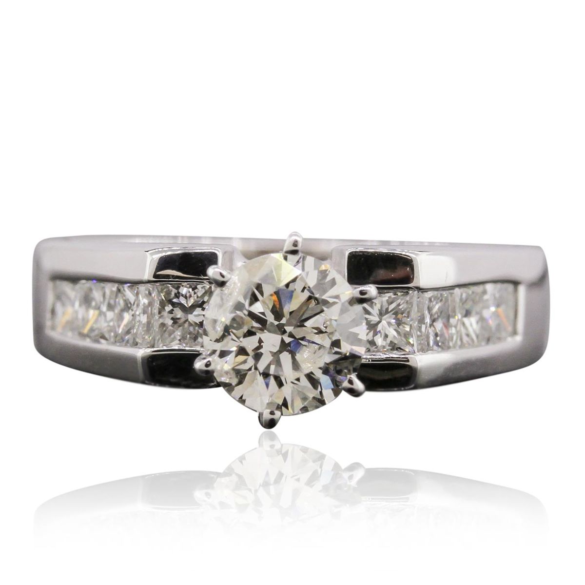 One electronically tested 14KT white gold ladies cast & assembled diamond unity ring with a bright polish finish. Condition is new, good workmanship. The featured diamond is supported by diamond set shoulders and completed by a four millimeter wide band. Identified with markings of "14K". Containing: One prong set round brilliant cut diamond, measuring 6.00 - 6.00 x 3.60mm (depth est.) approximate weight of 0.89ct with a strong blue fluorescence. Graded in the setting. Clarity: I-1 . Color: 60.0%. Table 56.7%. Eight invisible set princess cut diamonds, measuring 3.10 x 2.50 x 1.88mm (depth est.) approximate. Total Weight of 8 Stones = 0.91ct. Measurements are an average for the group. Graded in the setting. Clarity: VS-2 to SI-2 . Color: G - I. Total Weight of Diamonds 1.80ct.. Total Weight of Ring 6.80 grams. AIG Appraised at $9,100.00.