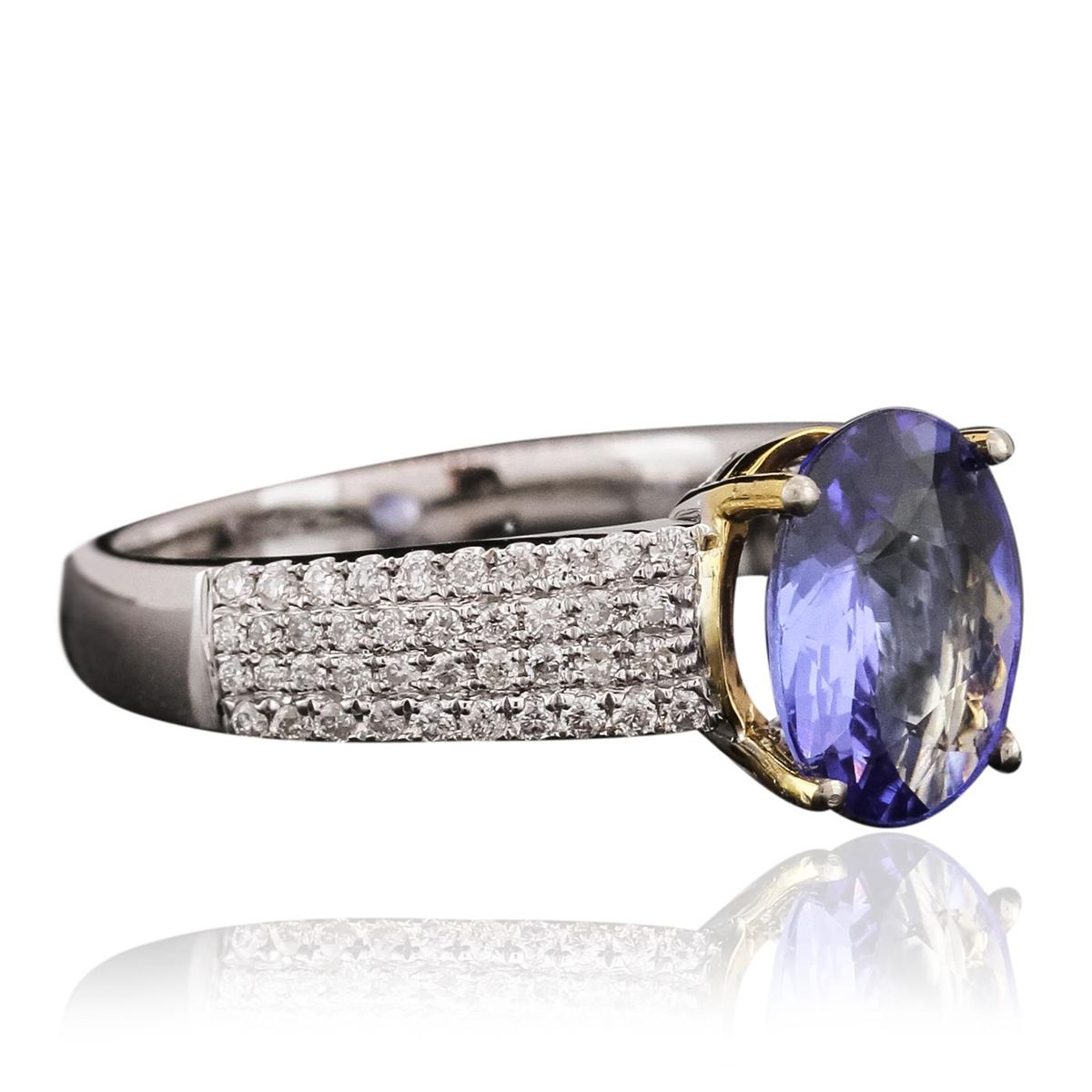 One electronically tested 14KT white gold ladies cast tanzanite and diamond ring. The featured tanzanite is supported by diamond set shoulders, completed by a two and one-half millimeter wide band. Bright polish finish with yellow gold accents. Identified with markings of "14K". Condition is new, good workmanship. Containing: One prong set oval brilliant cut natural tanzanite, measuring 9.60 x 7.45 x 3.50mm, 6% bulge factor, approximate weight of 1.81ct., clarity is eye clean, type I, medium dark, very slightly grayish, bluish violet color, (GIA bV 6/3), cut is good. Transmitting light with no distortion, transparent. Graded in the setting. Tanzanite is a very rare gemstone that is only found in the country of Tanzania. Originally discovered in 1967. Tiffany & Company, named the stone Tanzanite. It is found in the Usumburu Mountains that border the Umba Valley of northern Tanzania. Tanzanite occurs in gray, brown, violet, blue, reddish-purple, & green. The gem is interesting because of its exceptional pleochroism. Rotated in different directions a tanzanite will exhibit multiple changes of color. Tanzanite has a low tolerance to ultrasonic cleaning, and should not be cleaned using this method. Eighty prong set round brilliant cut diamonds, measuring 1.20 - 1.10 x 0.69mm (depth est.) approximate total weight of 80 Stones = 0.54ct. Graded in the setting. Clarity: SI-1 to I-1. Color: G - I. Total Weight of Colored Stones 1.81ct. Total Weight of Diamonds 0.54ct. Total Weight of Ring 3.98 grams. AIG Appraised at $6,225.00.