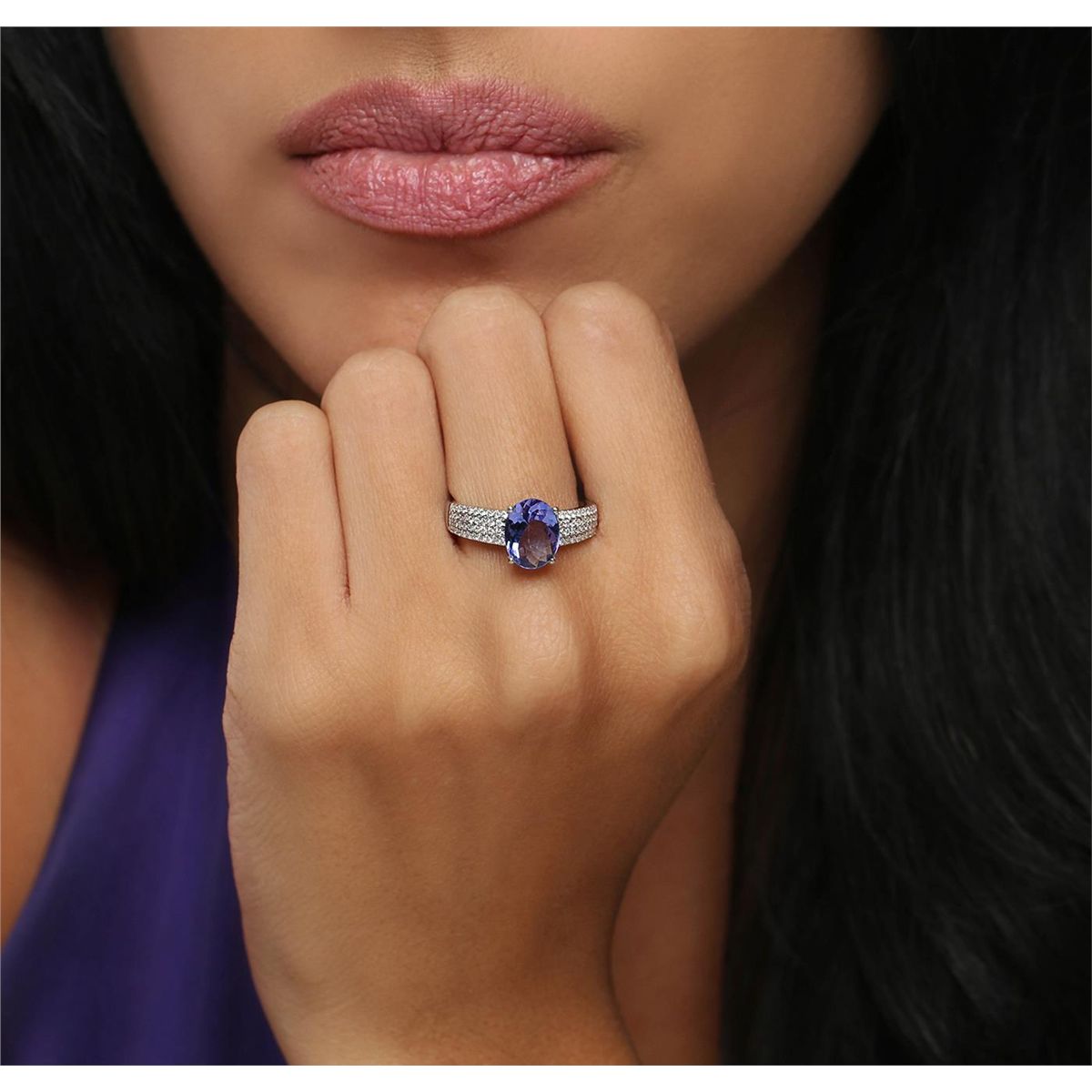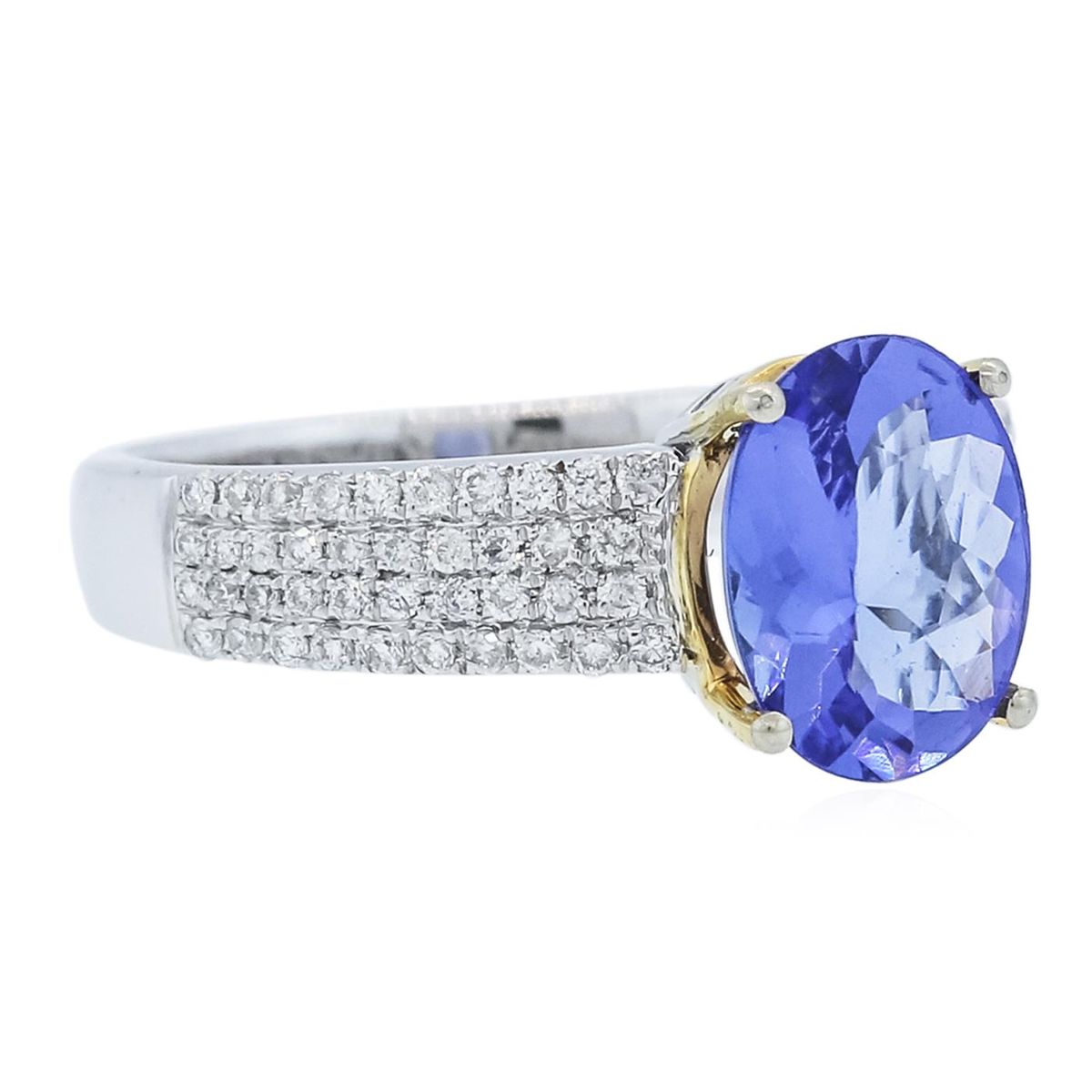 One electronically tested 14KT white gold ladies cast tanzanite and diamond ring. The featured tanzanite is supported by diamond set shoulders, completed by a two and one-half millimeter wide band. Bright polish finish with yellow gold accents. Identified with markings of "14K". Condition is new, good workmanship. Containing: One prong set oval brilliant cut natural tanzanite, measuring 9.60 x 7.45 x 3.50mm, 6% bulge factor, approximate weight of 1.81ct., clarity is eye clean, type I, medium dark, very slightly grayish, bluish violet color, (GIA bV 6/3), cut is good. Transmitting light with no distortion, transparent. Graded in the setting. Tanzanite is a very rare gemstone that is only found in the country of Tanzania. Originally discovered in 1967. Tiffany & Company, named the stone Tanzanite. It is found in the Usumburu Mountains that border the Umba Valley of northern Tanzania. Tanzanite occurs in gray, brown, violet, blue, reddish-purple, & green. The gem is interesting because of its exceptional pleochroism. Rotated in different directions a tanzanite will exhibit multiple changes of color. Tanzanite has a low tolerance to ultrasonic cleaning, and should not be cleaned using this method. Eighty prong set round brilliant cut diamonds, measuring 1.20 - 1.10 x 0.69mm (depth est.) approximate total weight of 80 Stones = 0.54ct. Graded in the setting. Clarity: SI-1 to I-1. Color: G - I. Total Weight of Colored Stones 1.81ct. Total Weight of Diamonds 0.54ct. Total Weight of Ring 3.98 grams. AIG Appraised at $6,225.00.