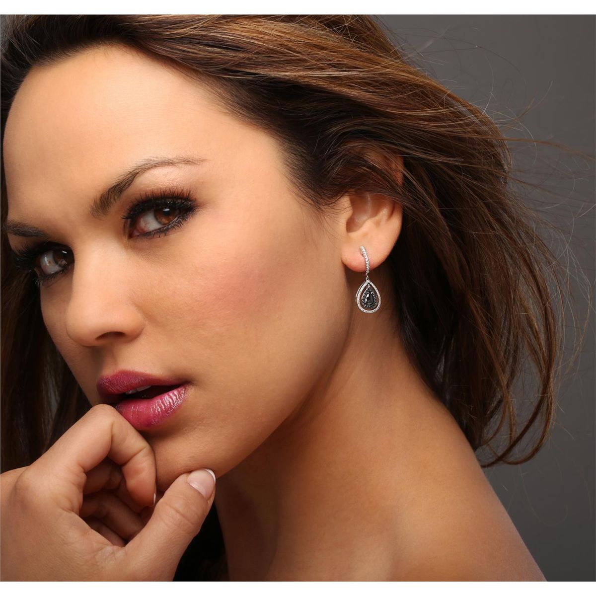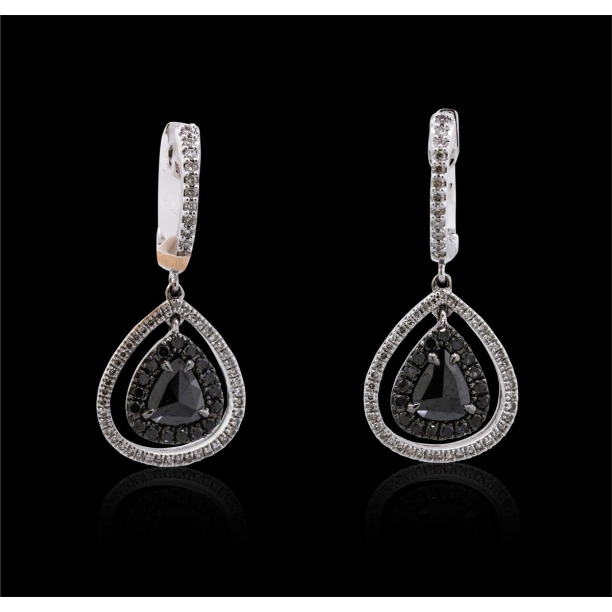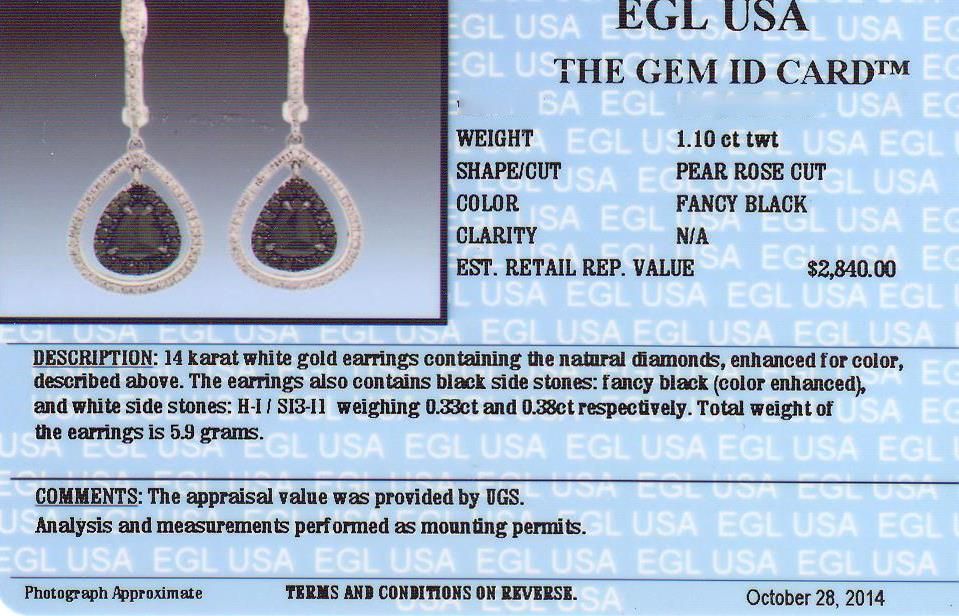 One pair of 14KT white gold earrings containing two natural pear rose cut fancy black diamonds, enhanced for color, with a total weight of 1.10ct. The earrings also contain black side stones: fancy black (color enhanced), and white side stone: H-I / SI3-I1 weighing 0.33ct and 0.38ct respectively. Total weight of the earrings is 5.90 grams. EGL Appraised at $2,840.00.