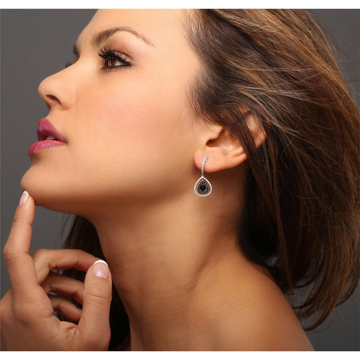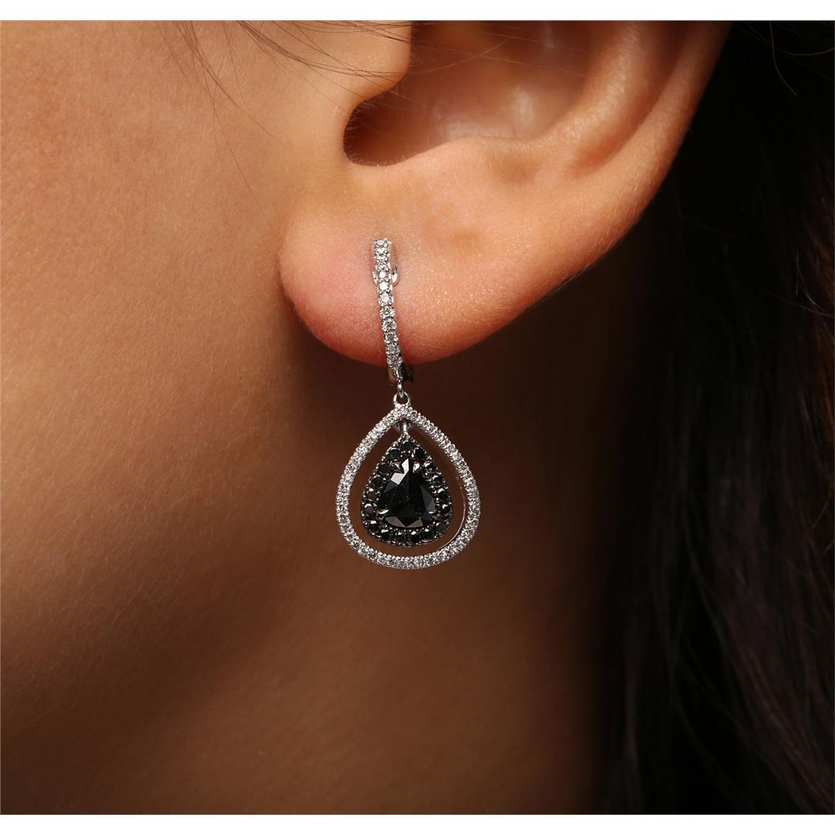 One pair of 14KT white gold earrings containing two natural pear rose cut fancy black diamonds, enhanced for color, with a total weight of 1.10ct. The earrings also contain black side stones: fancy black (color enhanced), and white side stone: H-I / SI3-I1 weighing 0.33ct and 0.38ct respectively. Total weight of the earrings is 5.90 grams. EGL Appraised at $2,840.00.