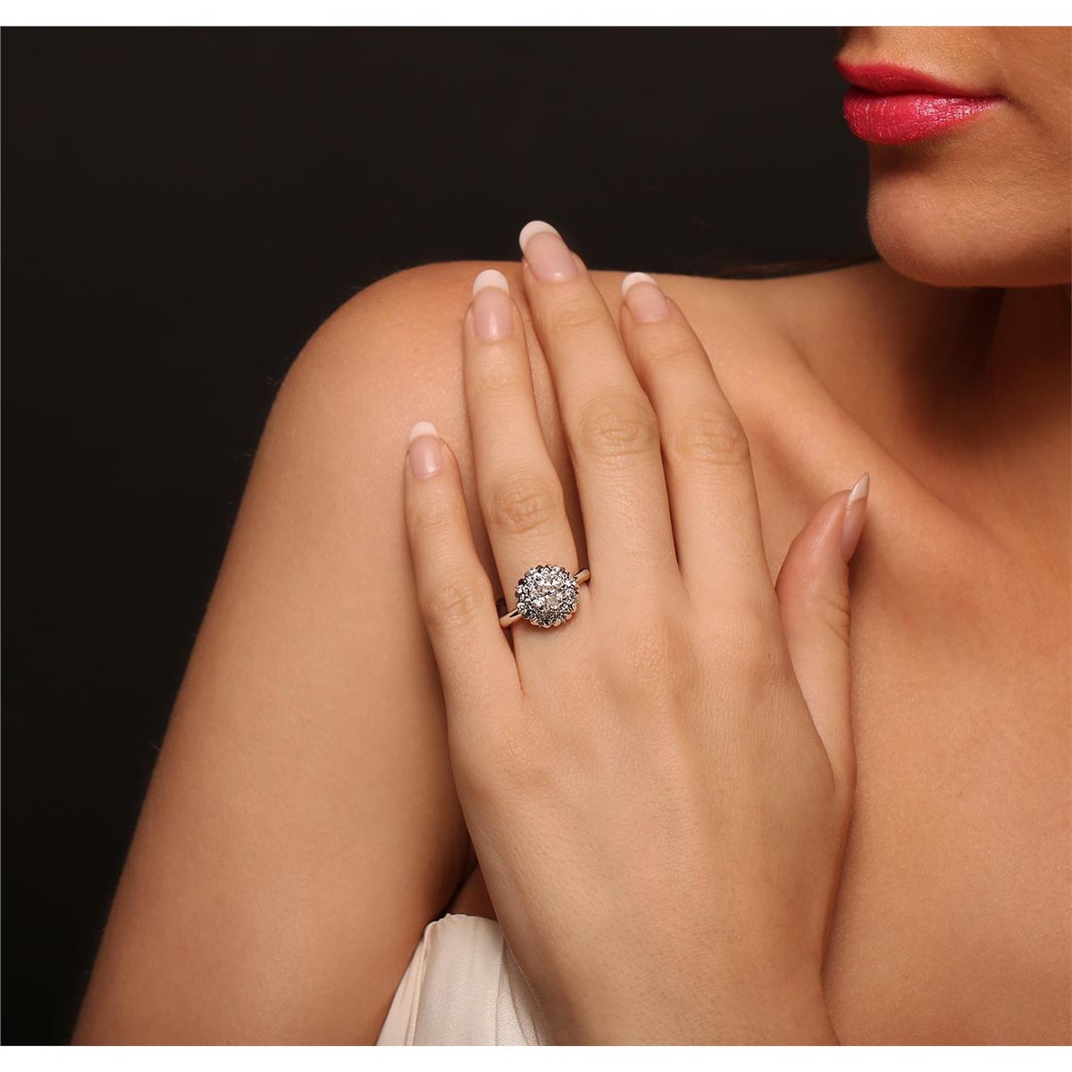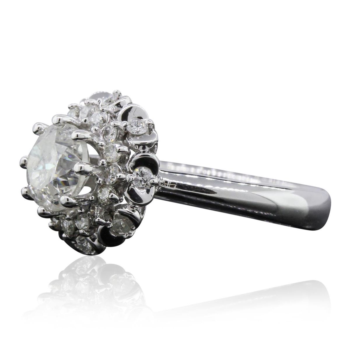 One electronically tested 14KT white gold ladies cast diamond ring with a bright polish finish. Condition is new, good workmanship. The featured diamond is set within tiered diamond bezels tapering shoulders, completed by a three millimeter wide band. Identified with markings of "K14". Containing: One prong set round brilliant cut diamond, measuring 6.70 - 6.60 x 4.50mm (depth est.), 10.00.%. GTCF approximate weight of 1.43ct. Graded in the setting. Clarity: I-2. Color: JDepth 67.7%. Table 63.2%. Twenty-Four prong set round brilliant cut diamonds, measuring 1.70 - 1.60 x 0.99mm (depth est.) approximate. Total Weight of 24 Stones = 0.38ct. Graded in the setting. Clarity: SI-1 to I-1. Color: H - J. Total Weight of Diamonds 1.81ct. Total Weight of Ring 5.12 grams. AIG Appraised at $13,245.00.