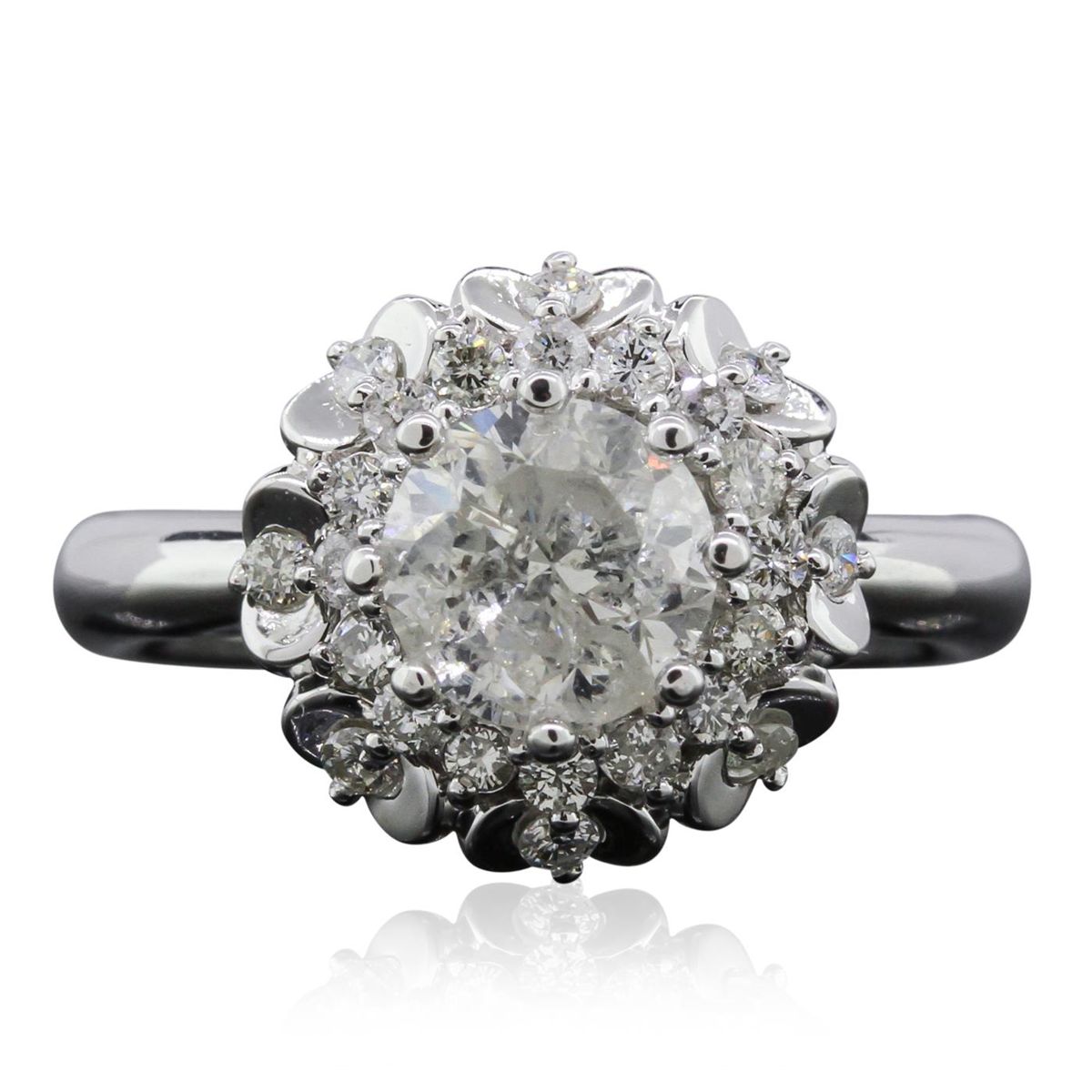 One electronically tested 14KT white gold ladies cast diamond ring with a bright polish finish. Condition is new, good workmanship. The featured diamond is set within tiered diamond bezels tapering shoulders, completed by a three millimeter wide band. Identified with markings of "K14". Containing: One prong set round brilliant cut diamond, measuring 6.70 - 6.60 x 4.50mm (depth est.), 10.00.%. GTCF approximate weight of 1.43ct. Graded in the setting. Clarity: I-2. Color: JDepth 67.7%. Table 63.2%. Twenty-Four prong set round brilliant cut diamonds, measuring 1.70 - 1.60 x 0.99mm (depth est.) approximate. Total Weight of 24 Stones = 0.38ct. Graded in the setting. Clarity: SI-1 to I-1. Color: H - J. Total Weight of Diamonds 1.81ct. Total Weight of Ring 5.12 grams. AIG Appraised at $13,245.00.