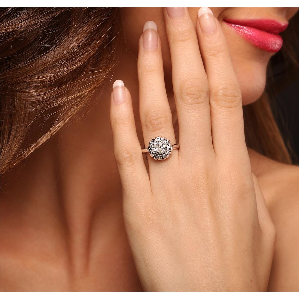 One electronically tested 14KT white gold ladies cast diamond ring with a bright polish finish. Condition is new, good workmanship. The featured diamond is set within tiered diamond bezels tapering shoulders, completed by a three millimeter wide band. Identified with markings of "K14". Containing: One prong set round brilliant cut diamond, measuring 6.70 - 6.60 x 4.50mm (depth est.), 10.00.%. GTCF approximate weight of 1.43ct. Graded in the setting. Clarity: I-2. Color: JDepth 67.7%. Table 63.2%. Twenty-Four prong set round brilliant cut diamonds, measuring 1.70 - 1.60 x 0.99mm (depth est.) approximate. Total Weight of 24 Stones = 0.38ct. Graded in the setting. Clarity: SI-1 to I-1. Color: H - J. Total Weight of Diamonds 1.81ct. Total Weight of Ring 5.12 grams. AIG Appraised at $13,245.00.