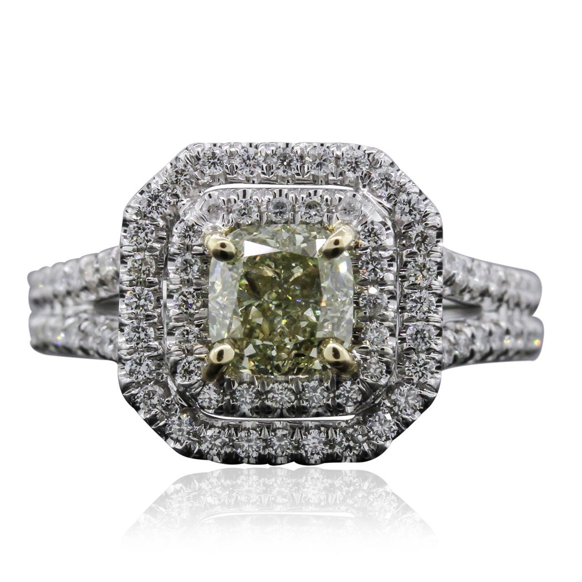 One electronically tested 14KT white gold ladies cast diamond unity ring. Condition is new, good workmanship. The featured diamond is set within two tiered diamond bezels supported by a diamond set under gallery and diamond set split shoulders, completed by a grooved three millimeter wide band. Bright polish finish with yellow gold accents. Identified with markings of "14K". Containing: One prong set cushion cut diamond, measuring 5.55 x 5.25 x 4.00mm (depth est.), 5.00% GTCF approximate weight of 1.22ct. Graded in the setting. Clarity SI-2 Depth 76.2%Table 61.0% One Hundred Eighteen prong set round brilliant cut diamonds, measuring 1.10 - 1.00 x 0.63mm (depth est.) approximate total weight of 118 Stones = 0.59ct. Graded in the setting. Clarity VS-2 to SI-2 Color G - I Total Weight of Diamonds 1.81ct. Total Weight of Ring 5.89 grams. AIG Appraised at $12,415.00.