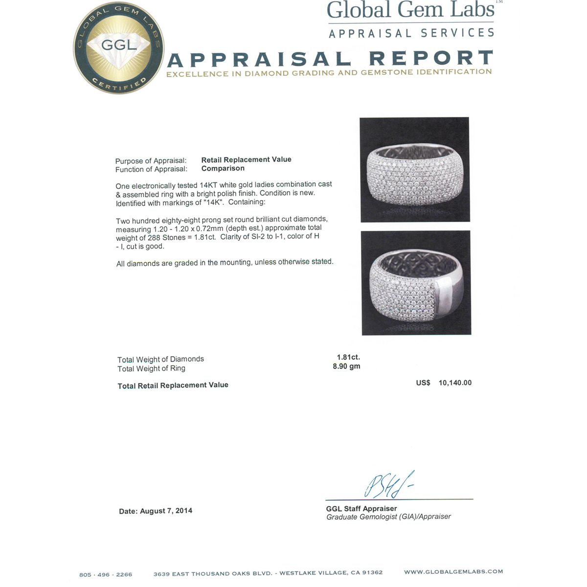 One electronically tested 14KT white gold ladies combination cast & assembled ring with a bright polish finish. Identified with markings of "14K". Condition is new. Containing: Two Hundred Eighty-Eight prong set round brilliant cut diamonds, measuring 1.20 - 1.20 x 0.72mm (depth est.) approximate total weight of 288 Stones = 1.81ct. Clarity: SI-2 to I-1. Color: H - I, Cut is Good. All diamonds are graded in the mounting, unless otherwise stated. Total Weight of Diamonds 1.81ct. Total Weight of Ring 8.90 grams. GGL Appraised at $10,140.00.