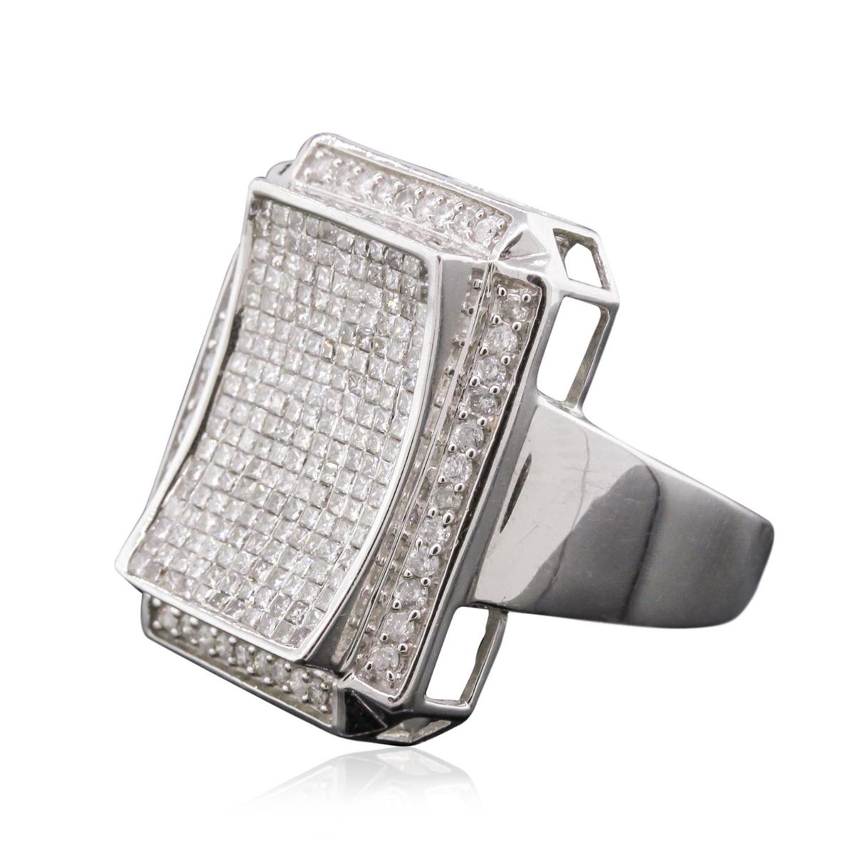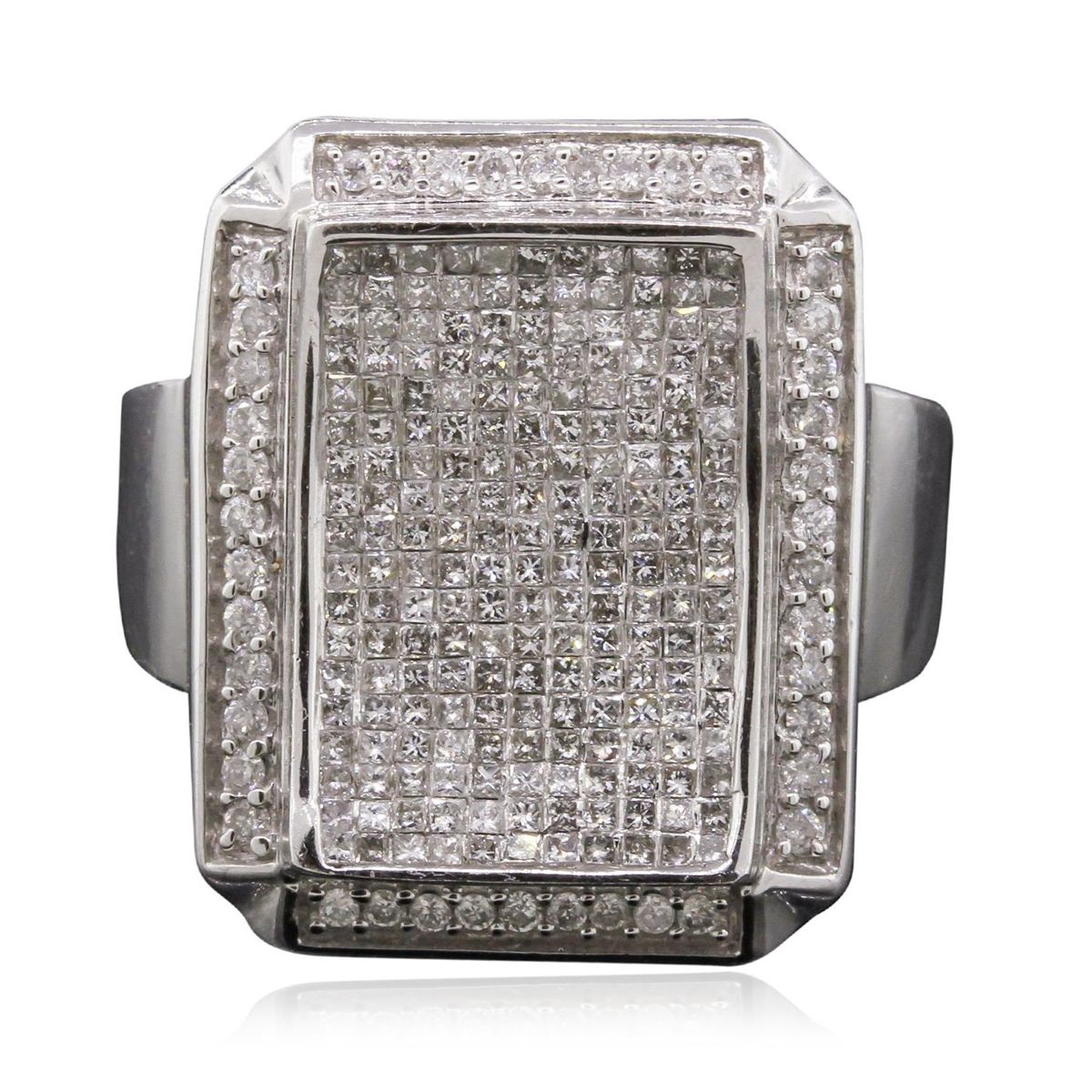 One electronically tested 14KT white gold man's combination cast & assembled ring with a bright polish finish. Condition is new. Identified with markings of "14K". Containing: One Hundred Eighty pave' set princess cut diamonds, measuring 1.10 x 1.10 x 0.83mm (depth est.) approximate. Total Weight of 180 Stones = 1.48ct. Clarity: I-1 to I-2. Color: H - I, Cut is Good. Forty-Two prong set round brilliant cut diamonds, measuring 1.30 - 1.30 x 0.78mm (depth est.) approximate. Total Weight of 42 Stones = 0.34ct. Clarity: I-1 to I-2. Color: H - I, Cut is Good. Total Weight of Diamonds 1.81ct. Total Weight of Ring 12.40gm. GGL Appraised at $8,595.00.