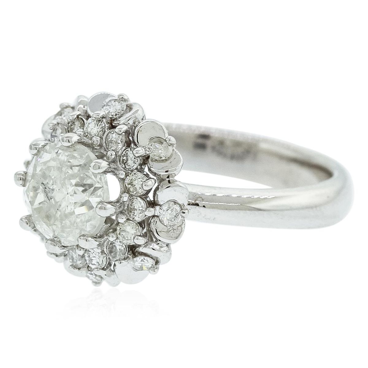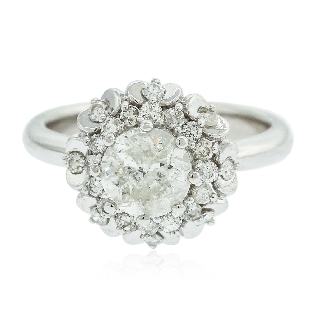One electronically tested 14KT white gold ladies cast diamond ring with a bright polish finish. Condition is new, good workmanship. The featured diamond is set within tiered diamond bezels tapering shoulders, completed by a three millimeter wide band. Identified with markings of "K14". Containing: One prong set round brilliant cut diamond, measuring 6.70 - 6.60 x 4.50mm (depth est.), 10.00.%. GTCF approximate weight of 1.43ct. Graded in the setting. Clarity: I-2. Color: JDepth 67.7%. Table 63.2%. Twenty-Four prong set round brilliant cut diamonds, measuring 1.70 - 1.60 x 0.99mm (depth est.) approximate. Total Weight of 24 Stones = 0.38ct. Graded in the setting. Clarity: SI-1 to I-1. Color: H - J. Total Weight of Diamonds 1.81ct. Total Weight of Ring 5.12 grams. AIG Appraised at $13,245.00.
