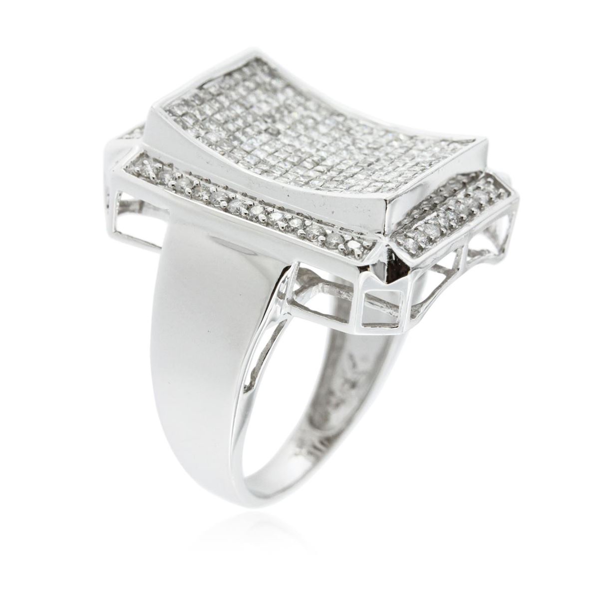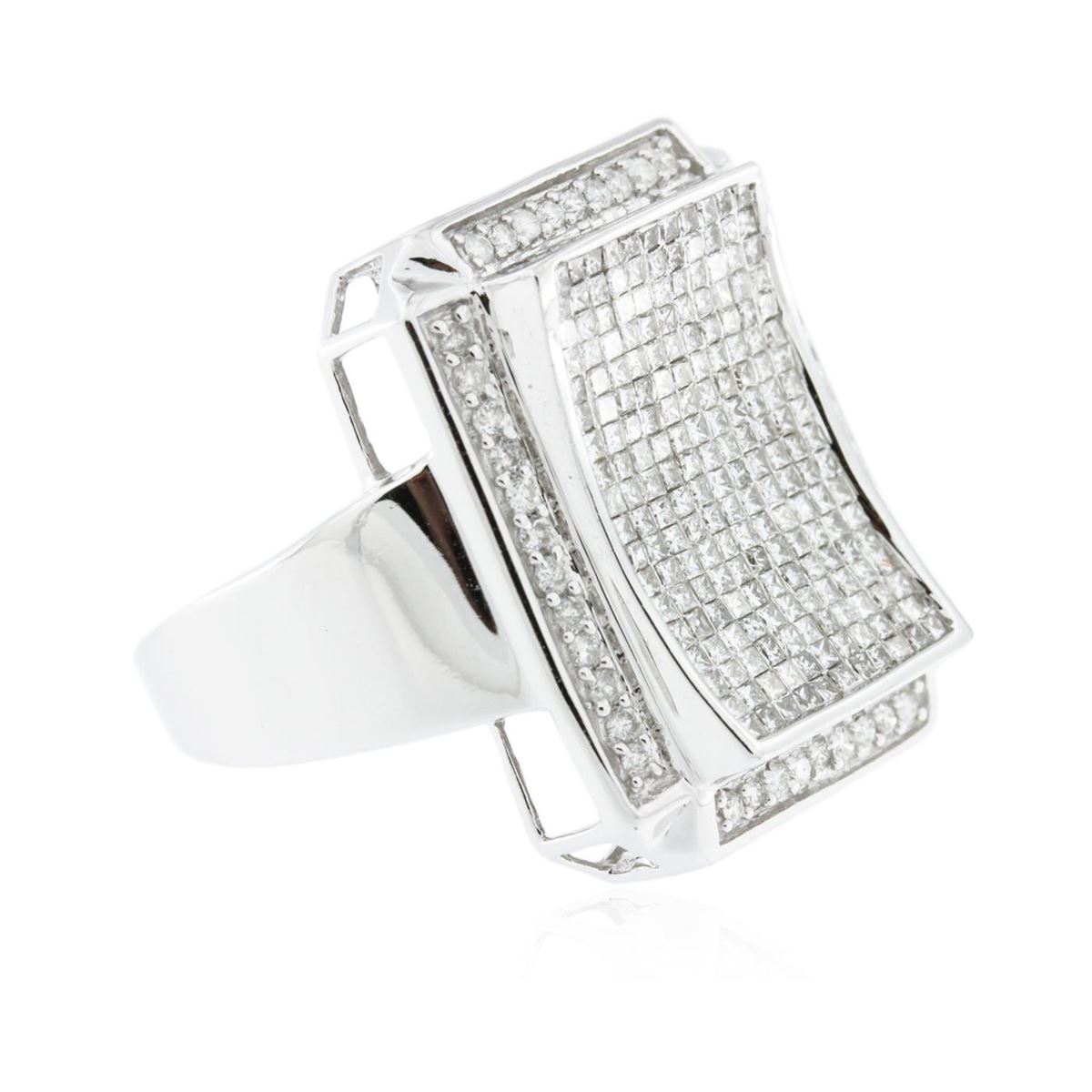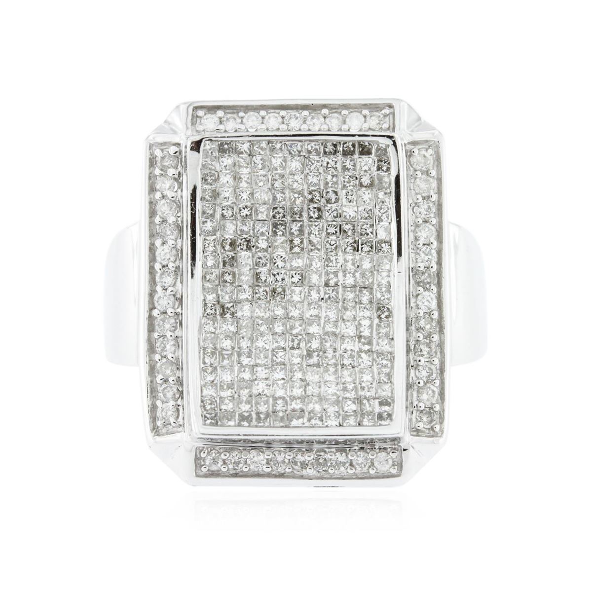 One electronically tested 14KT white gold man's combination cast & assembled ring with a bright polish finish. Condition is new. Identified with markings of "14K". Containing: One Hundred Eighty pave' set princess cut diamonds, measuring 1.10 x 1.10 x 0.83mm (depth est.) approximate. Total Weight of 180 Stones = 1.48ct. Clarity: I-1 to I-2. Color: H - I, Cut is Good. Forty-Two prong set round brilliant cut diamonds, measuring 1.30 - 1.30 x 0.78mm (depth est.) approximate. Total Weight of 42 Stones = 0.34ct. Clarity: I-1 to I-2. Color: H - I, Cut is Good. Total Weight of Diamonds 1.81ct. Total Weight of Ring 12.40gm. GGL Appraised at $8,595.00.