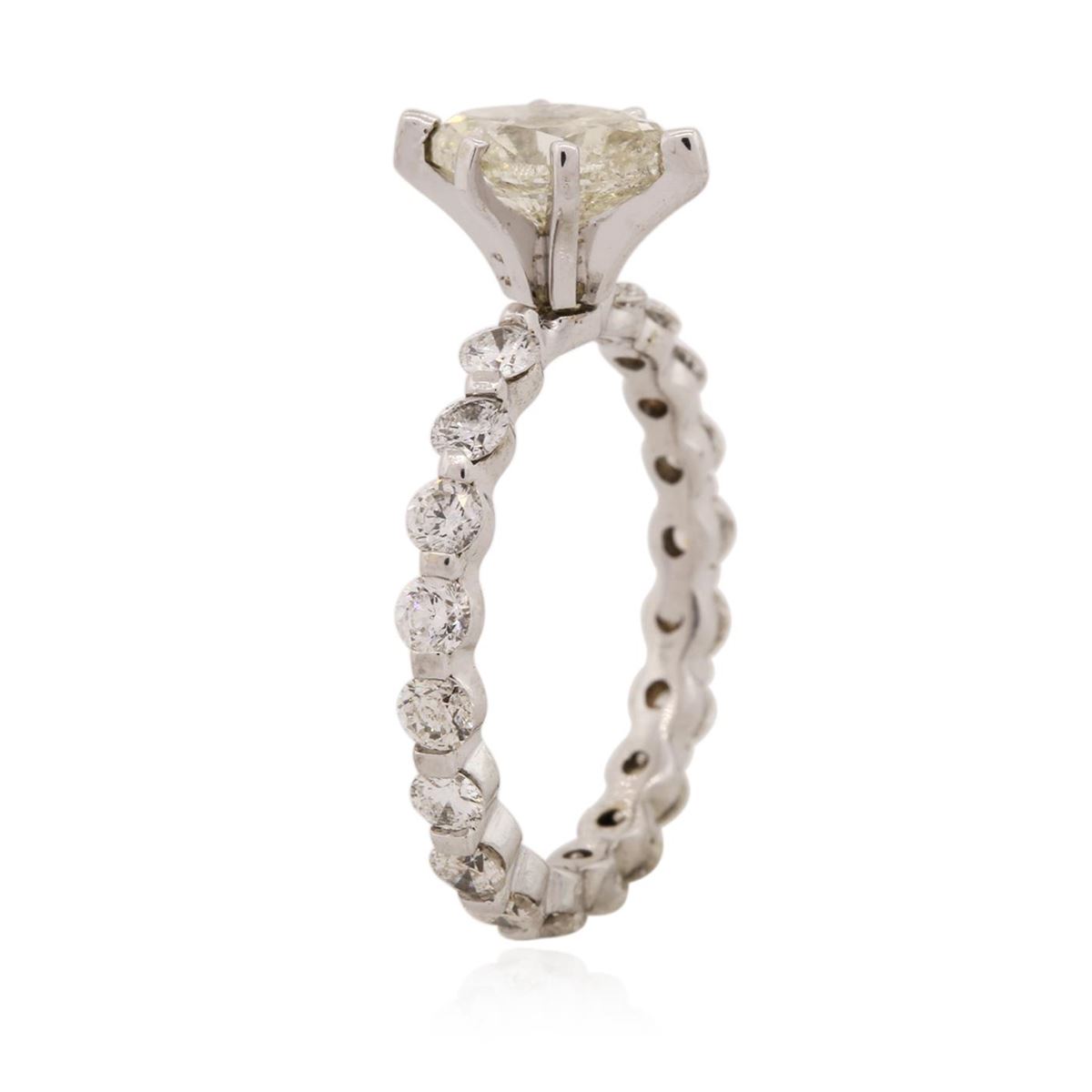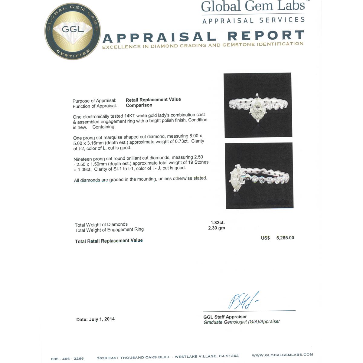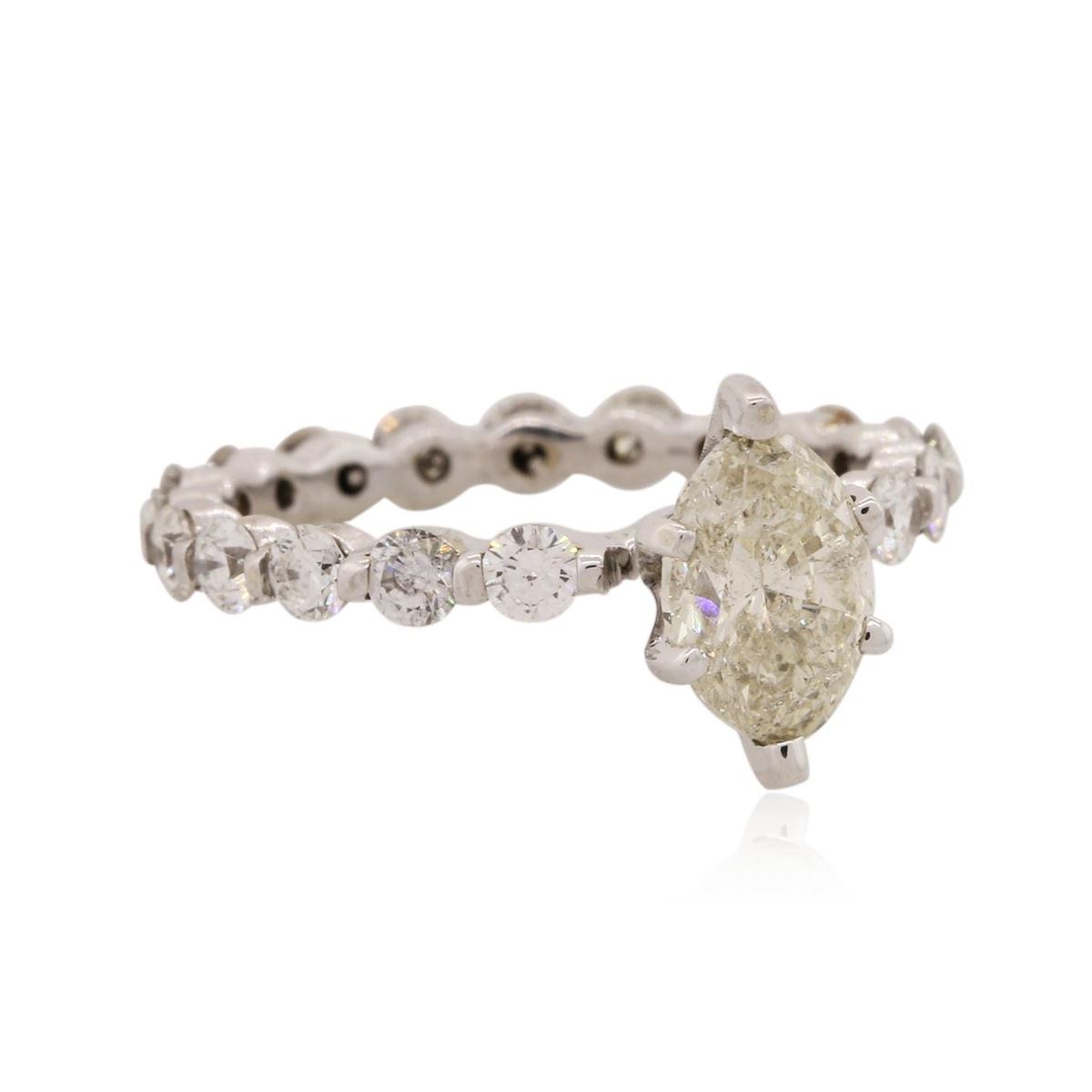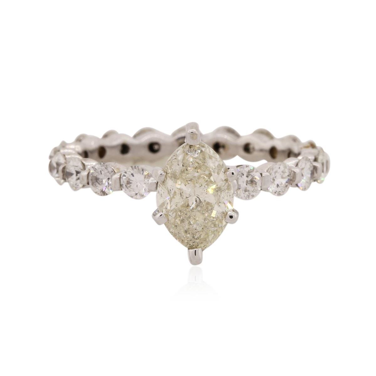 One electronically tested 14KT white gold Ladies combination cast & assembled engagement ring with a bright polish finish. Condition is new. Containing: One prong set marquise shaped cut diamond, measuring 8.00 x 5.00 x 3.16mm (depth est.) approximate weight of 0.73ct. Clarity: I-2. Color: L, Cut is Good. Nineteen prong set round brilliant cut diamonds, measuring 2.50 - 2.50 x 1.50mm (depth est.) approximate total weight of 19 Stones = 1.09ct. Clarity: SI-1 to I-1. Color: I - J, Cut is Good. All diamonds are graded in the mounting, unless otherwise stated. Total Weight of Diamonds 1.82ct. Total Weight of Engagement Ring 2.30 grams. GGL Appraised at $5,265.00.