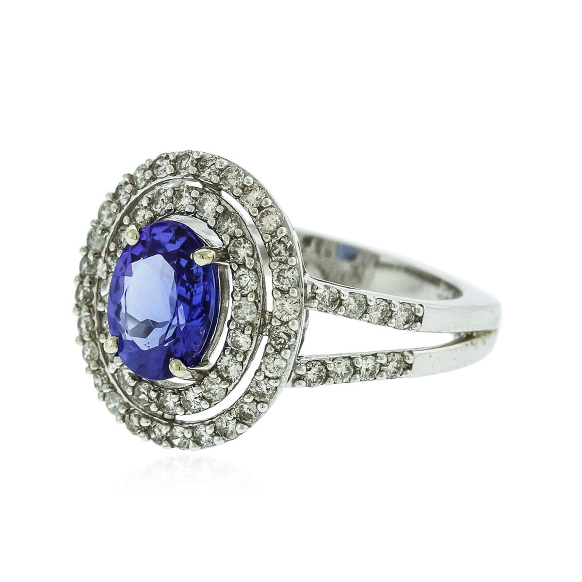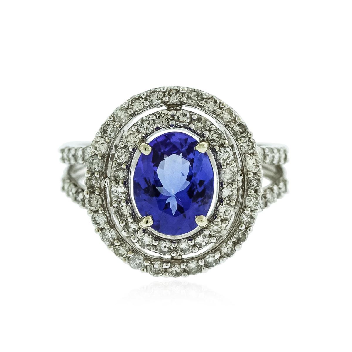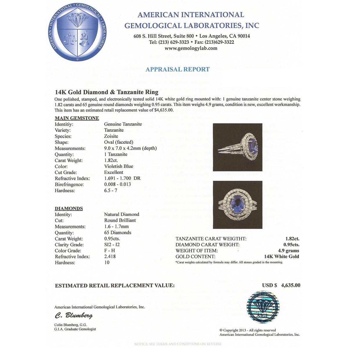One polished, stamped, and electronically tested solid 14KT White Gold ring mounted with: 1 genuine tanzanite center stone weighing 1.82 carats and 65 genuine round diamonds weighing 0.95 carats. This item weighs 4.9 grams, condition is new, excellent workmanship. AIGL Appraised at $4,635.00.